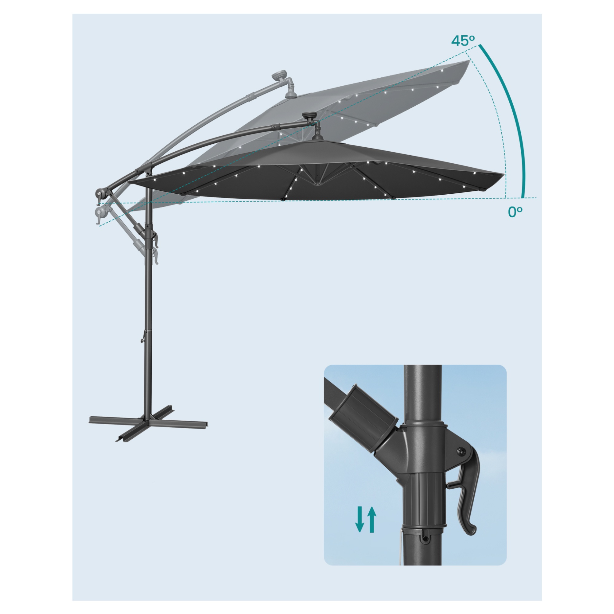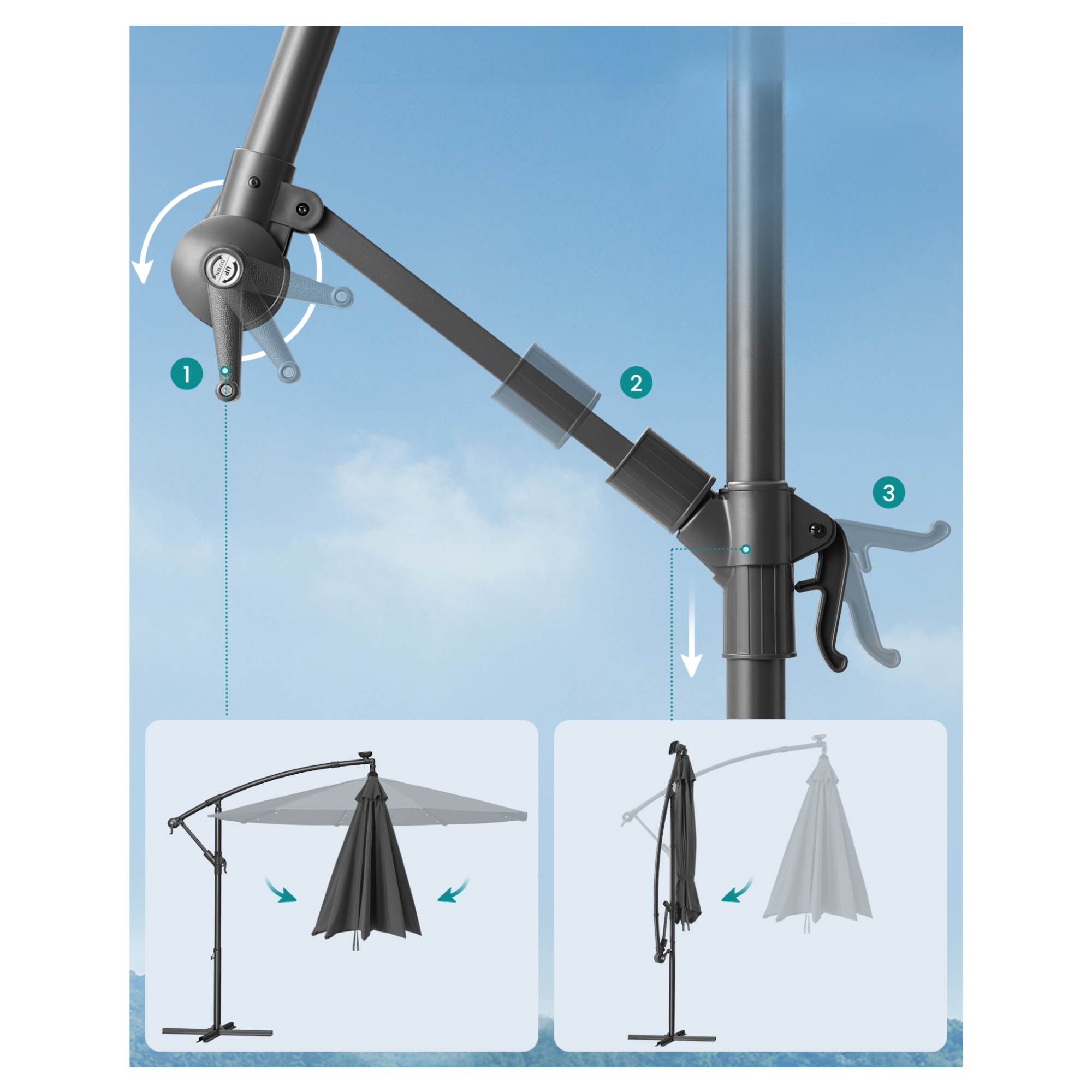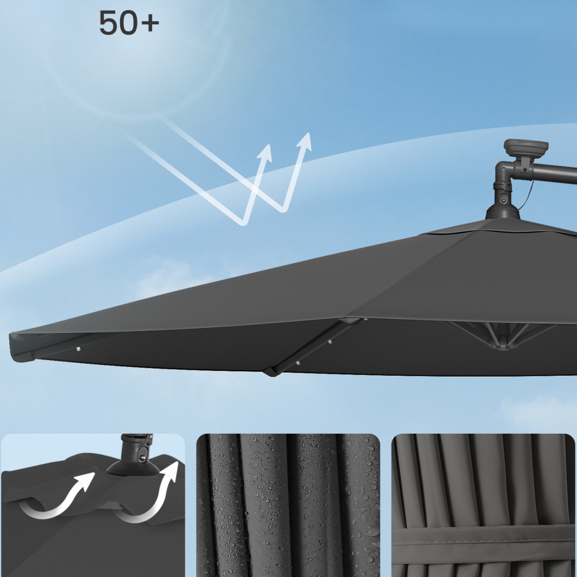 Slunečník lze jednoduše otevírat a zavírat pomocí klikového mechanismu. Protože disponuje funkcí naklápění, snadno jej nakloníte tak, aby vás spolehlivě chránil před slunečními paprsky. Slunečník má větrací otvor, který pomáhá zlepšit cirkulaci vzduchu, zabraňuje hromadění tepla a přispívá k lepší stabilitě při větru.