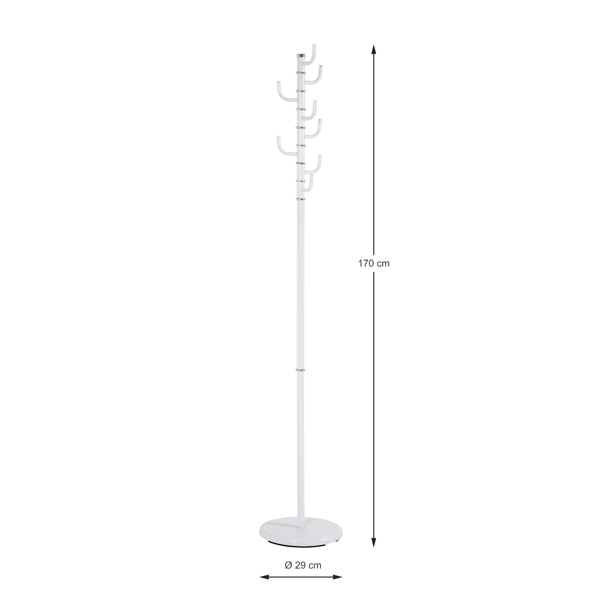 Věšák nejlépe poslouží v předsíni či šatně, avšak v případě potřeby jej snadno přesunete, kamkoliv budete chtít. Jeho konstrukce je vyrobena z pevné oceli s práškově lakovanou úpravou. Věšák disponuje 8 otočnými háčky a jeho stabilitu zajišťuje kulatá základna.