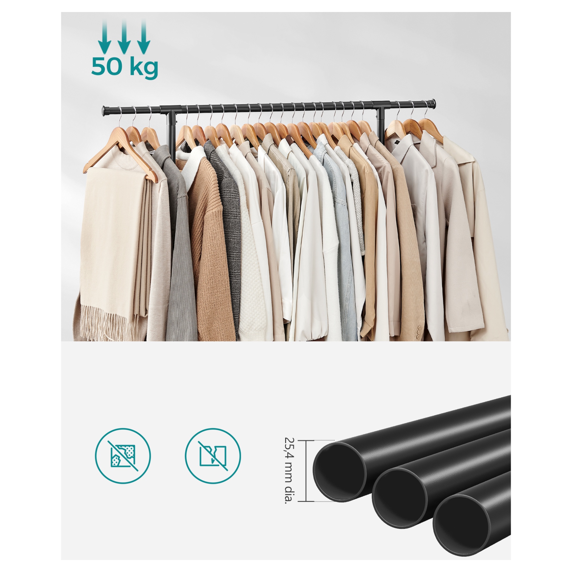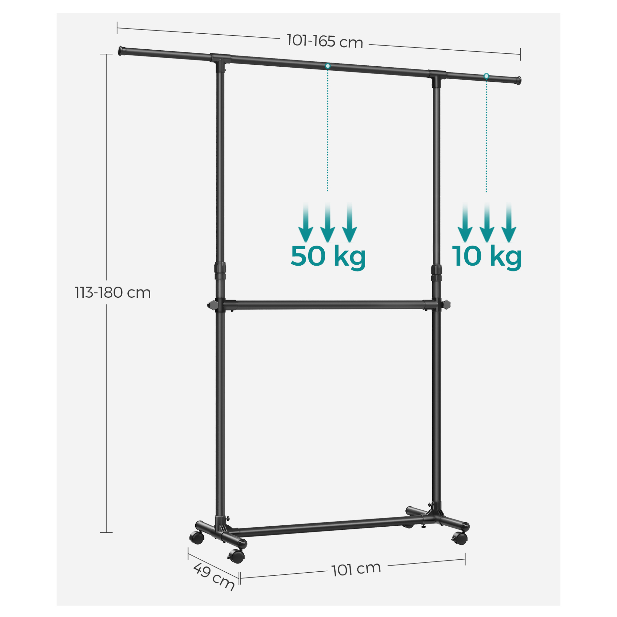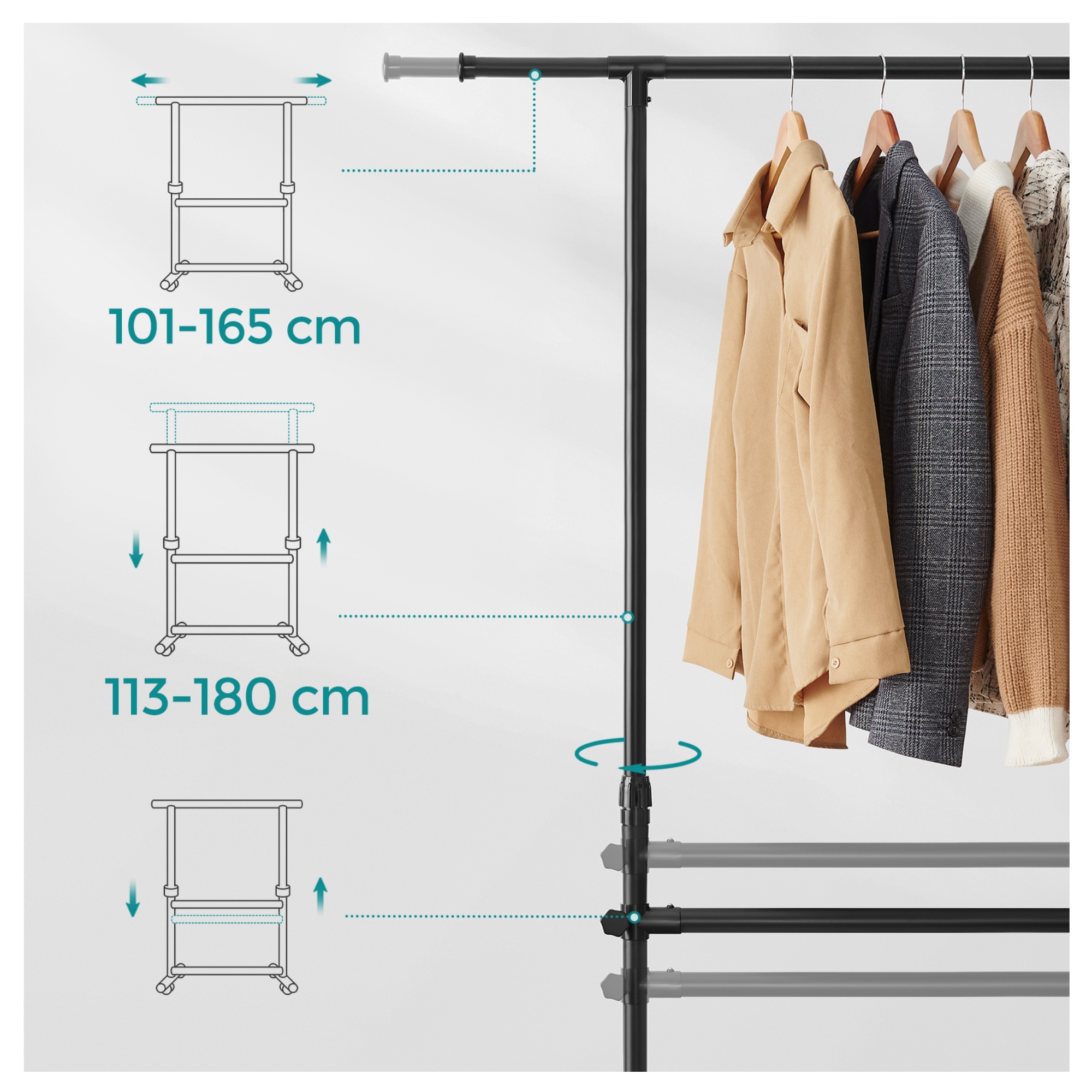 Stojan má jednoduchou kovovou konstrukci v černé barvě s 2 šatními tyčemi. Umožňuje snadné přizpůsobení hned několika způsoby. Lze nastavit jeho výšku od 113 do 180 cm, šířku vrchní šatní tyče od 101 do 165 cm a také lze posouvat výšku spodní šatní tyče. Stojan tak snadno a rychle přizpůsobíte svým možnostem a změníte podle potřeby.