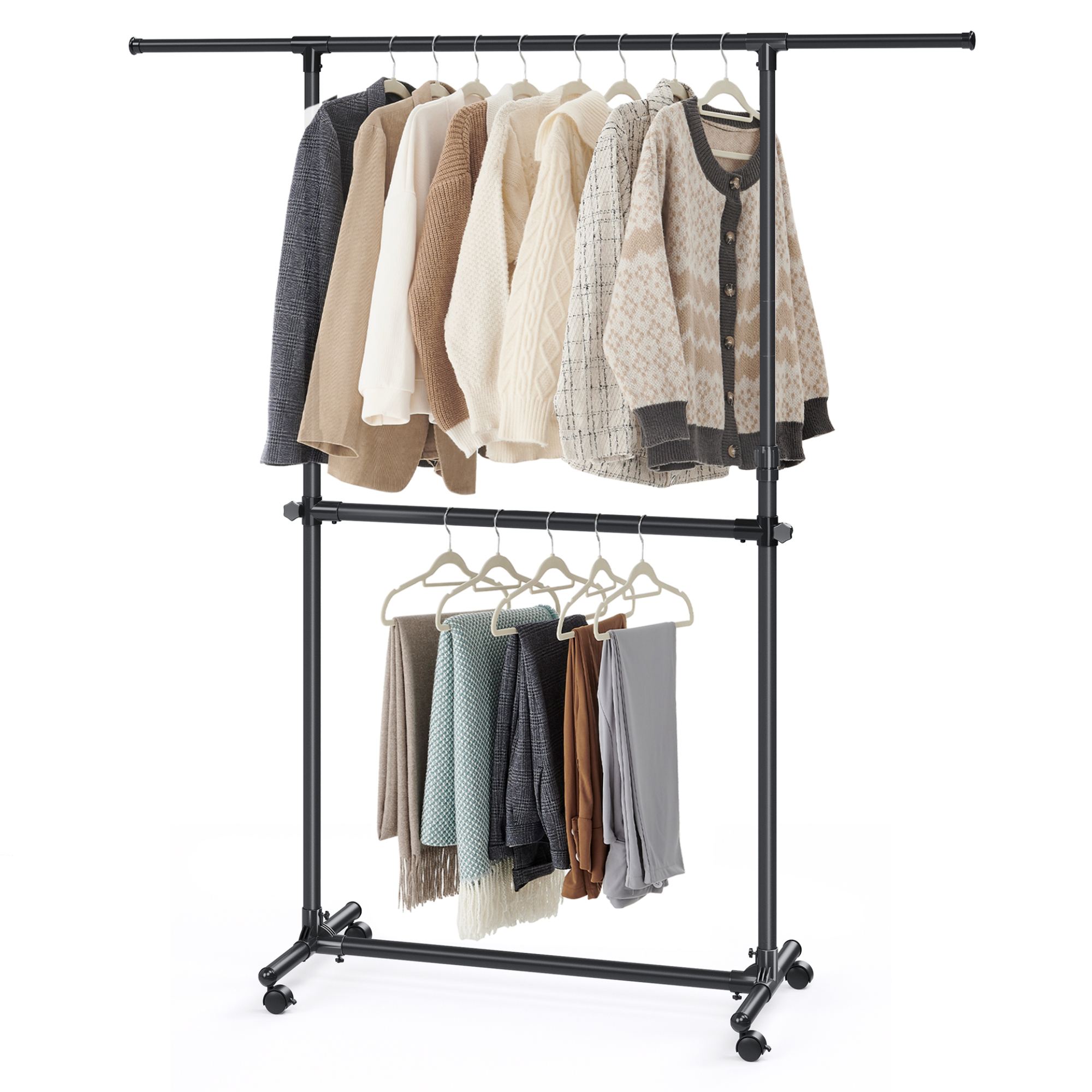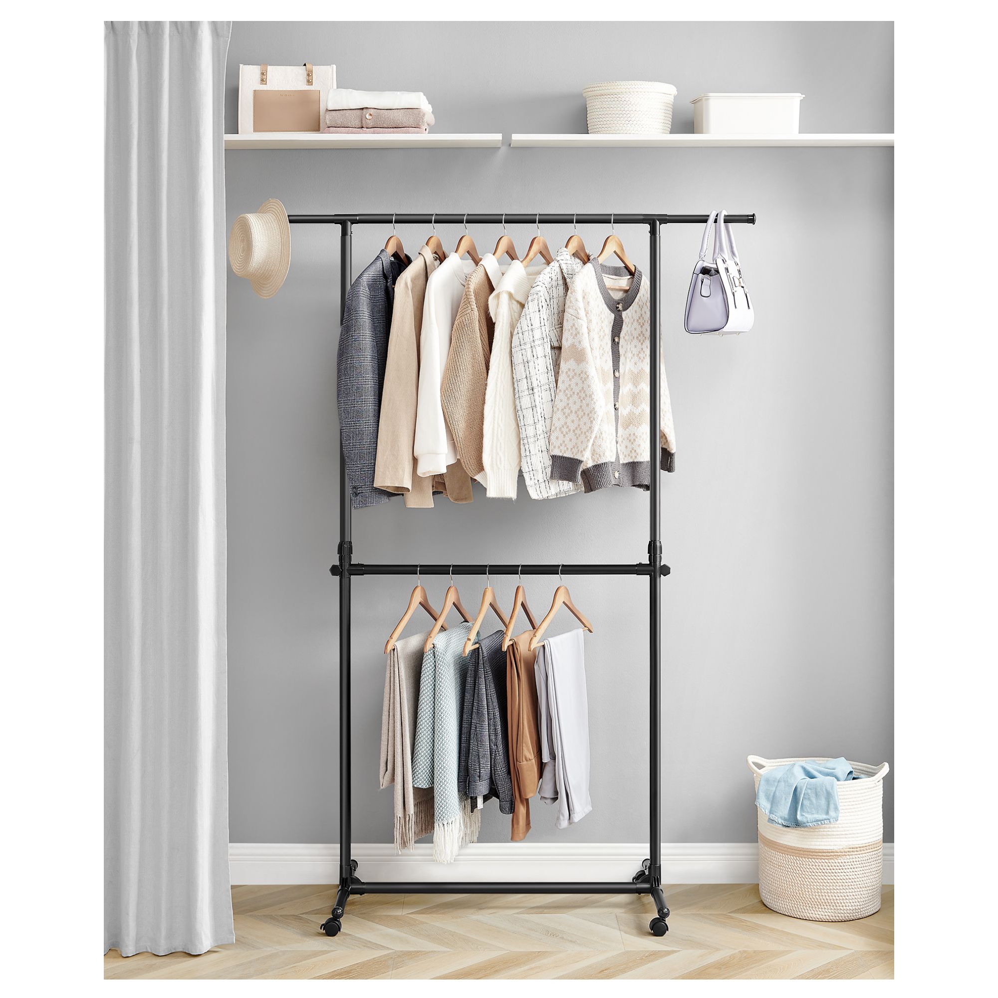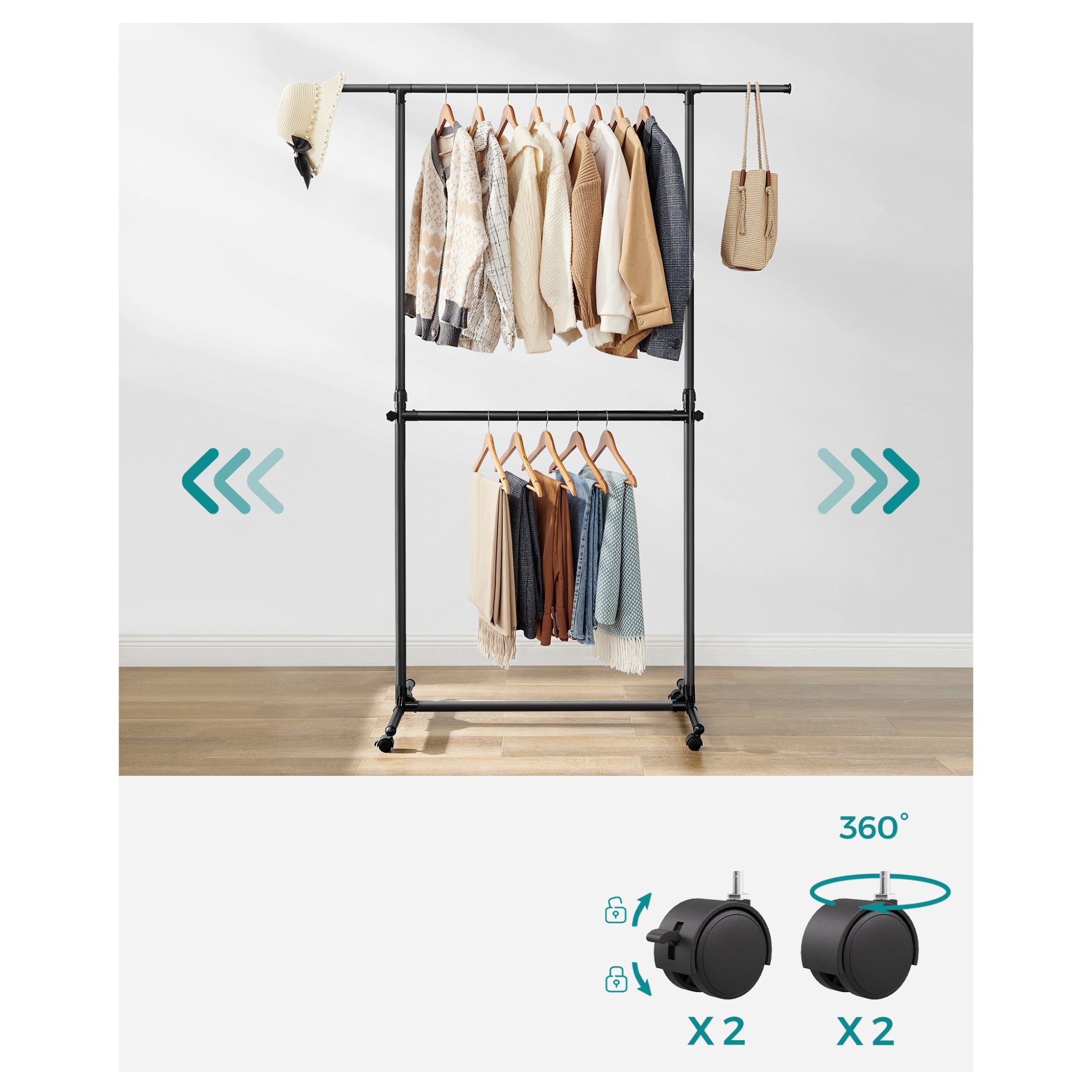 Stojan má jednoduchou kovovou konstrukci v černé barvě s 2 šatními tyčemi. Umožňuje snadné přizpůsobení hned několika způsoby. Lze nastavit jeho výšku od 113 do 180 cm, šířku vrchní šatní tyče od 101 do 165 cm a také lze posouvat výšku spodní šatní tyče. Stojan tak snadno a rychle přizpůsobíte svým možnostem a změníte podle potřeby.