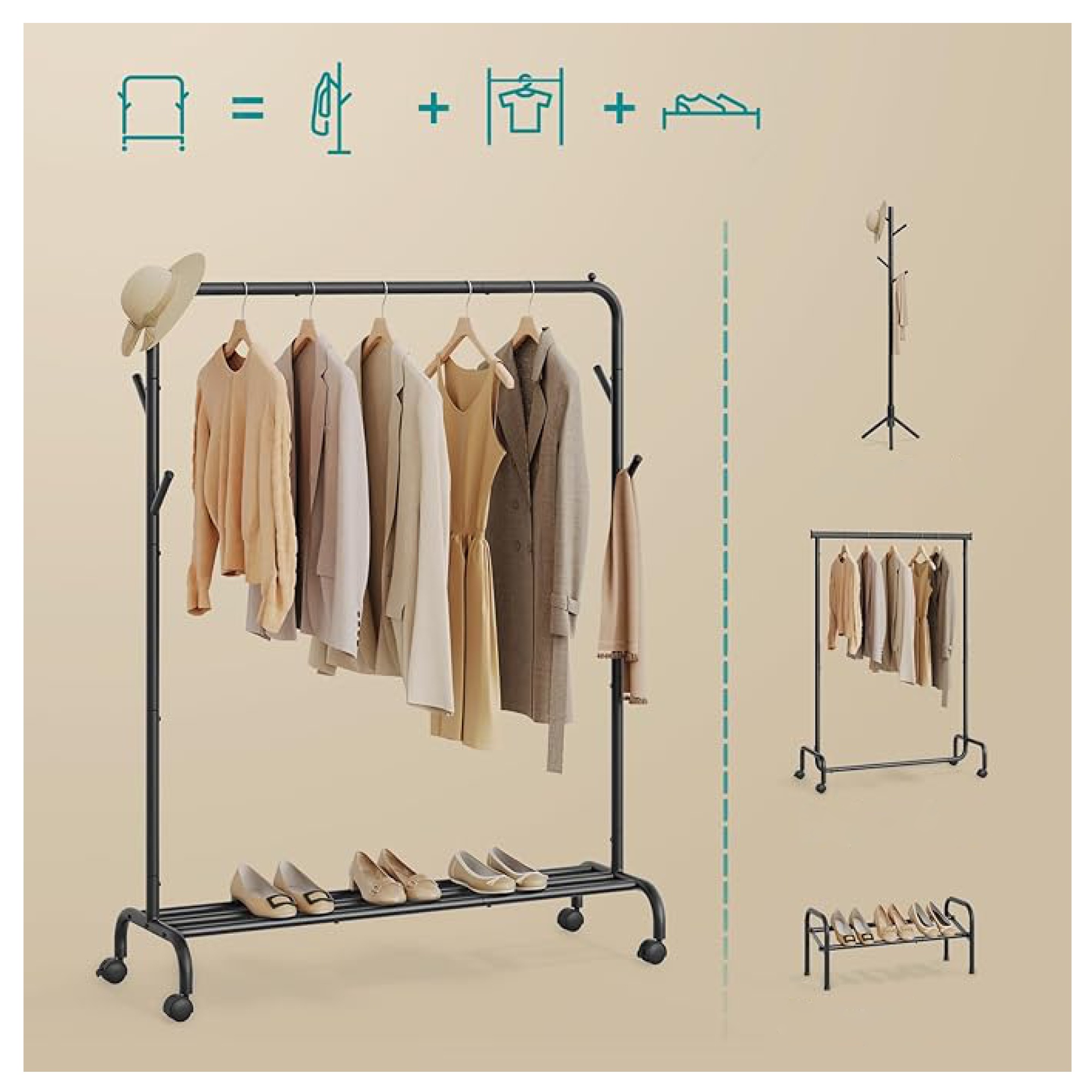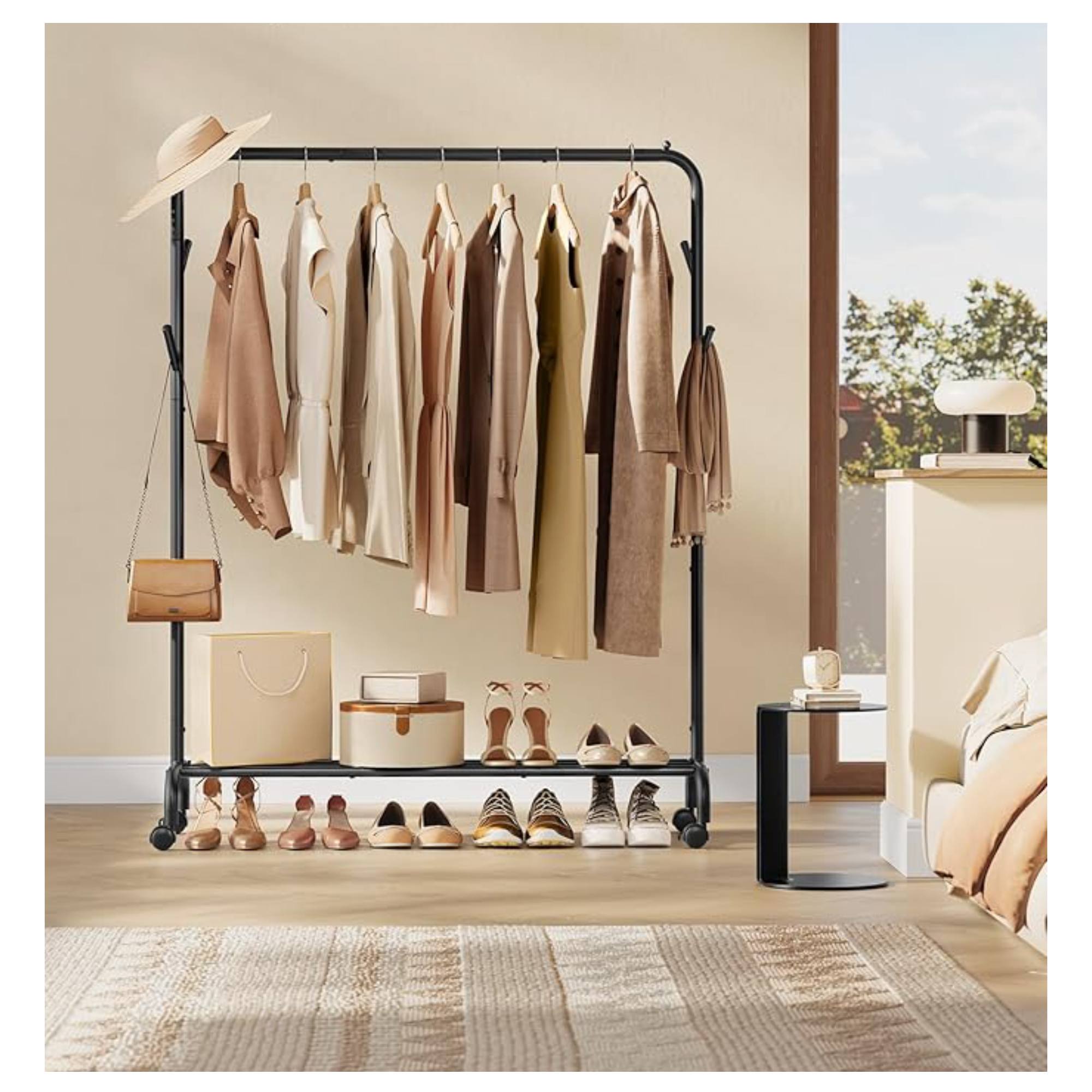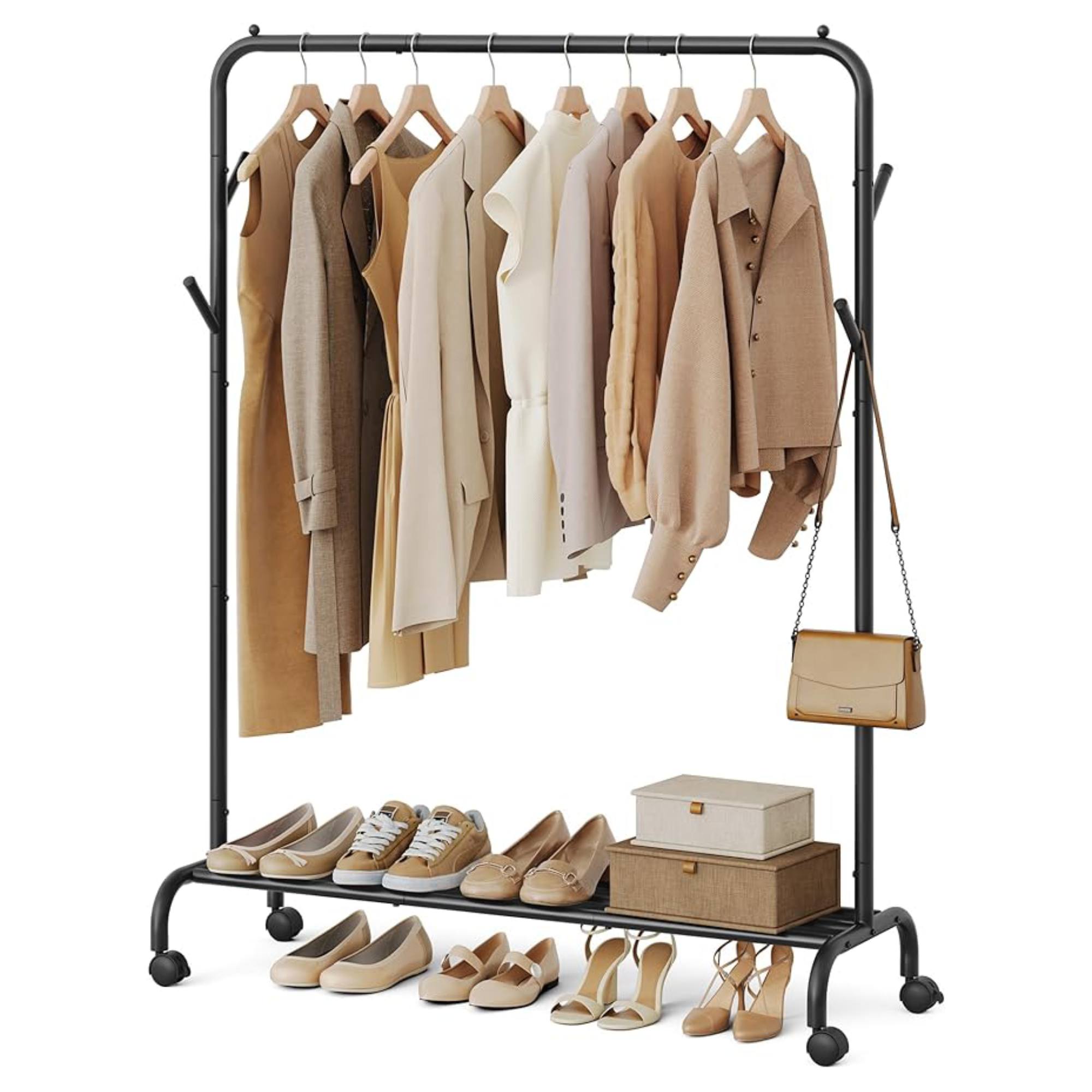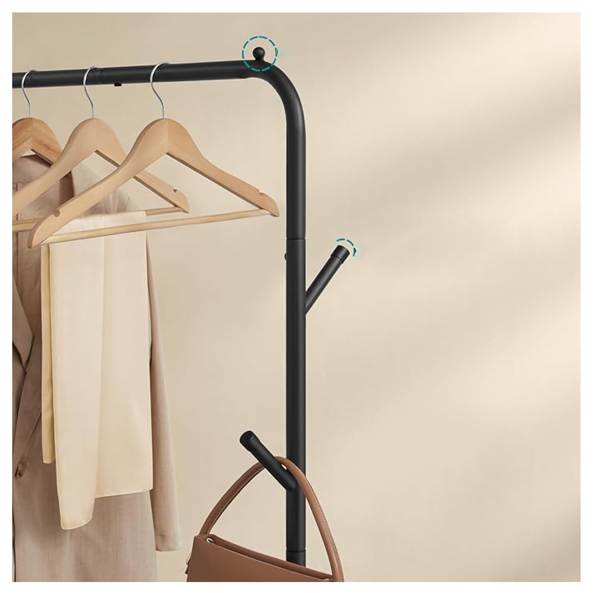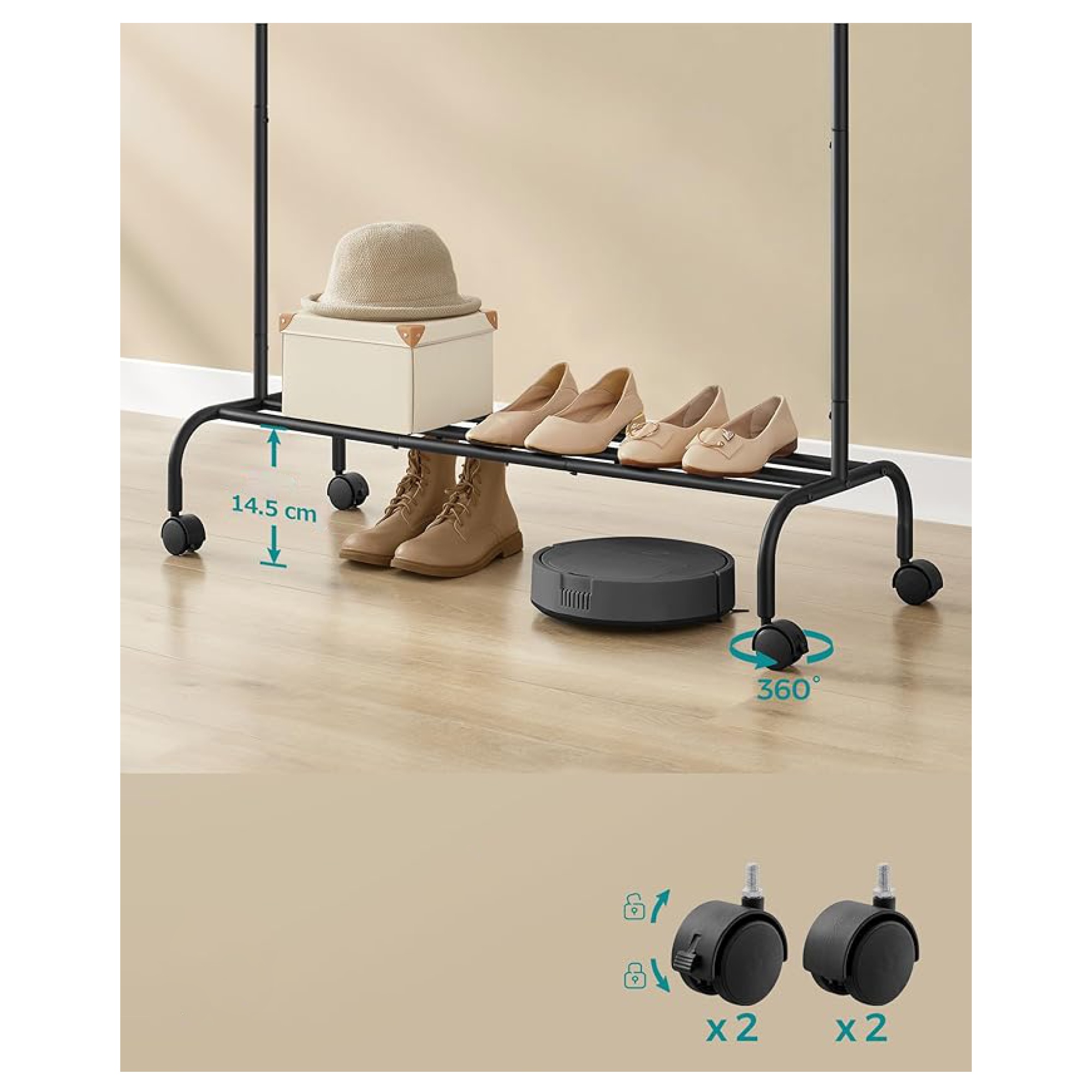 Stojan má jednoduchou kovovou konstrukci v černé barvě s 1 šatní tyčí. Tyč s nosností až 25 kg nabízí prostor pro zavěšení kabátů, košil, šatů a dalších oděvů. Je také vybaven 4 háčky, které jsou ideální pro zavěšení tašek, klobouků a šál. Ve spodní části stojanu je praktická odkládací police na boty nebo úložné boxy. Disponuje 4 kolečky, zajišťující snadné a tiché přemístění díky 360° otáčení. 2 kolečka jsou doplněna brzdami, které dodají bezpečnost a stabilitu.