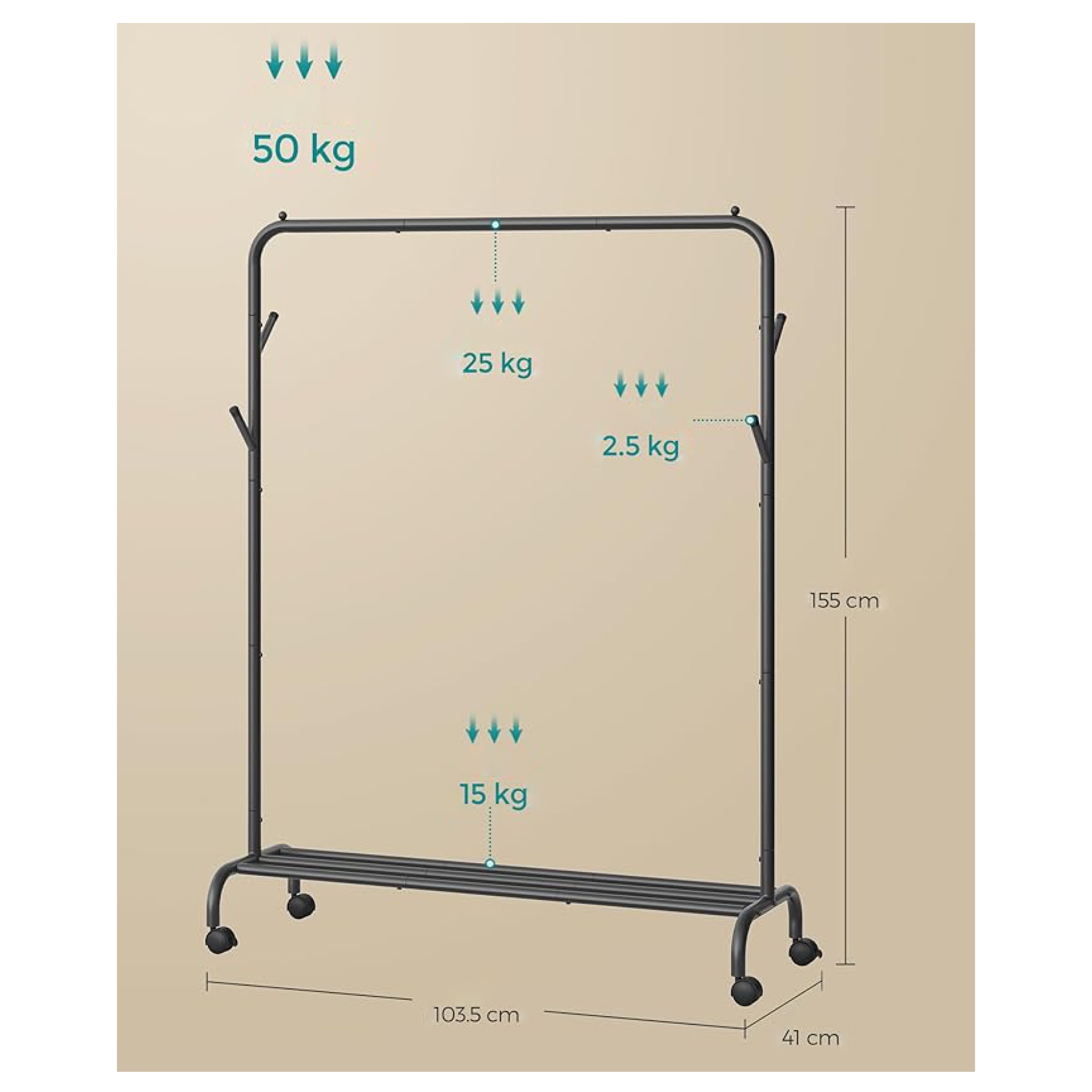 - Doplňující poznámka: Maximální nosnost šatní tyče je 25 kg, jednotlivých háčků 2,5 kg a spodního úložného prostoru 15 kg.