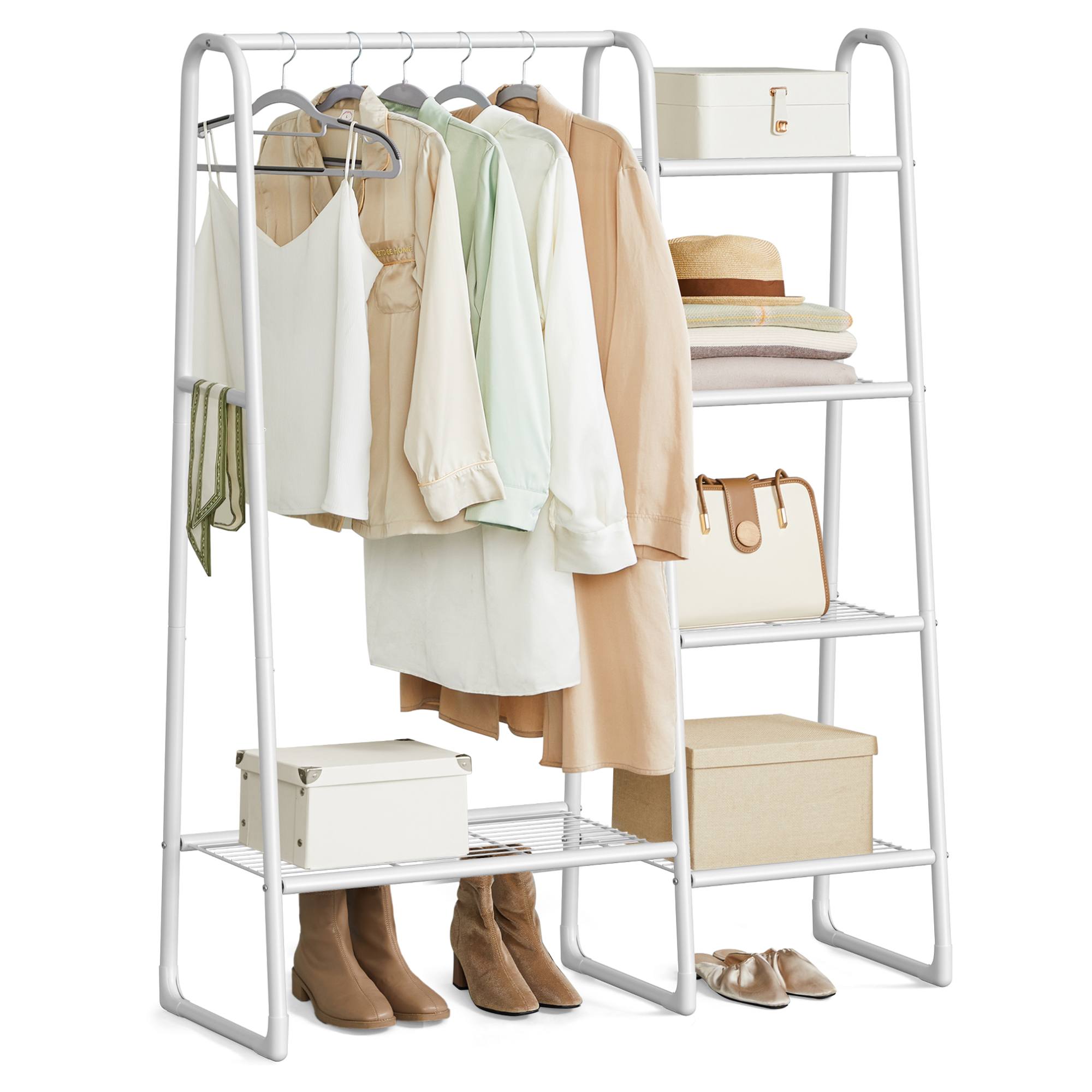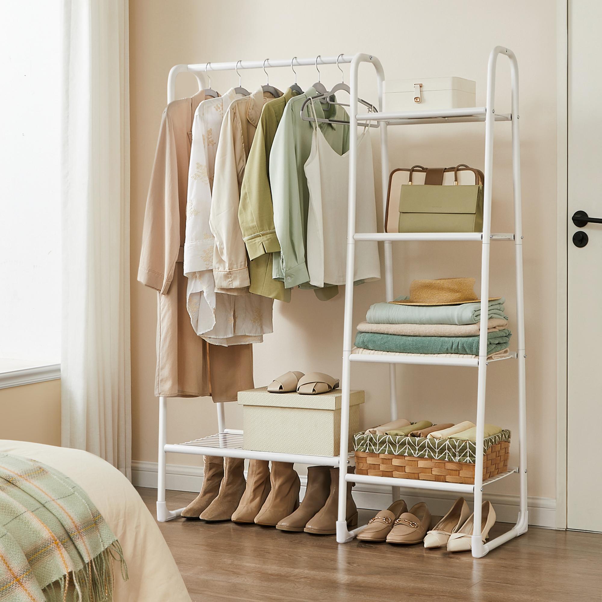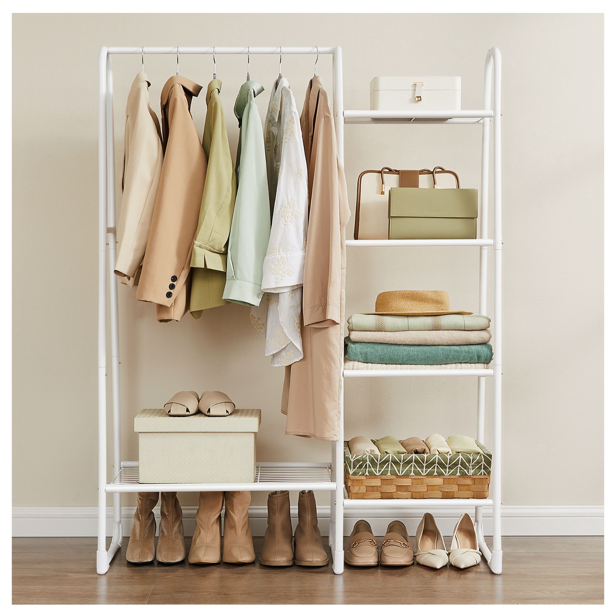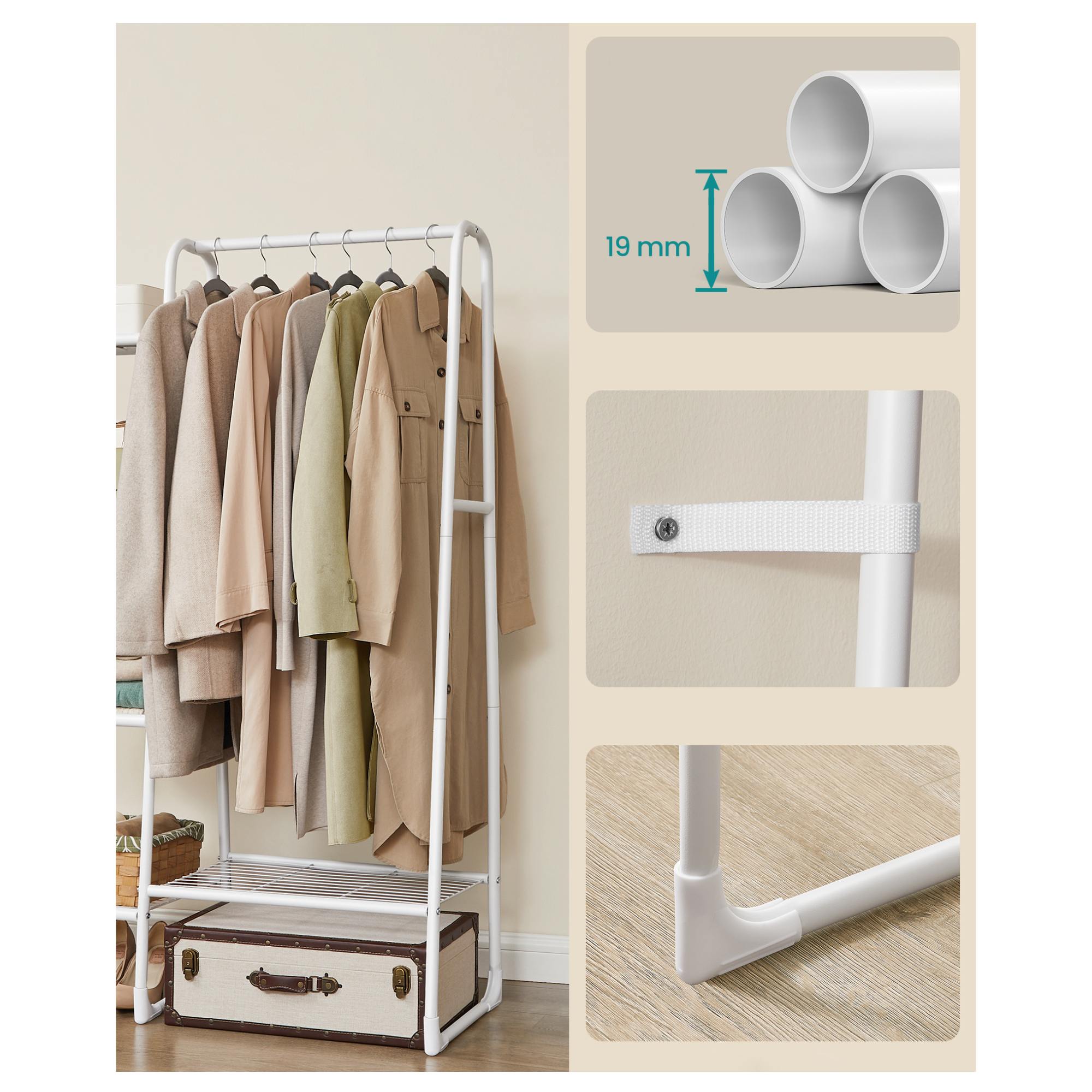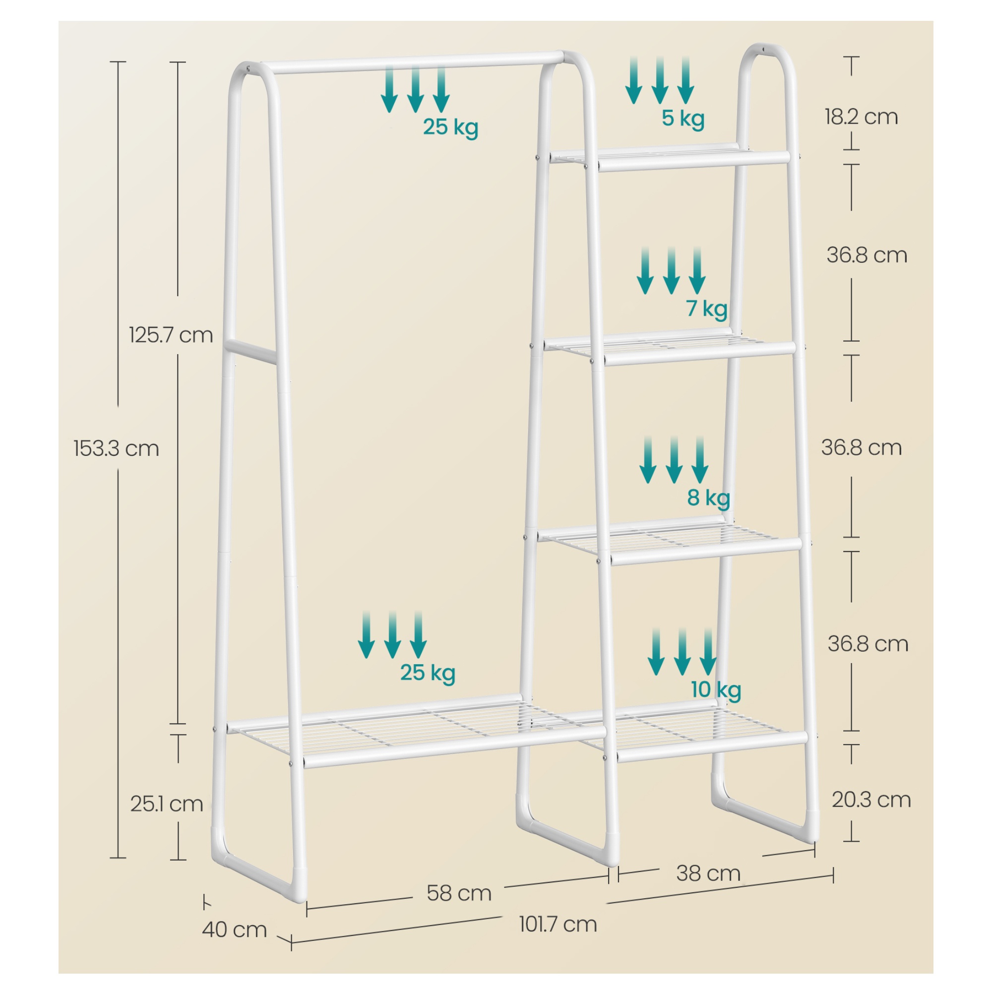 Stojan má jednoduchou kovovou konstrukci v bílé barvě. Disponuje 1 šatní tyčí s nosností 25 kg, která nabízí prostor pro zavěšení kabátů, košil nebo šatů. V levé spodní části stojanu se nachází praktická odkládací police, ideální pro boty, tašky nebo úložné boxy. V pravé části jsou k dispozici 4 police pro další oděvy či doplňky. Konstrukce je doplněna praktickými plastovými nástavci, které zajišťují stabilitu. Pro vyšší bezpečnost doporučujeme připevnit ke zdi pomocí sady proti převrácení.