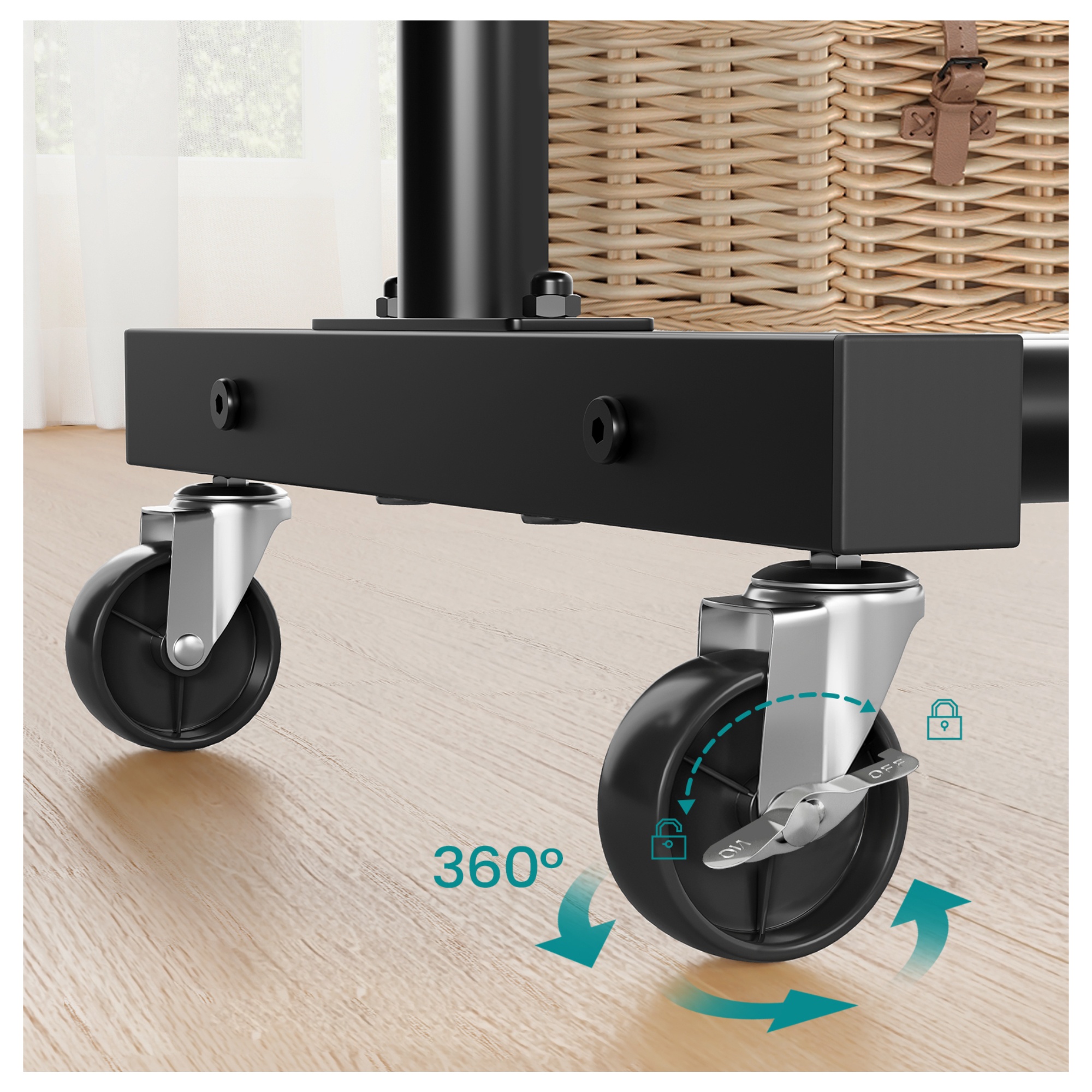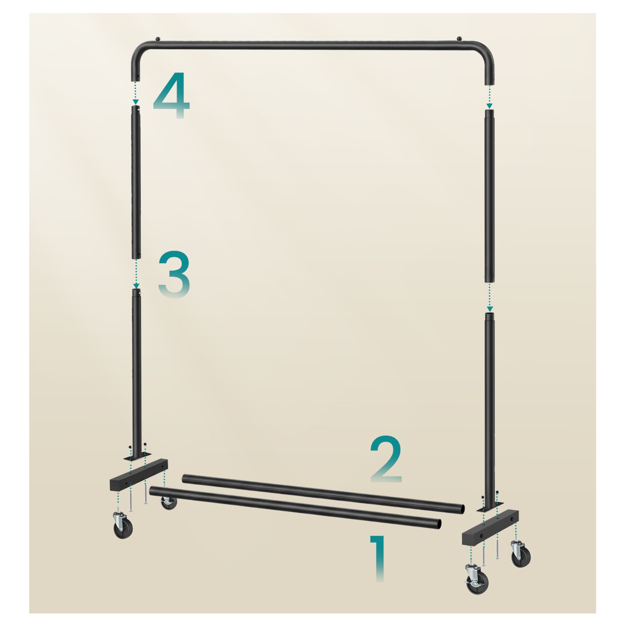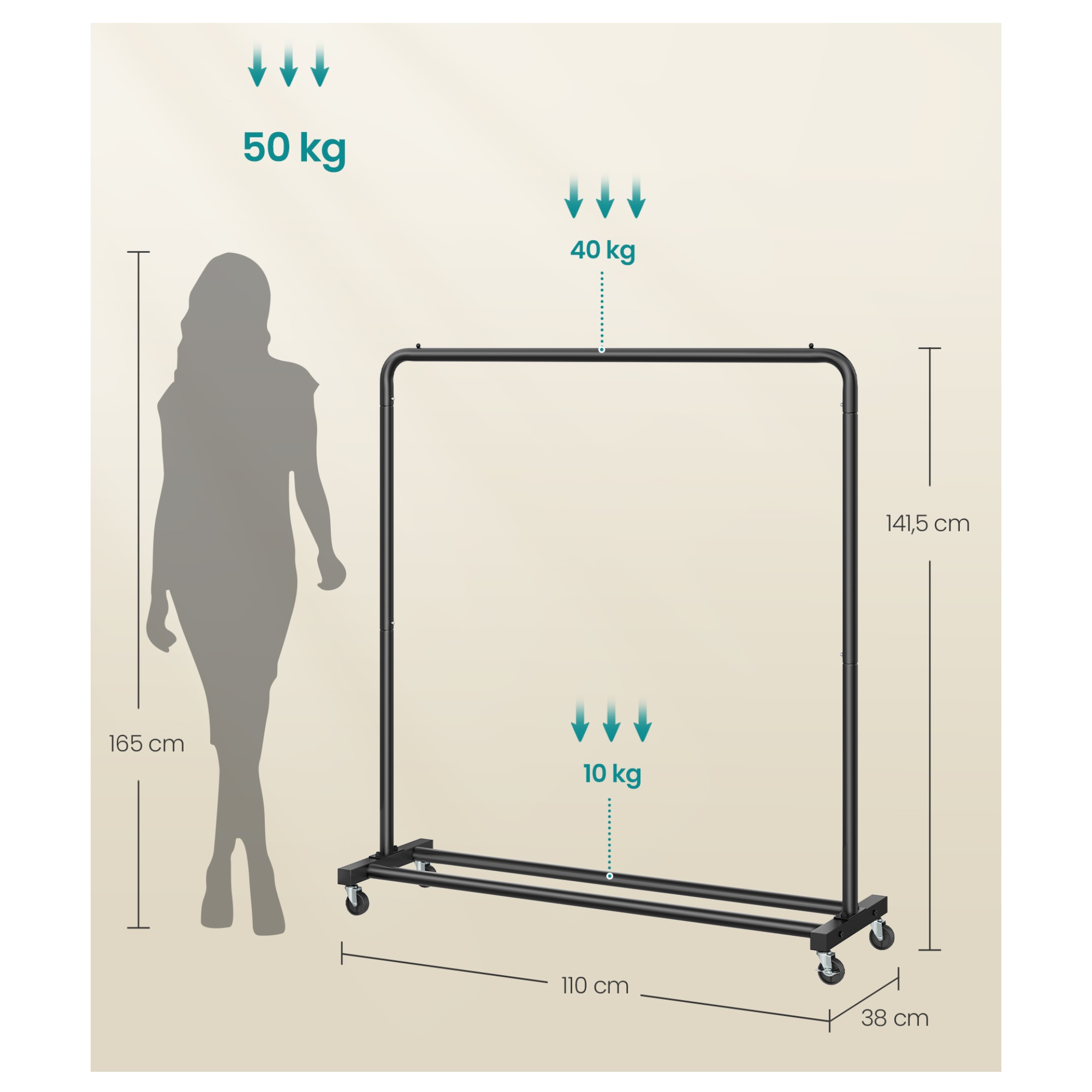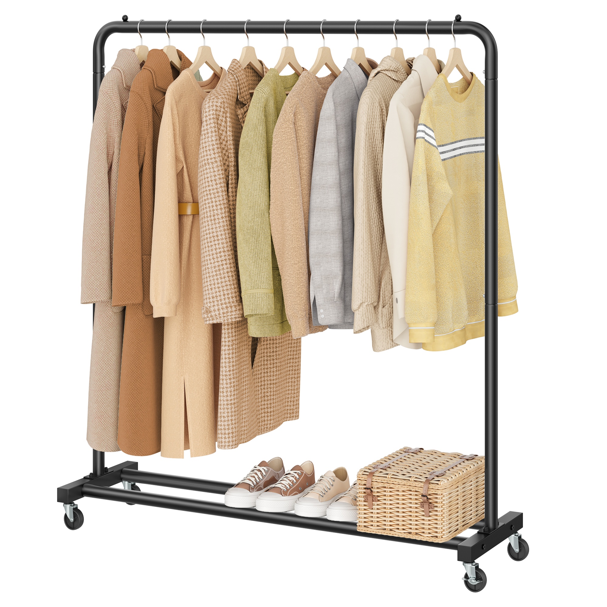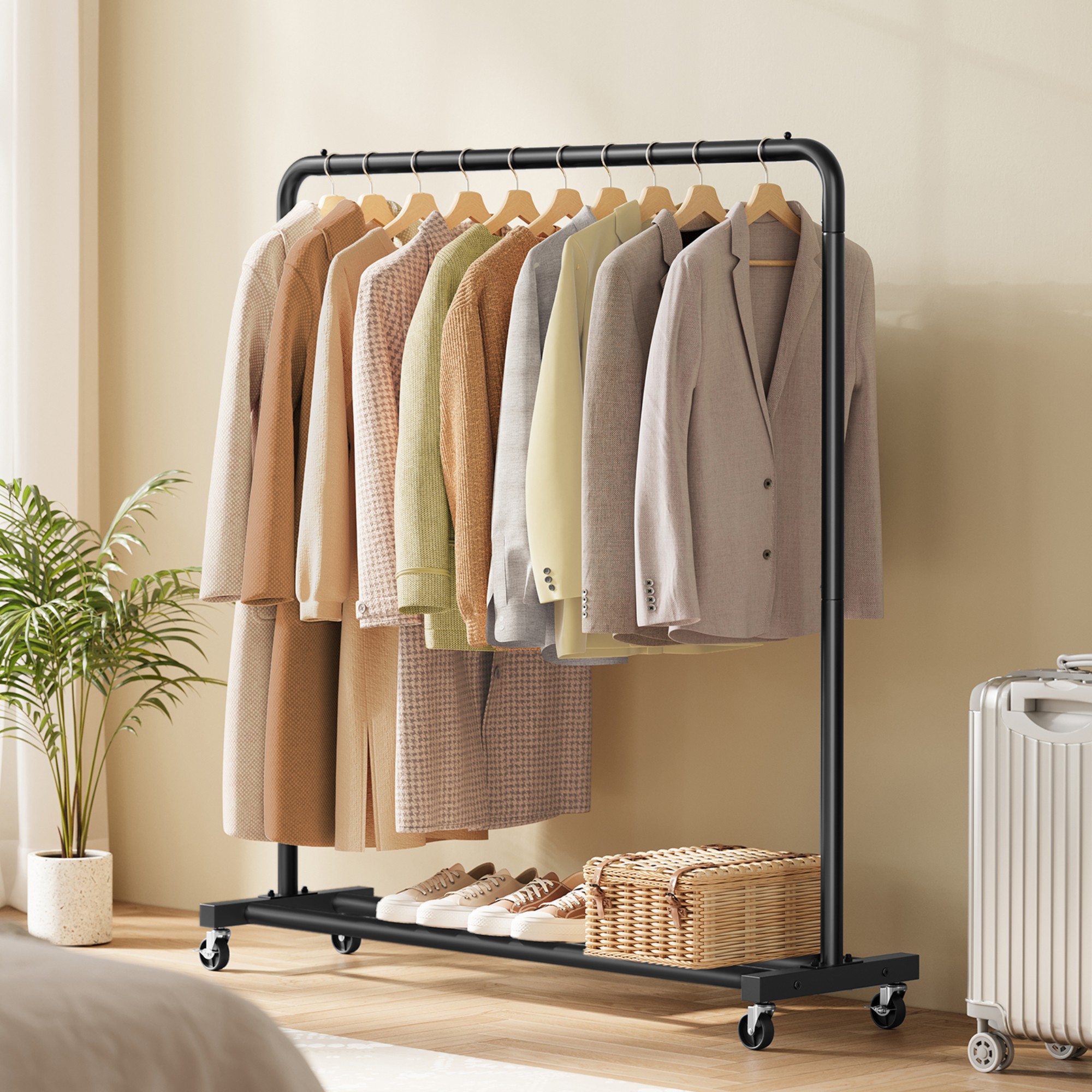Stojan má jednoduchou kovovou konstrukci v černé barvě s 1 šatní tyčí. Ta je vyrobena z jednoho kusu, takže se při zatížení neohýbá. Tyč s nosností až 40 kg nabízí prostor pro zavěšení kabátů, košil, šatů a dalších oděvů. Ve spodní části stojanu je praktická odkládací police, ideální pro boty, tašky nebo úložné boxy. Disponuje 4 kolečky, zajišťující snadné a tiché přemístění díky 360° otáčení. 2 kolečka jsou doplněna brzdami, které dodají bezpečnost a stabilitu.