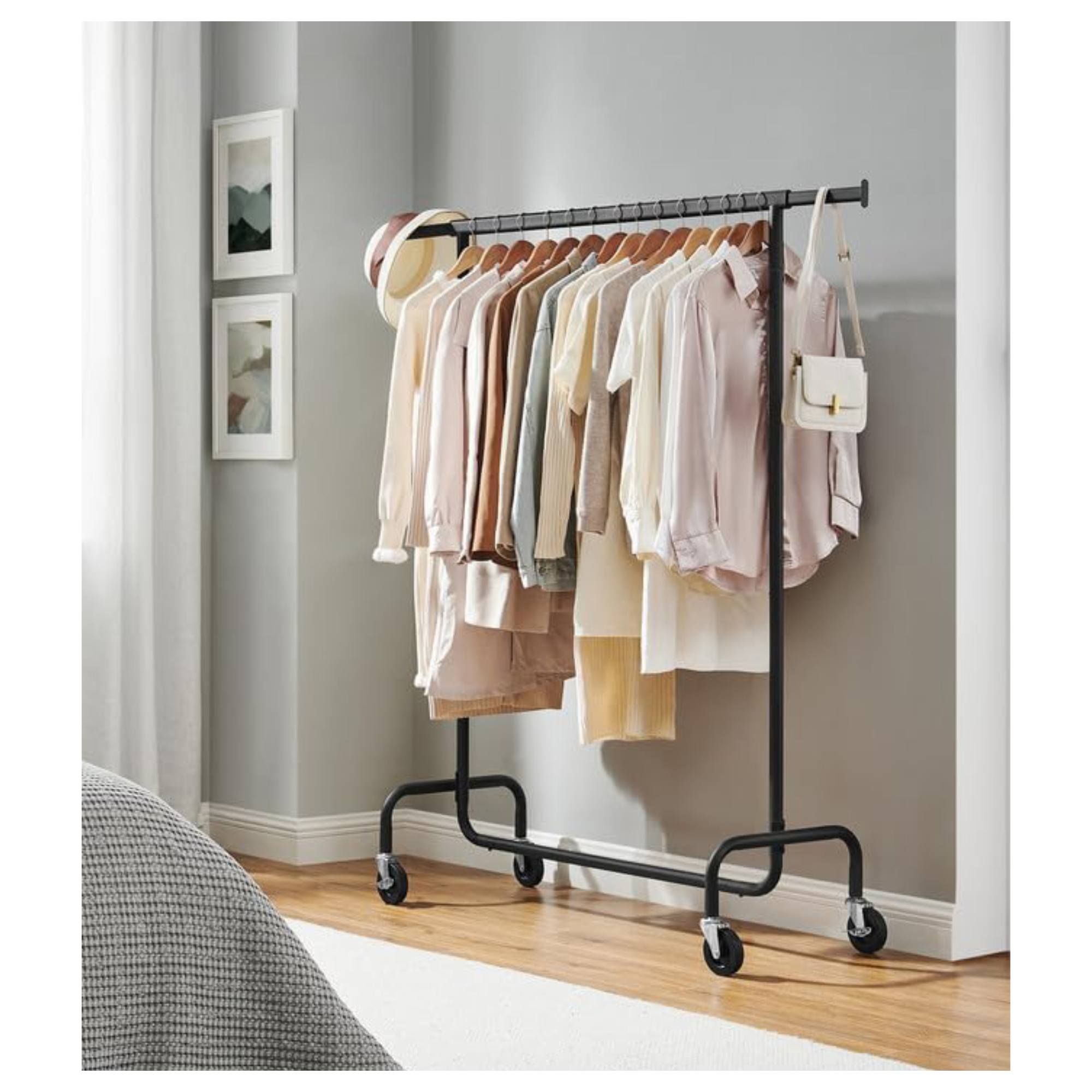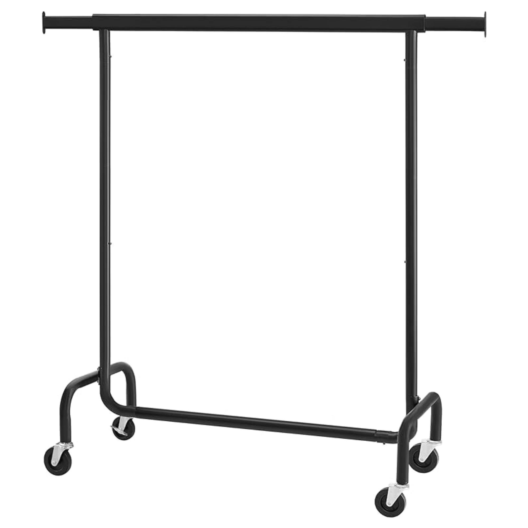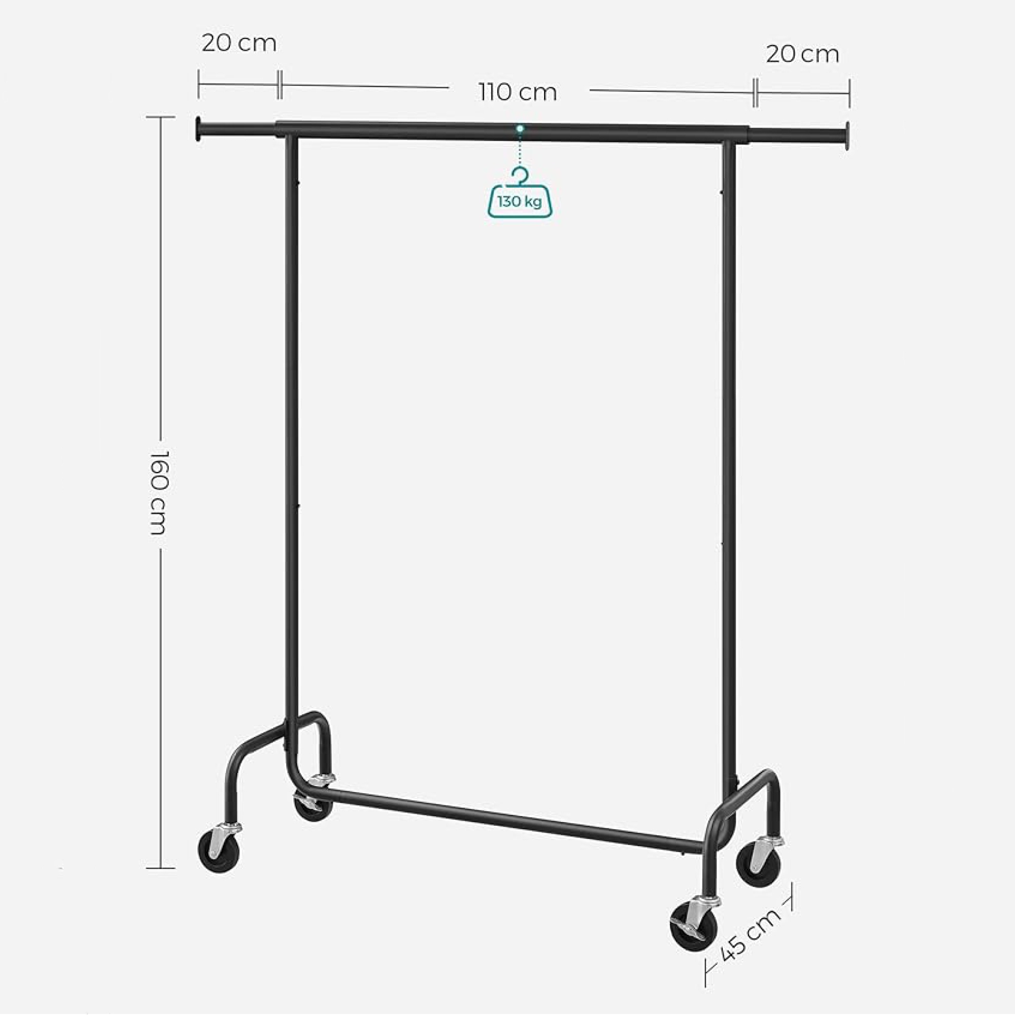 Stojan má jednoduchou kovovou konstrukci v černé barvě s 1 šatní tyčí. Tyč umožňuje snadné a rychlé přizpůsobení šířky od 110 do 150 cm podle potřeby. Šatní tyč nabízí prostor pro zavěšení kabátů, košil, šatů a dalších oděvů. Disponuje 4 kolečky, která zajišťují snadné a tiché přemístění díky 360° otáčení. 2 kolečka jsou doplněna brzdami, které dodají bezpečnost a stabilitu.