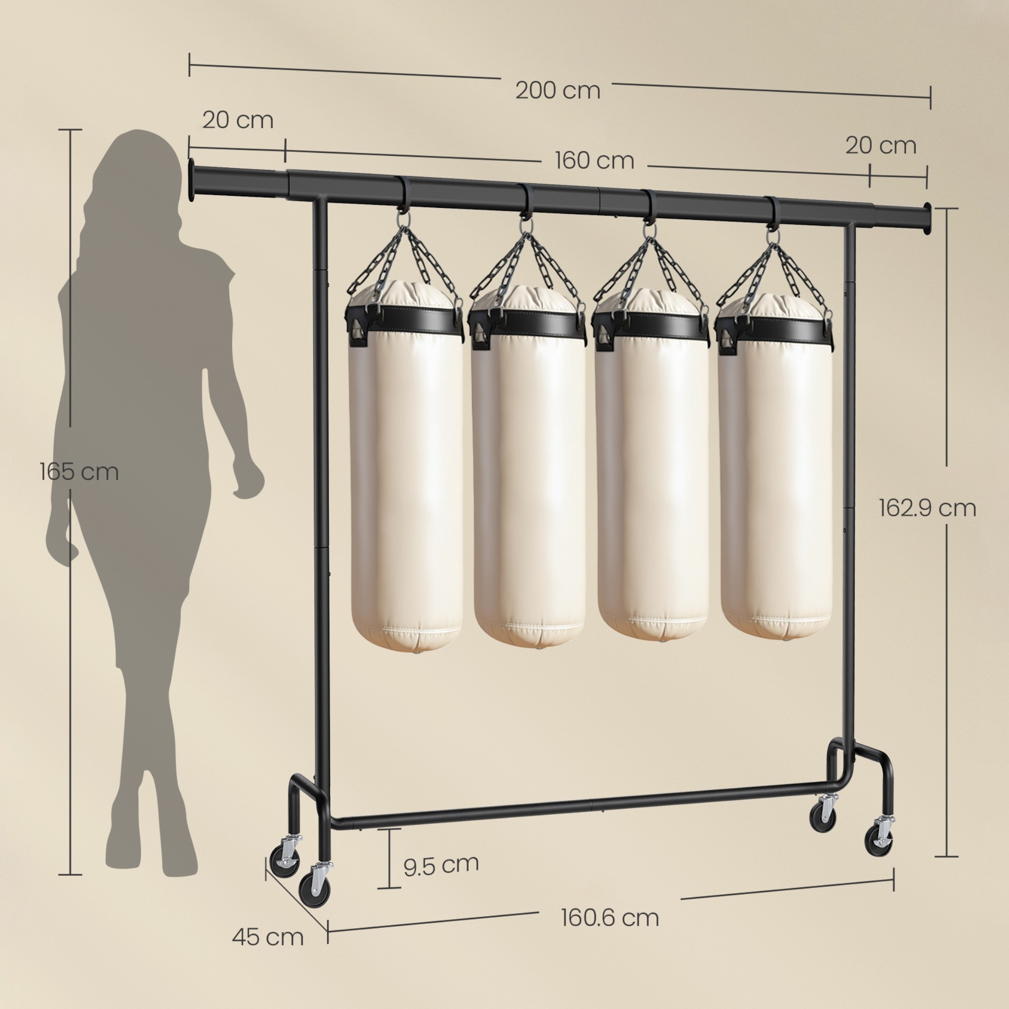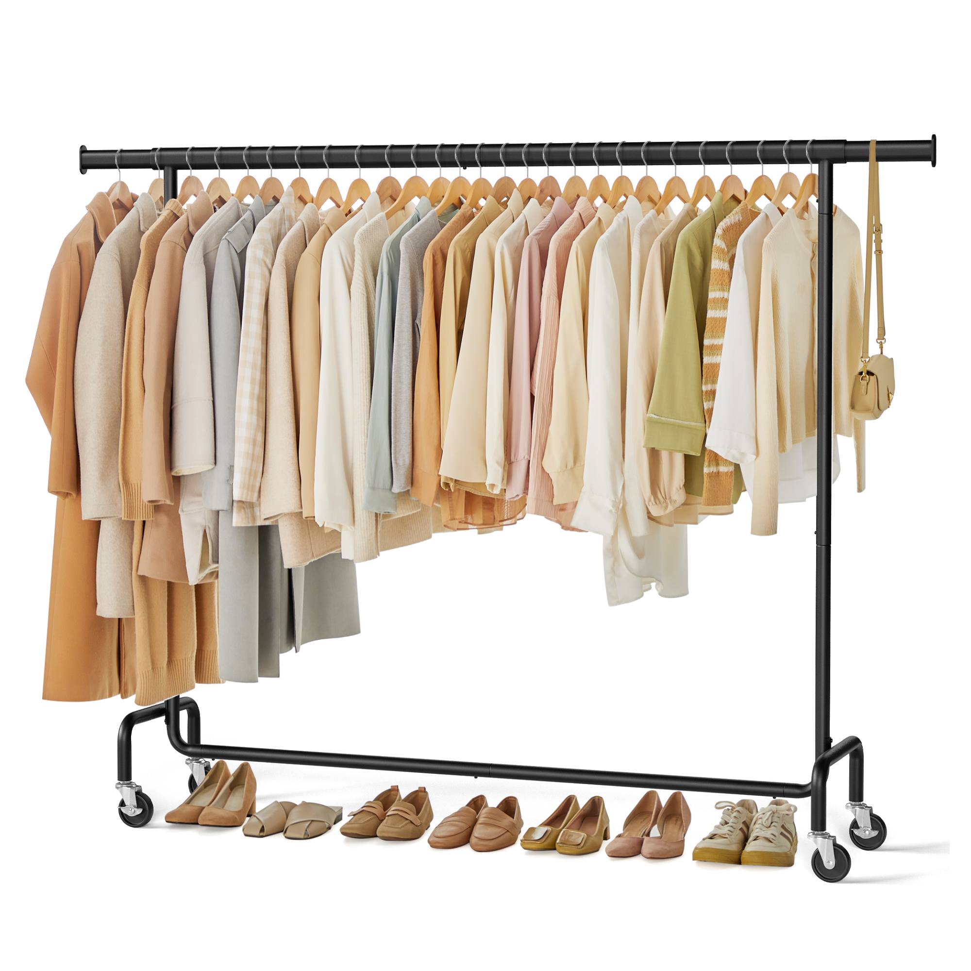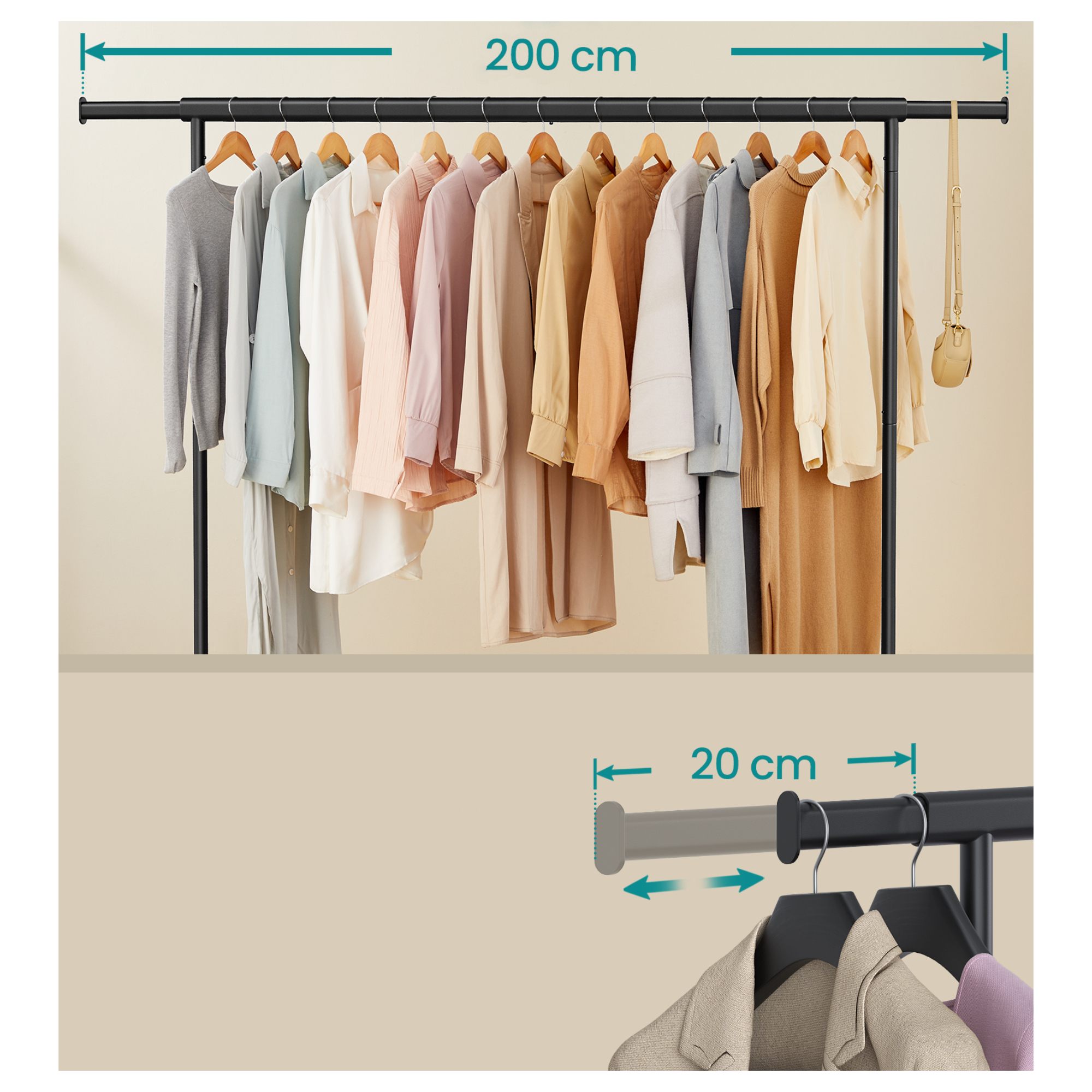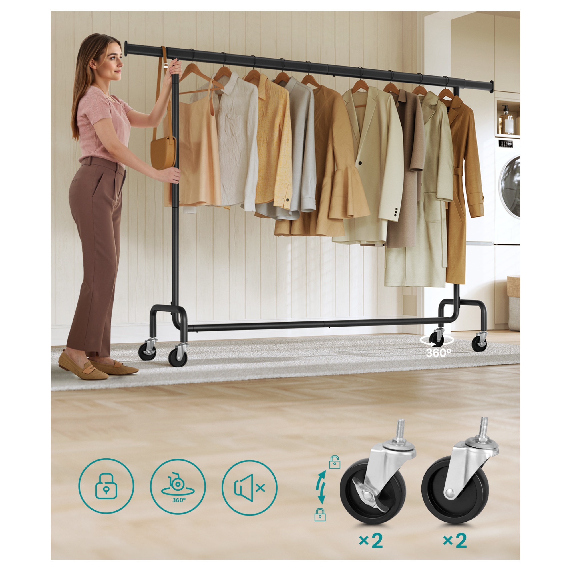 Stojan má jednoduchou kovovou konstrukci s 1 šatní tyčí. Tyč umožňuje snadné a rychlé přizpůsobení šířky od 160 do 200 cm podle potřeby. Šatní tyč nabízí prostor pro zavěšení kabátů, košil, šatů a dalších oděvů. Disponuje 4 kolečky, která zajišťují snadné a tiché přemístění díky 360° otáčení. 2 kolečka jsou doplněna brzdami, které dodají bezpečnost a stabilitu.