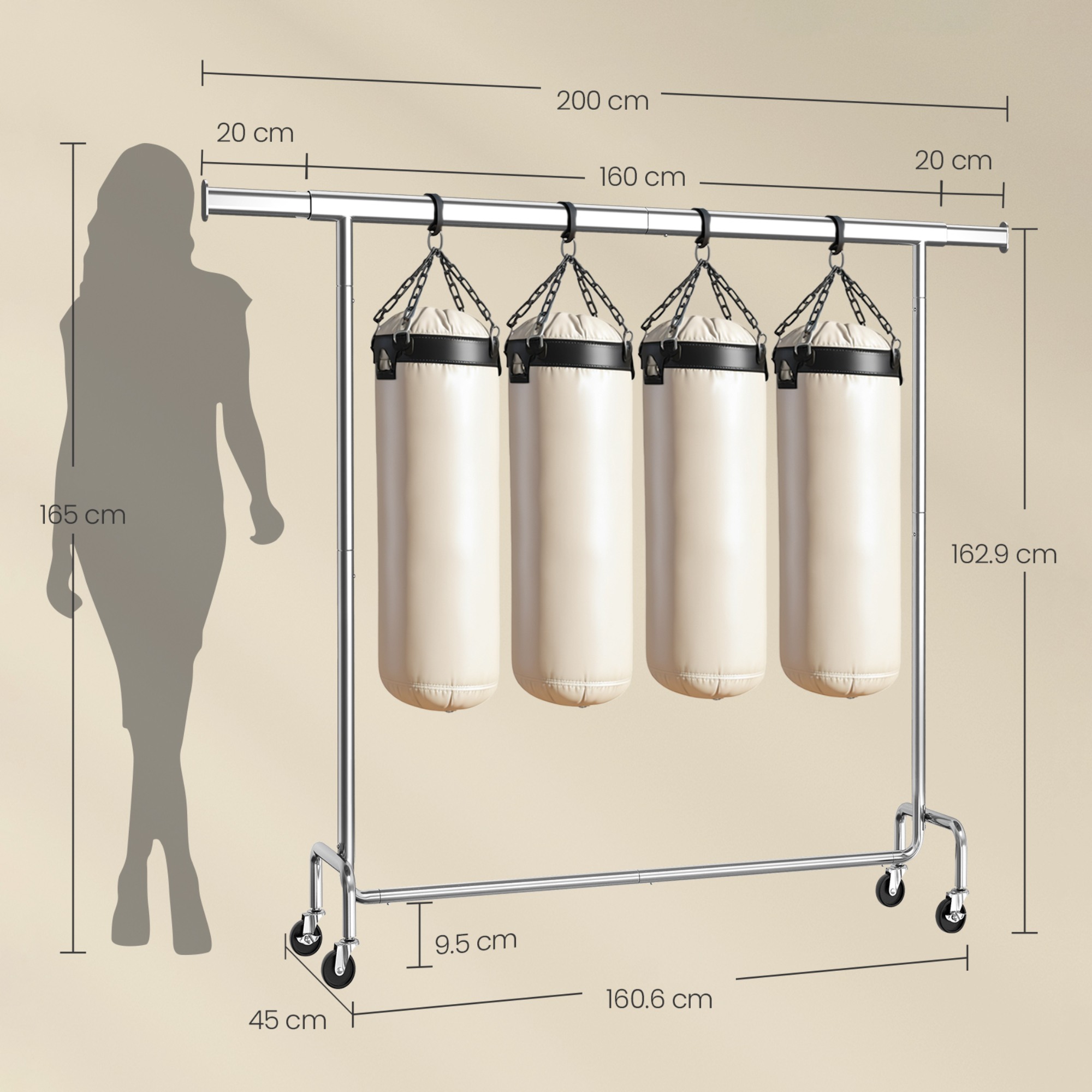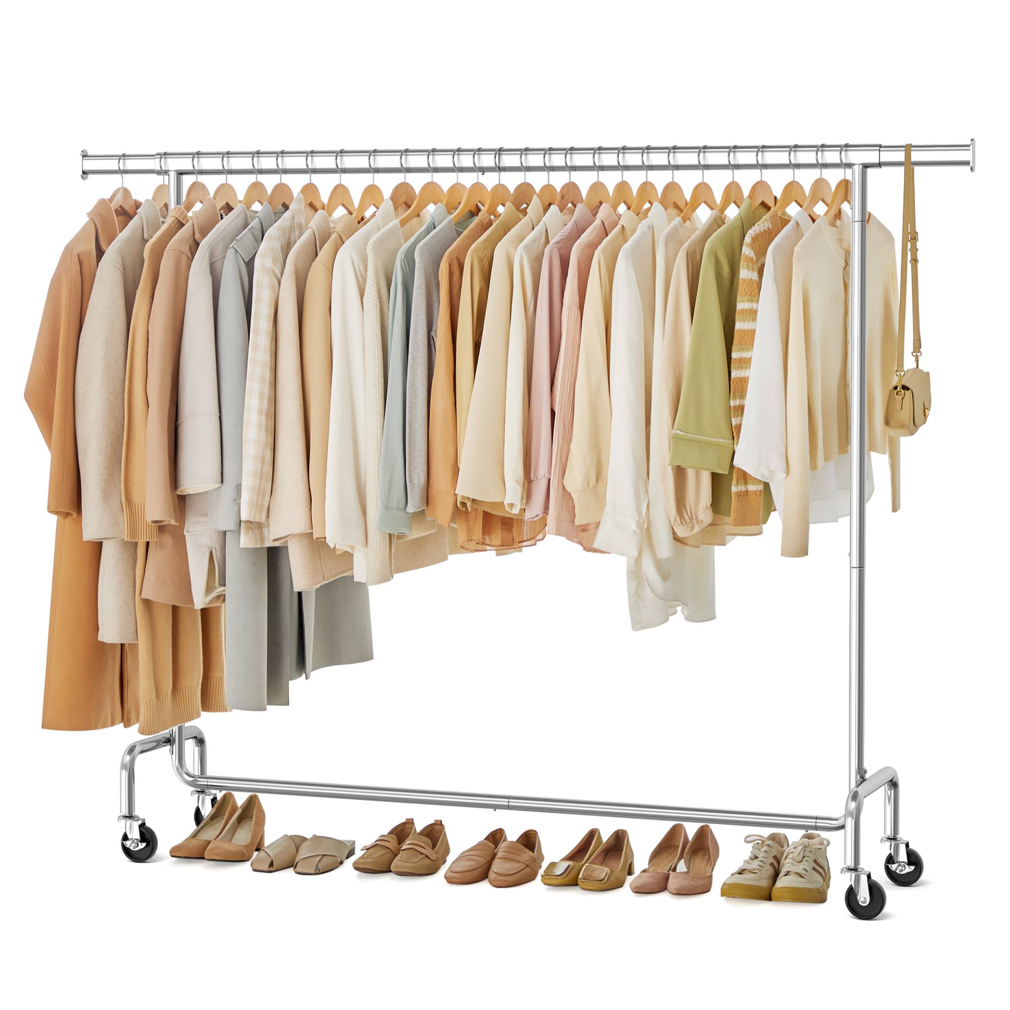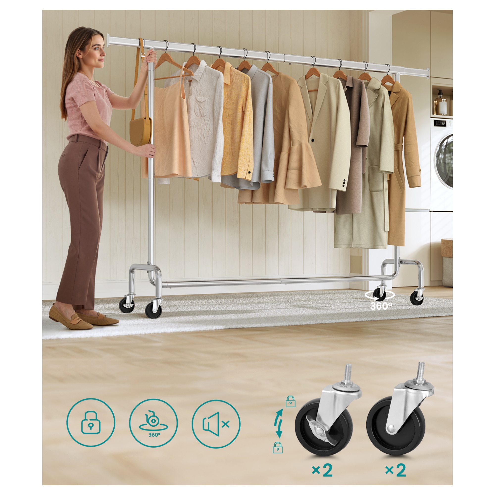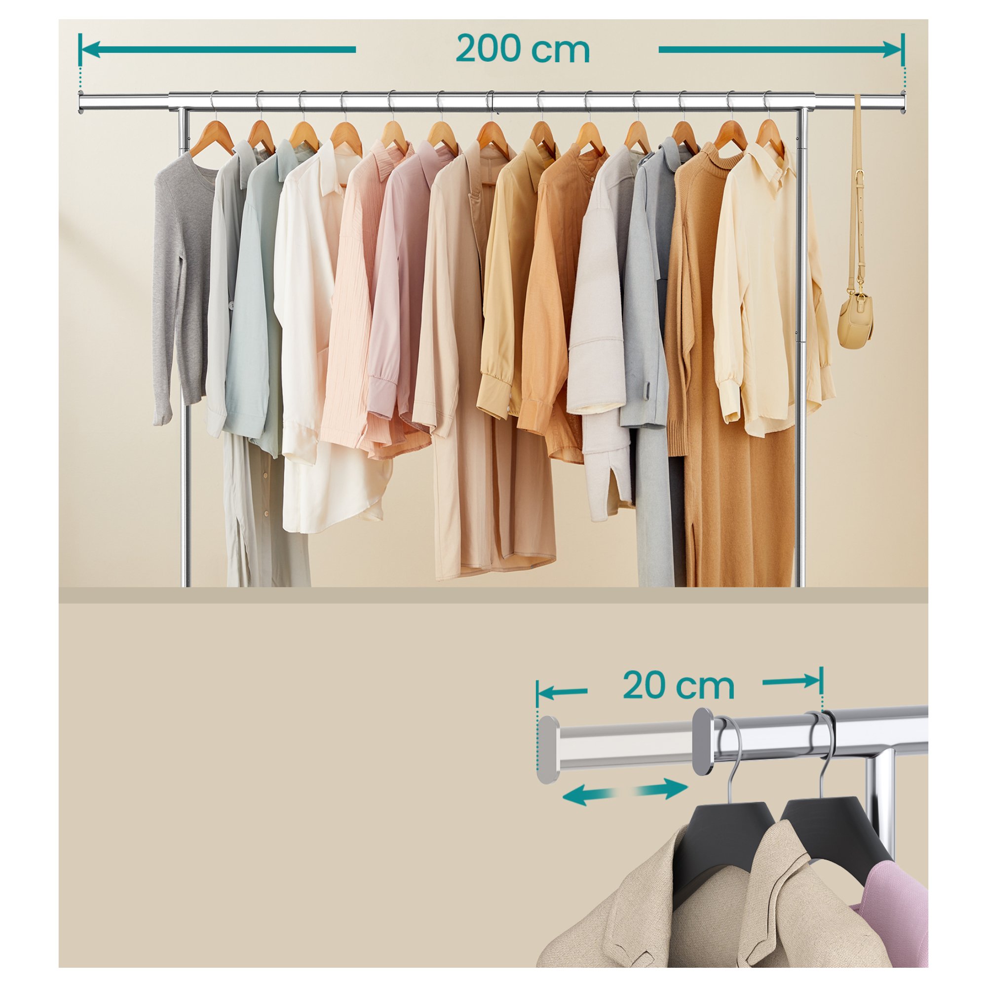 Stojan má jednoduchou kovovou konstrukci s 1 šatní tyčí. Tyč umožňuje snadné a rychlé přizpůsobení šířky od 160 do 200 cm podle potřeby. Šatní tyč nabízí prostor pro zavěšení kabátů, košil, šatů a dalších oděvů. Disponuje 4 kolečky, která zajišťují snadné a tiché přemístění díky 360° otáčení. 2 kolečka jsou doplněna brzdami, které dodají bezpečnost a stabilitu.