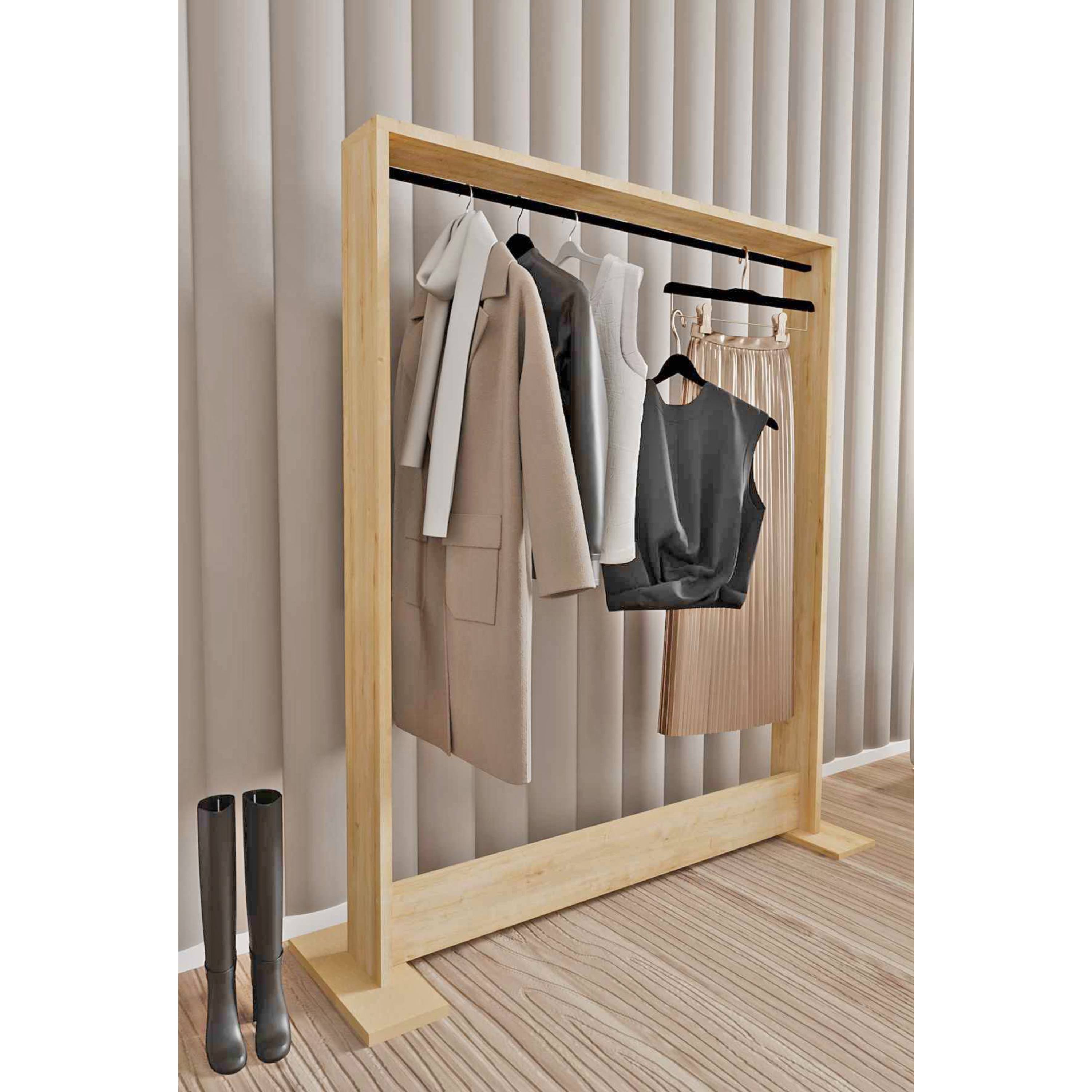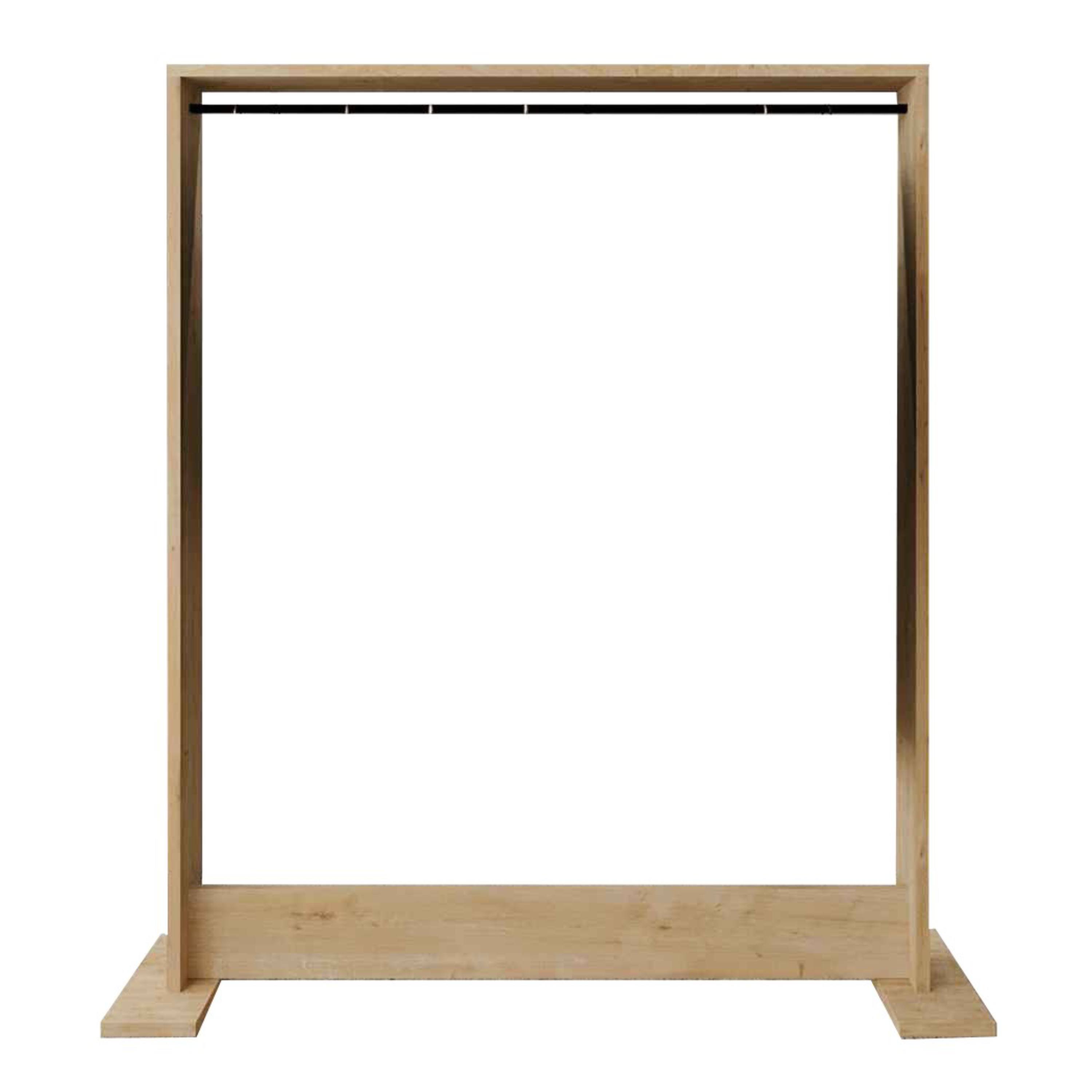 Otevřená konstrukce s pevnou šatní tyčí umožňuje pohodlné zavěšení kabátů, bund, šatů i košil, které tak zůstanou přehledně uspořádané a snadno přístupné. Stabilní základna zajišťuje potřebnou stabilitu a bezpečné používání i při plném zatížení. Stojan je vyroben z laminovaného dřevěného materiálu s povrchem nenáročným na údržbu.