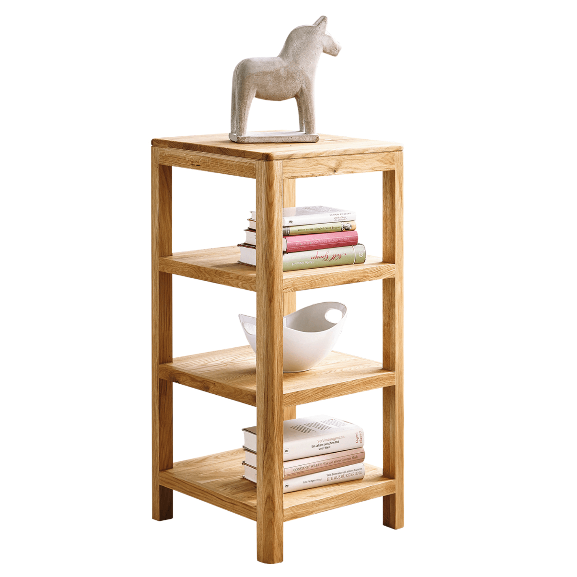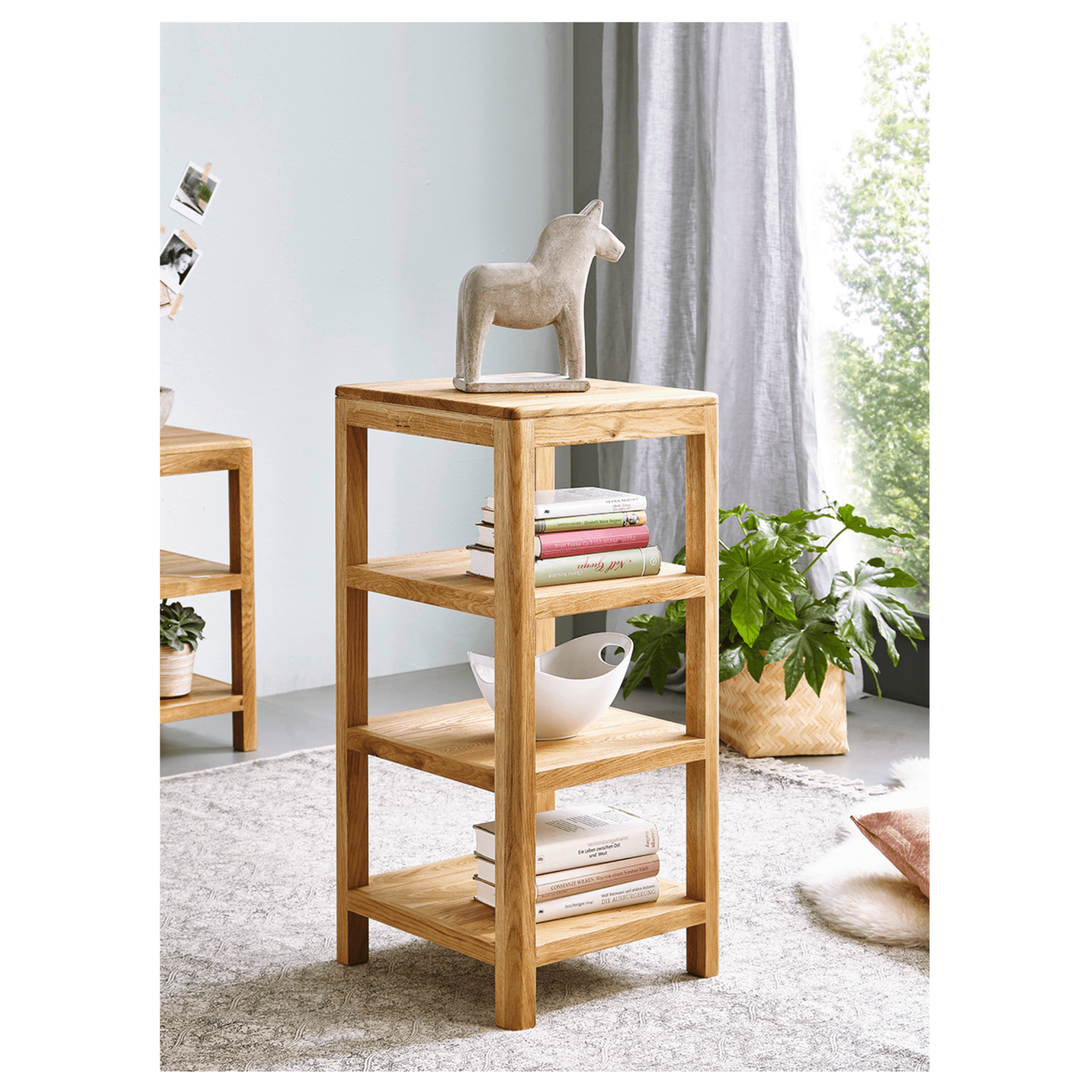 Jednoduché zpracování v přírodních tónech potěší každého milovníka minimalismu a skandinávského stylu. Stojan je dostatečně pevný a odolný jelikož je vyroben z masivního dubového dřeva. Vybavena je 3 vloženými policemi poskytujícími dostatek úložného prostoru, který může sloužit jako knihovna, prostor pro květiny nebo jako dekorativní prvek. Díky úzkému provedení šetří cenné místo a můžete vyplnit prostor, který by jinak zůstal prázdný.