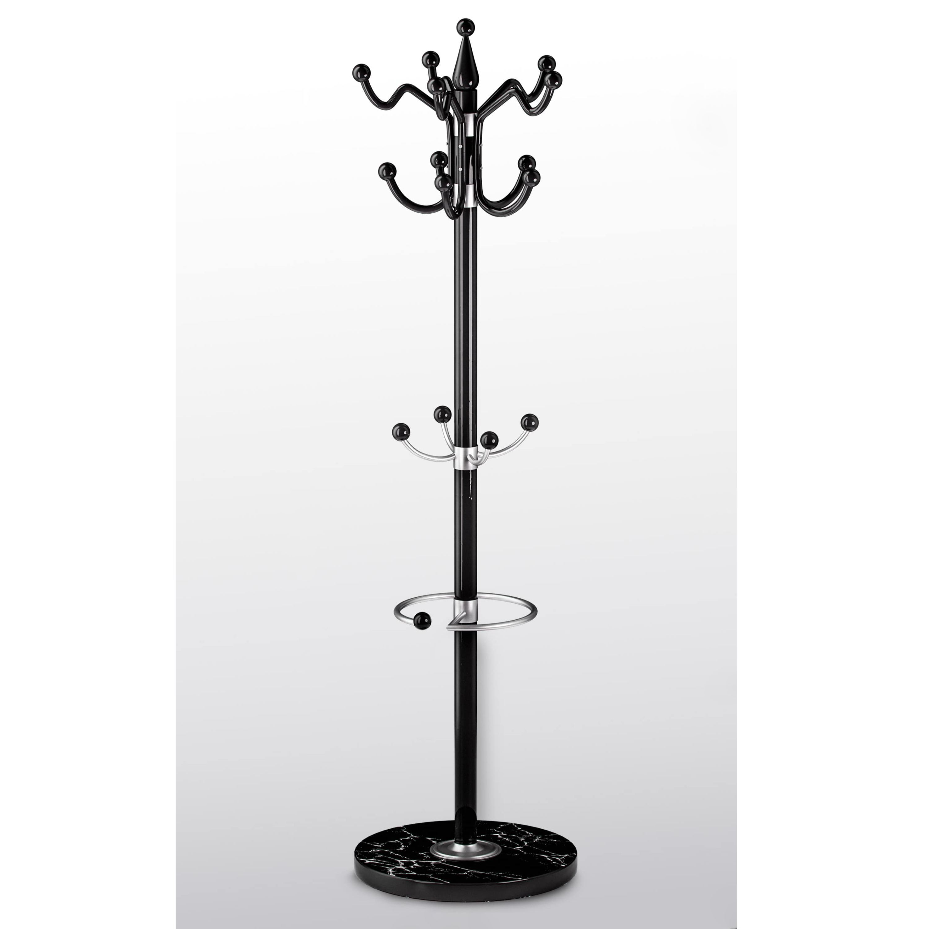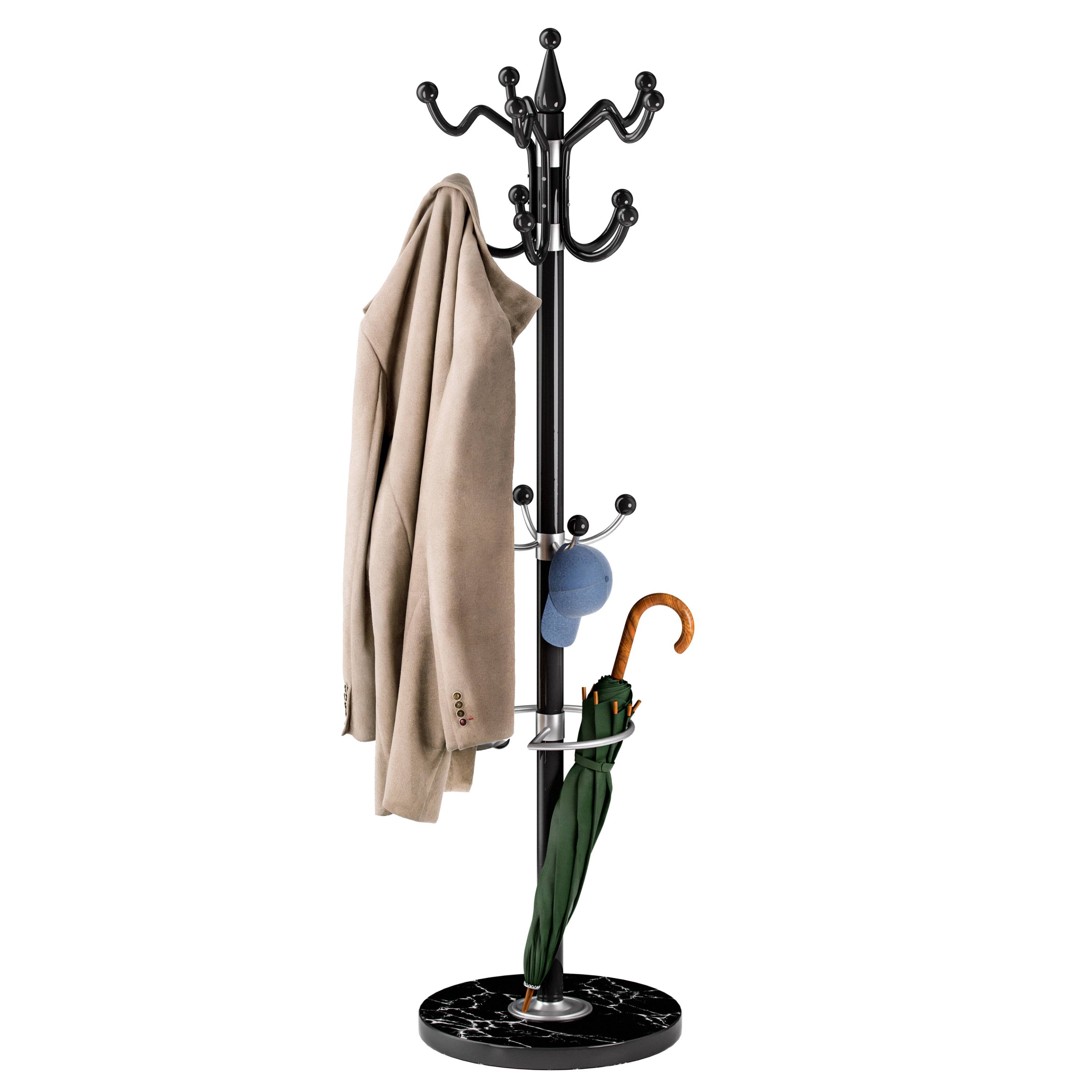 Celkem 14 háčků ve 3 úrovních poskytuje dostatek místa pro zavěšení svršků a doplňků všech členů domácnosti. Horní pětiramenná část s 10 háčky je otočná o 360°, což umožňuje pohodlný přístup ze všech stran. Poslední 4 háčky umístěné v nižší výšce jsou určeny pro ty nejmenší. Praktickým doplňkem je také integrovaný stojan na deštníky.