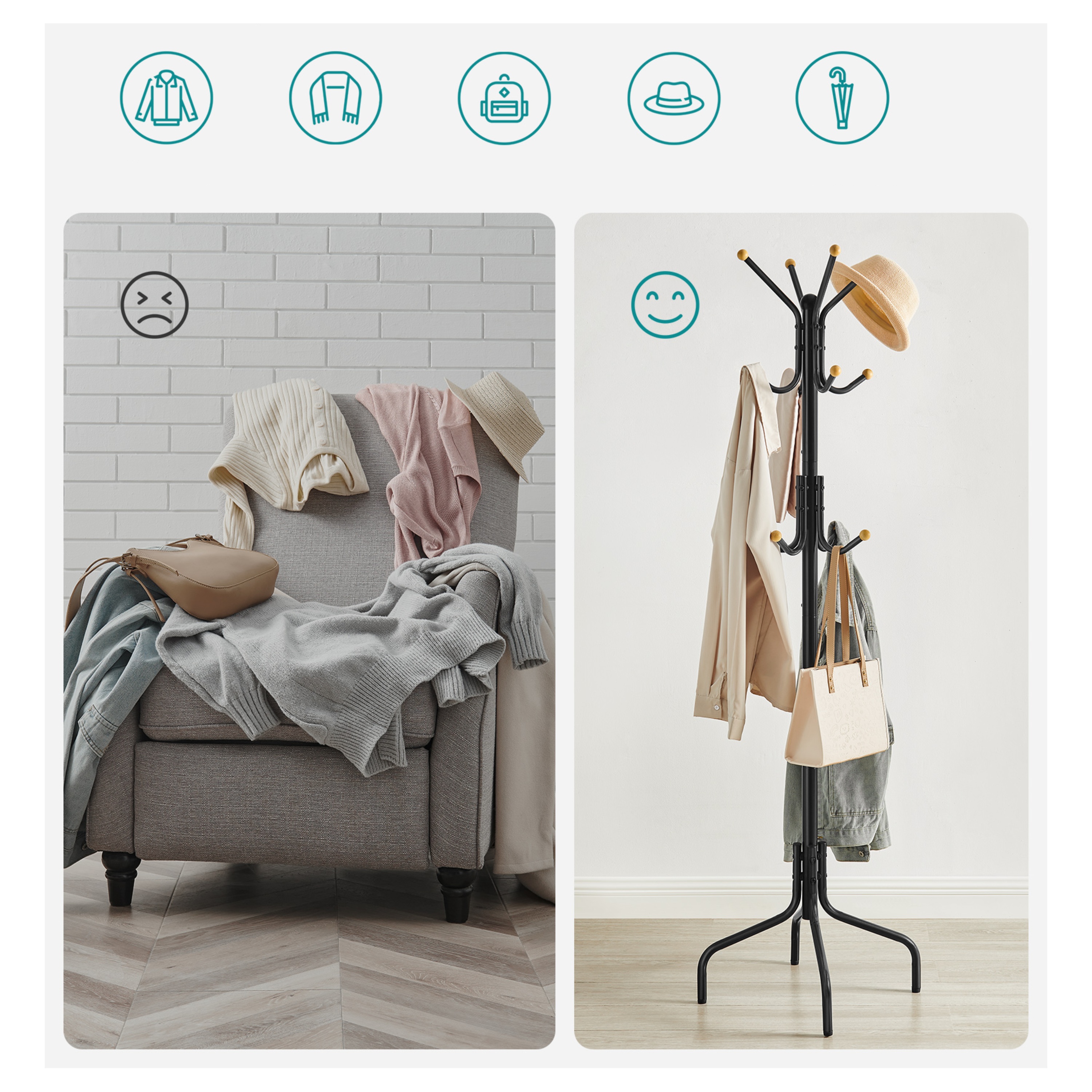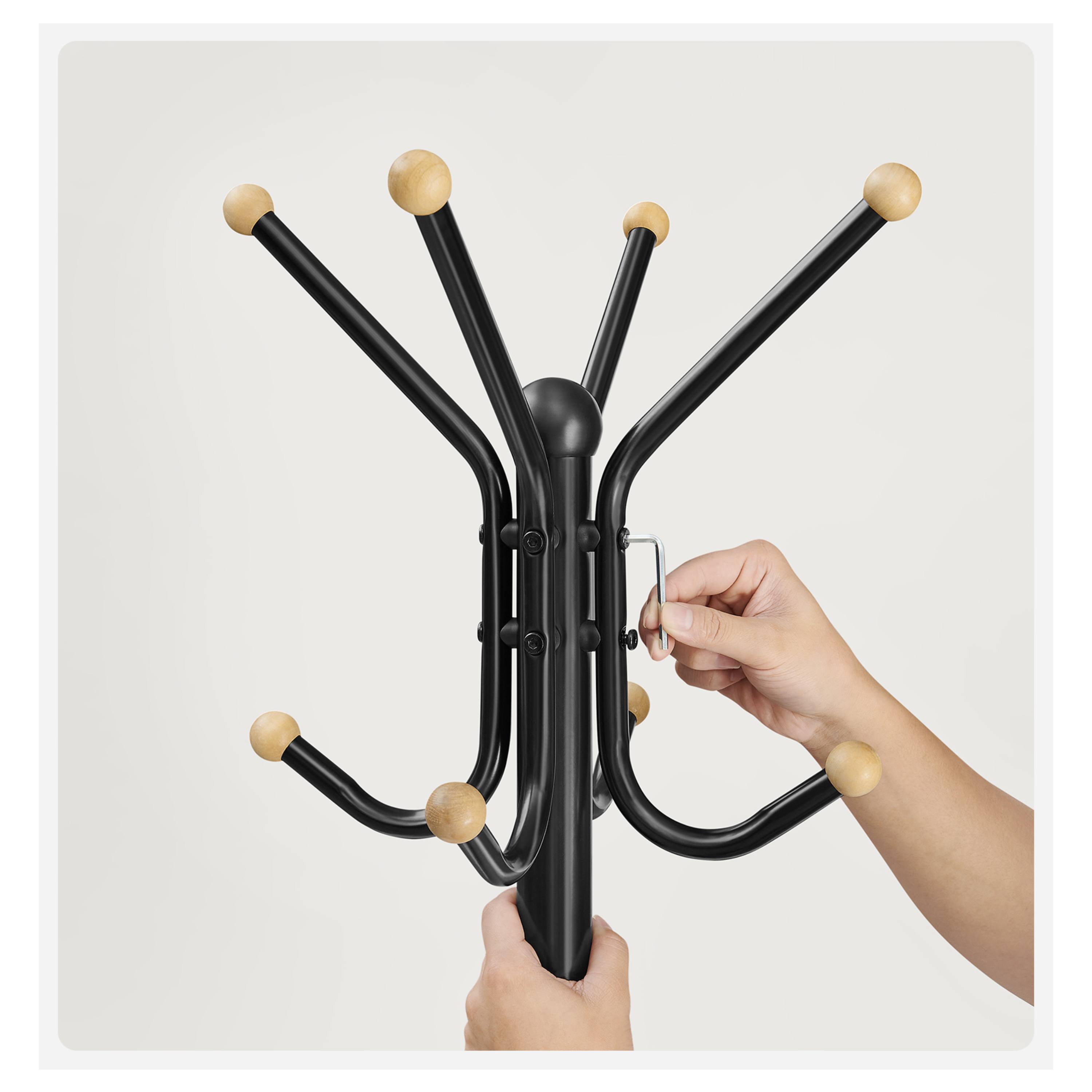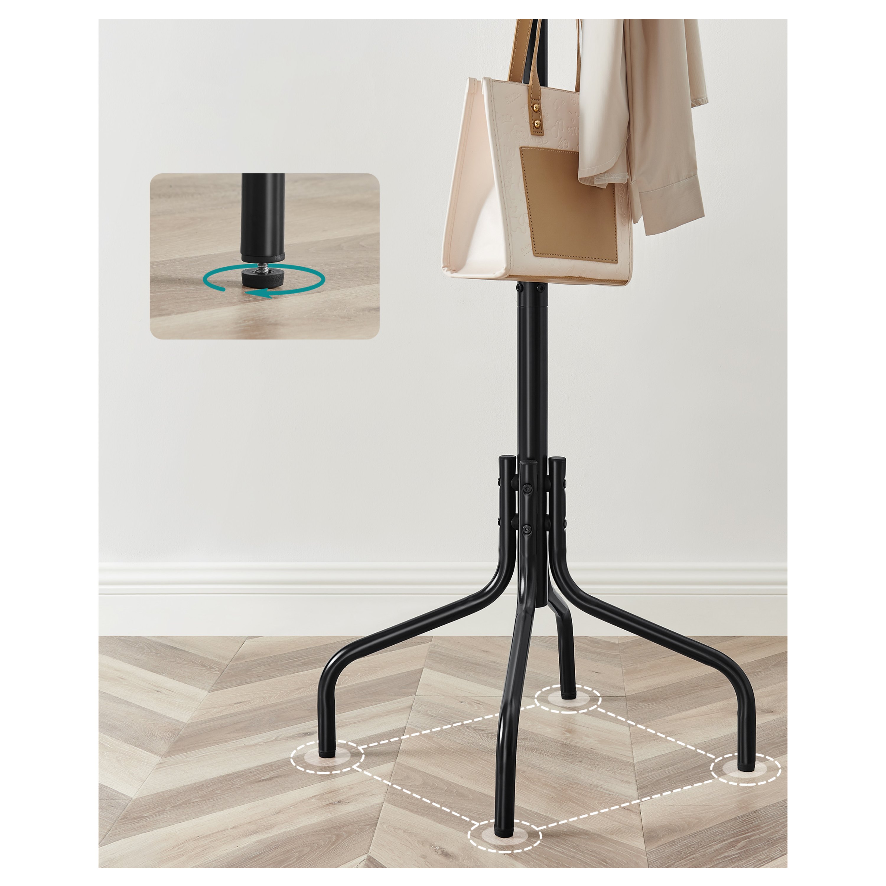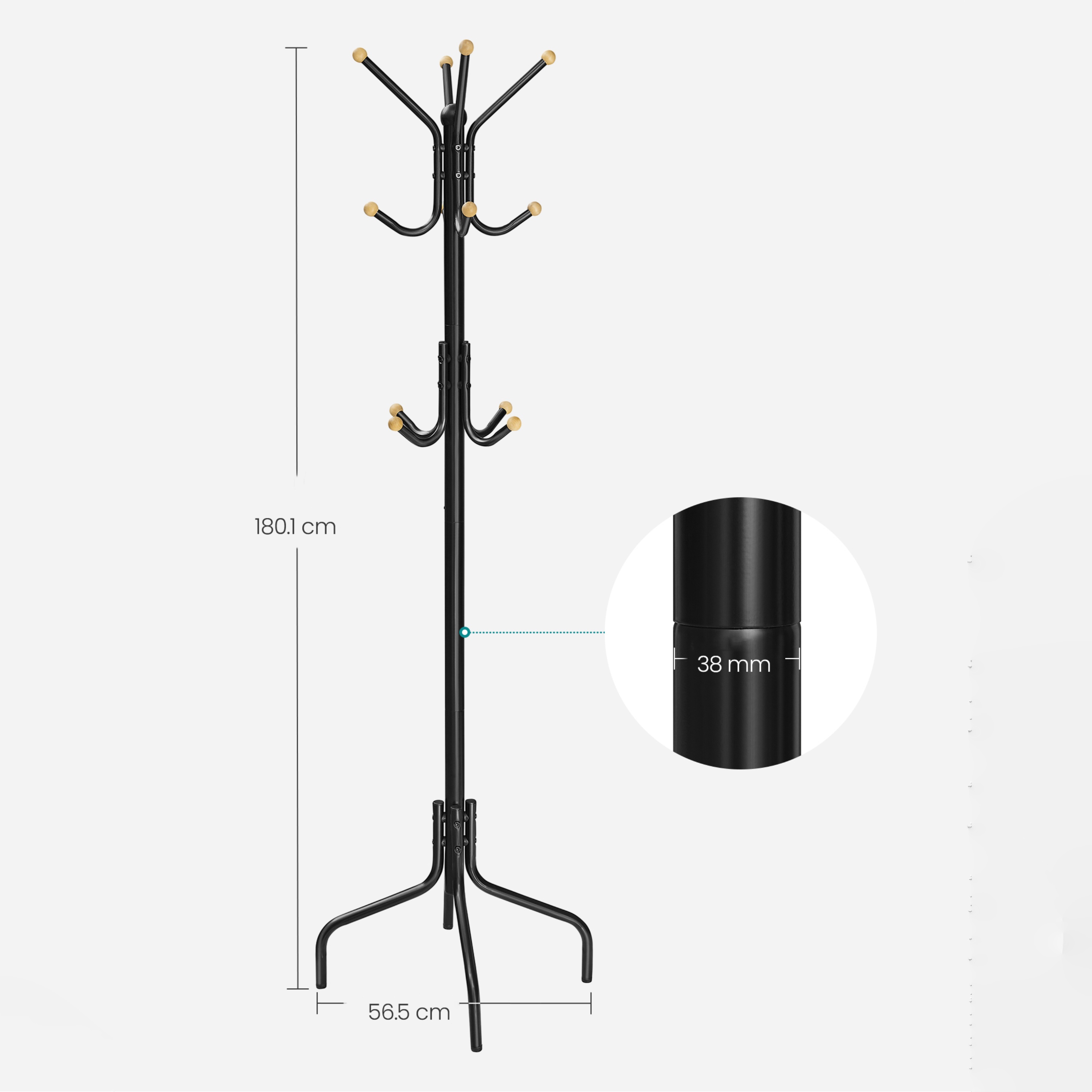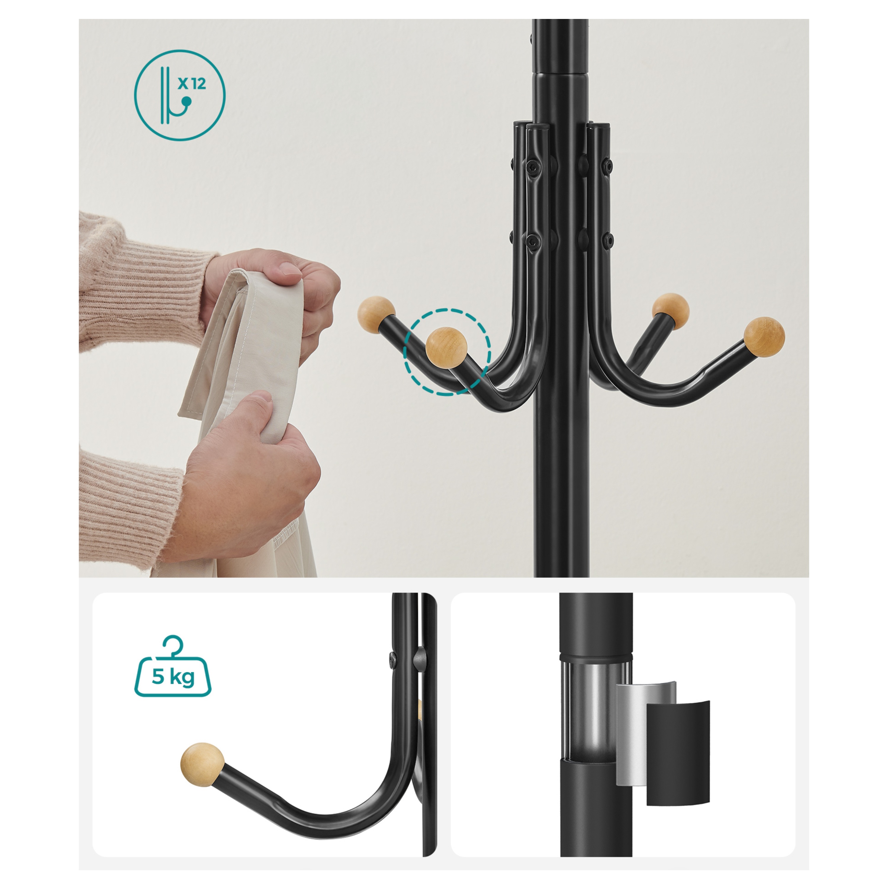 Je vybaven 12 robustními háčky s nosností až 5 kg. Jejich hladký, zakulacený tvar zabraňuje poškrábání oblečení. Má kovovou konstrukci v černé barvě, jejíž stabilitu zajišťují 4 nohy, které rovnoměrně rozkládají váhu celého věšáku. Nastavitelné nožky umožňují vyrovnání nerovností podlahy a jejich protiskluzový materiál poskytuje větší bezpečnost. Díky jednoduché konstrukci zajišťuje snadnou montáž.