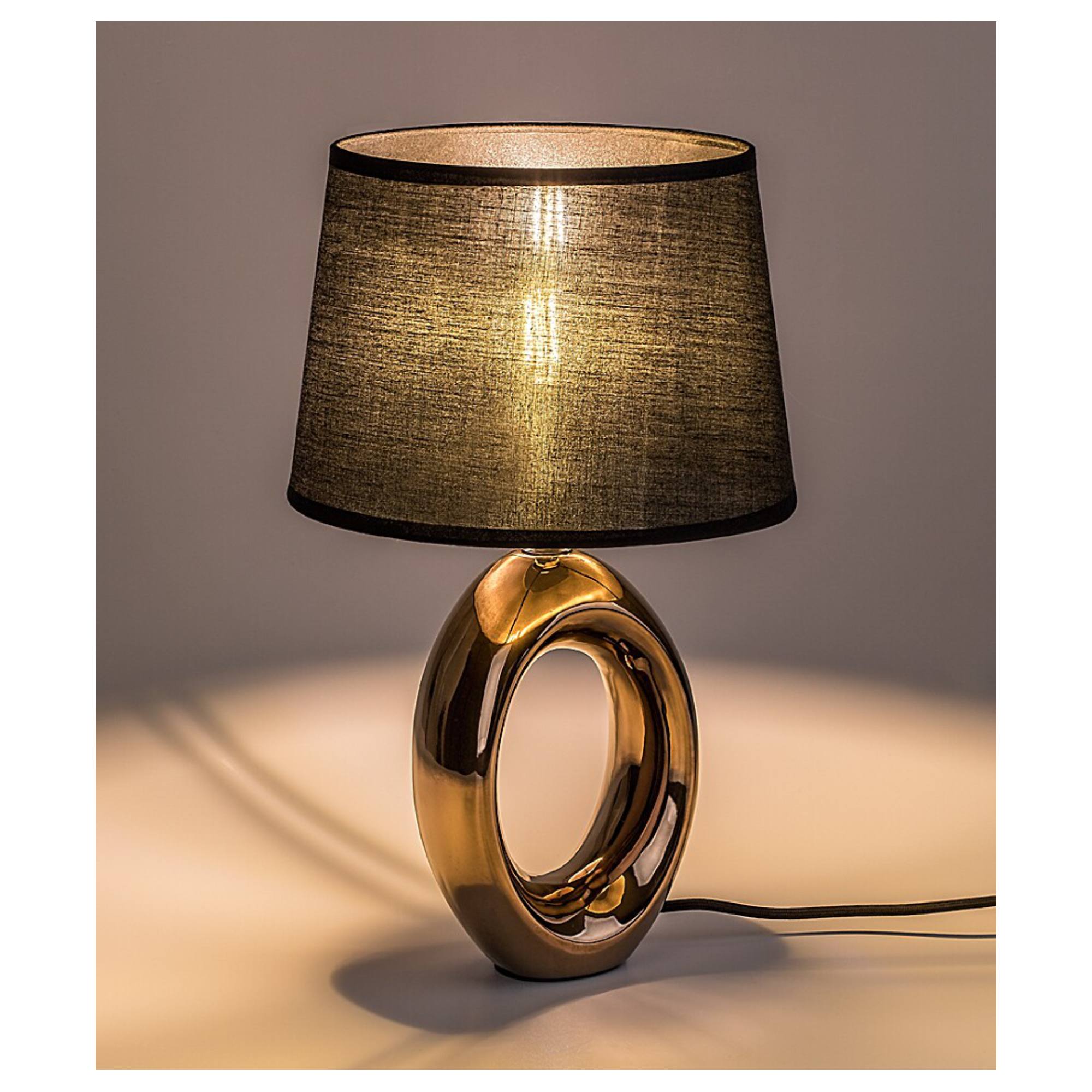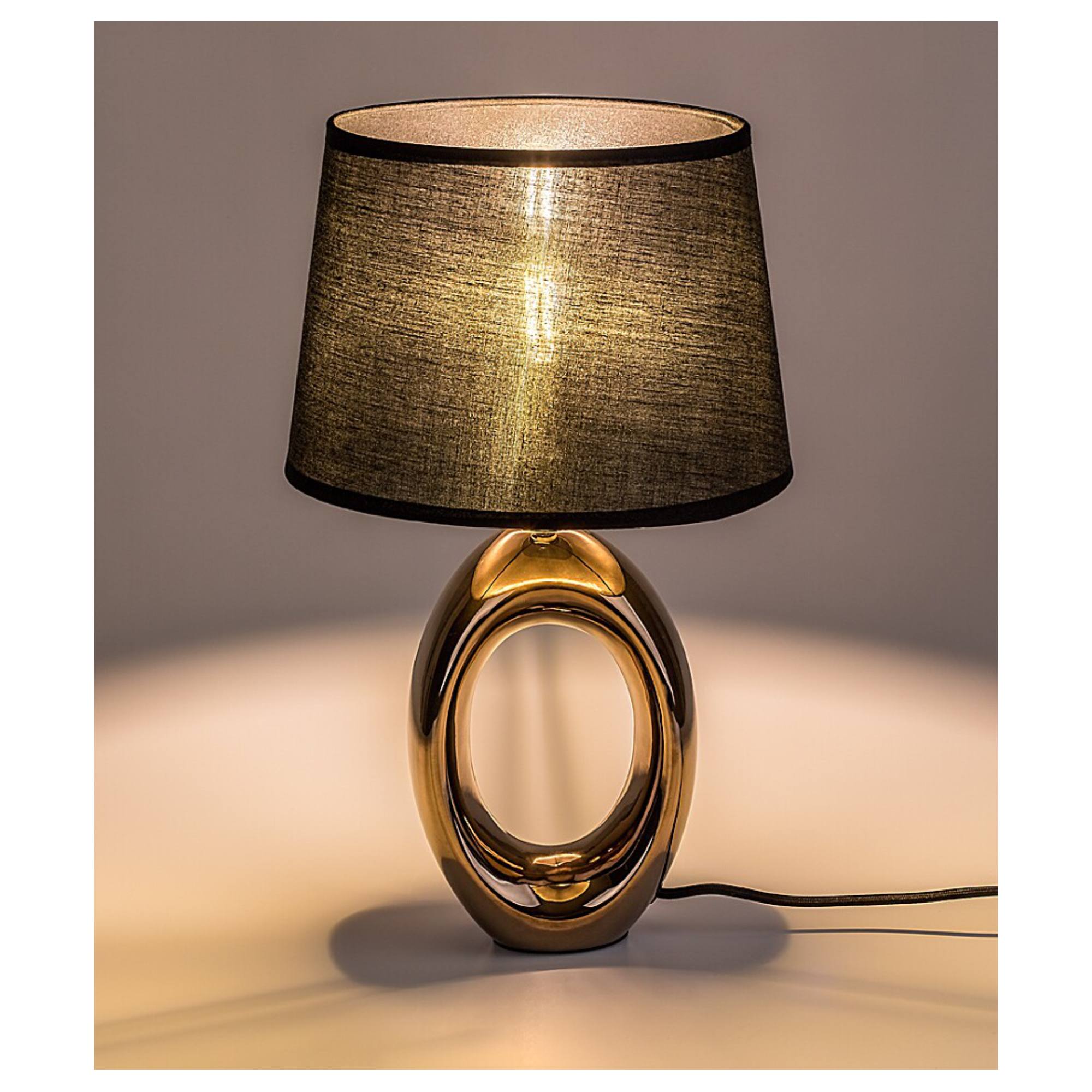 Tělo lampy je vyrobeno z keramiky v netradičním tvaru, který z ní dělá originální doplněk. V kombinaci s bronzovou barvou působí elegantně a dodává luxusní nádech. Klasické textilní stínidlo v černé barvě rovnoměrně rozptyluje světlo a vytváří příjemnou atmosféru v místnosti. Skvěle poslouží v obývacím pokoji či ložnici. Je doplněna vypínačem na přívodním kabelu o délce 160 cm pro snadné a pohodlné ovládání.