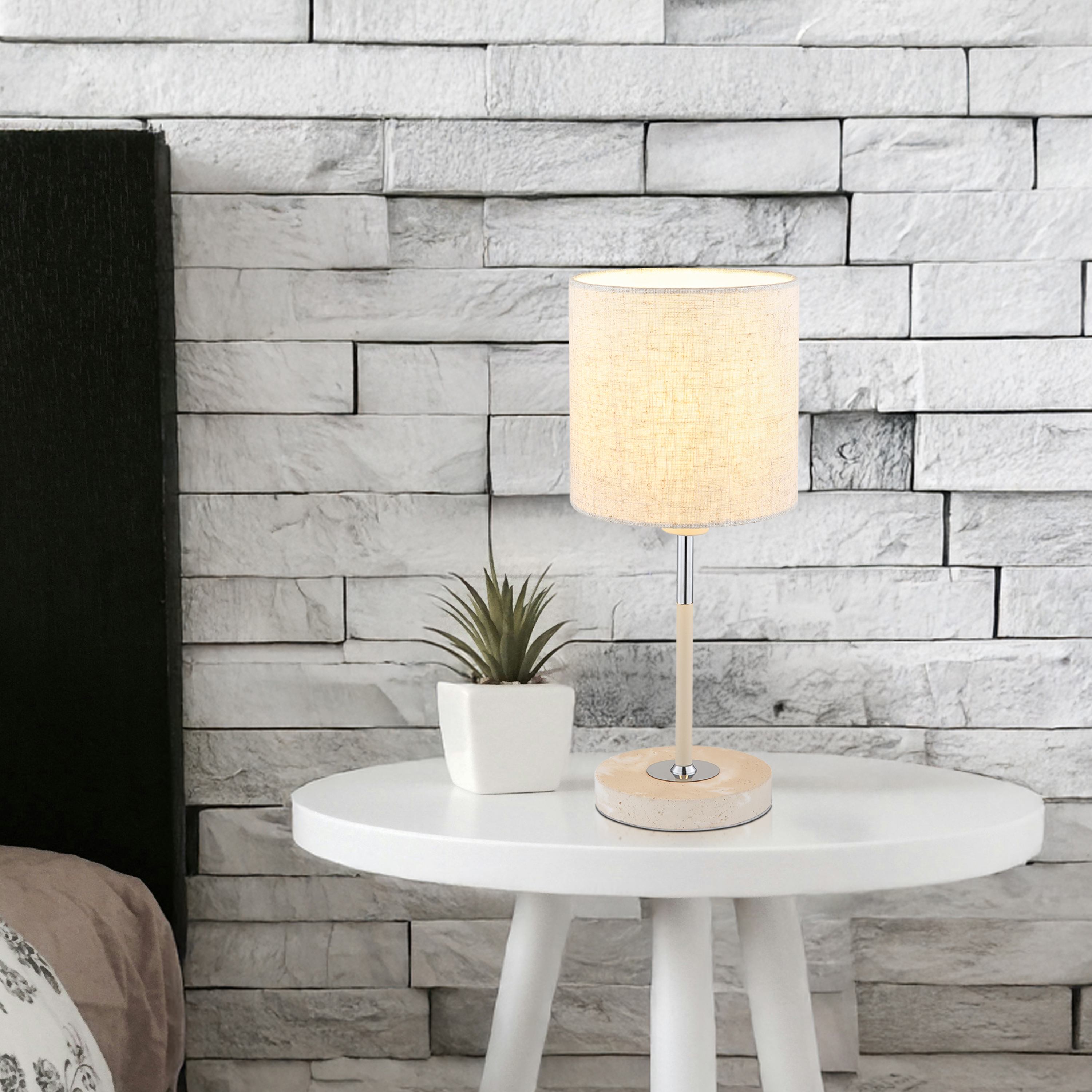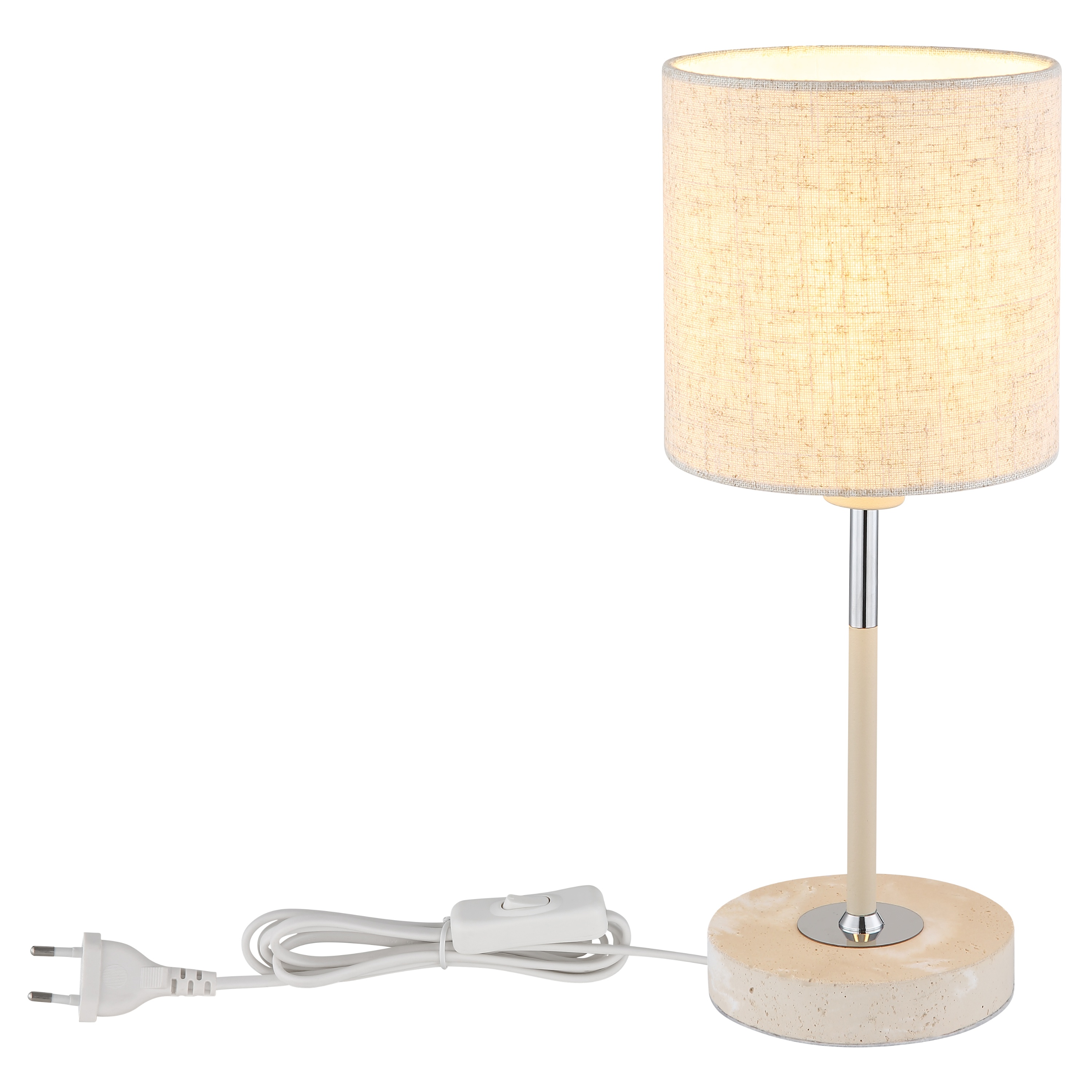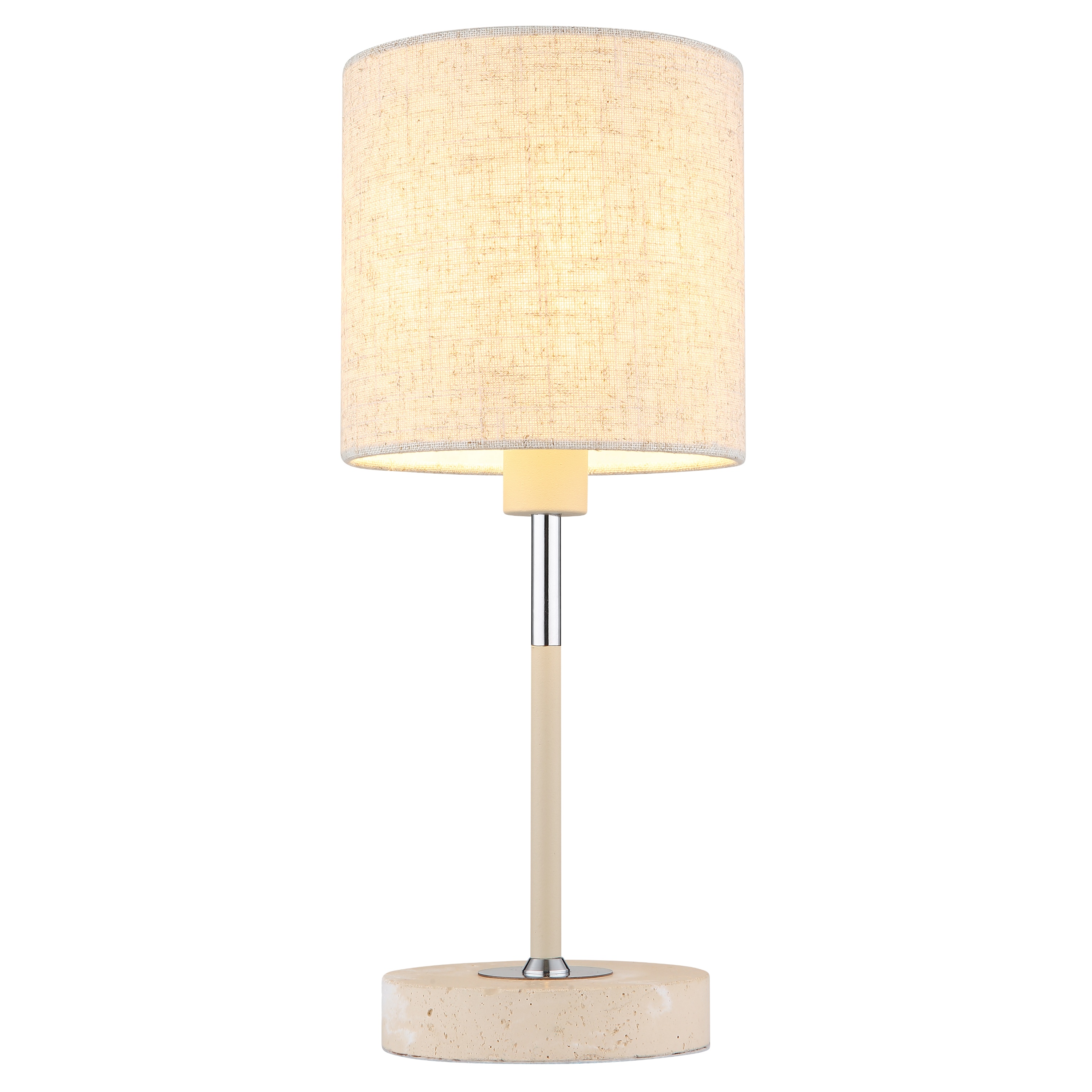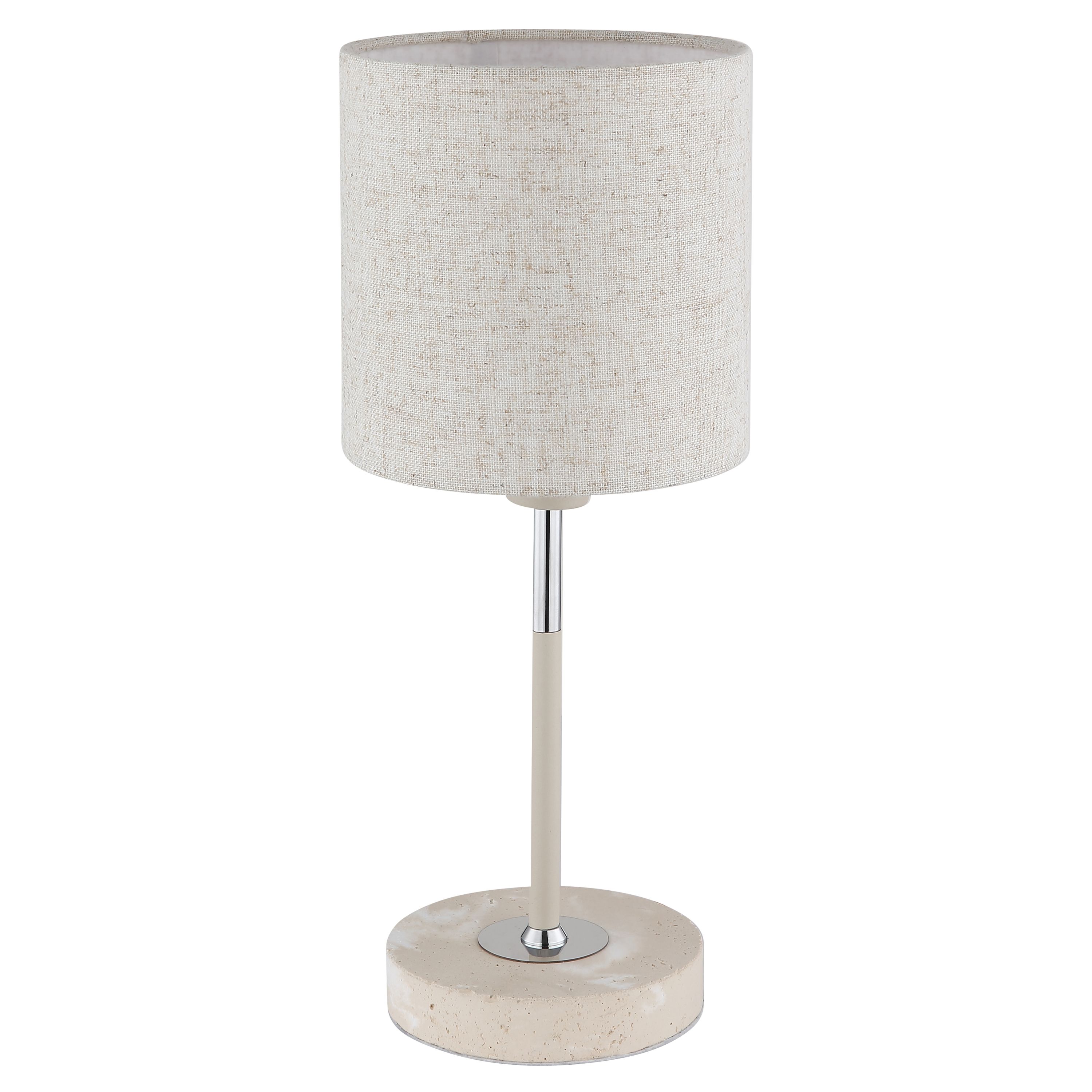 Lampa je vybavena klasickým textilním stínidlem, které poskytuje jemné, rozptýlené světlo, čímž vytváří příjemnou atmosféru v místnosti. Disponuje kovovou konstrukcí v pískové barvě a podstavcem z travertinového kamene, který podtrhuje její elegantní vzhled. Je doplněna vypínačem na kabelu o délce 150 cm pro snadné a pohodlné ovládání.