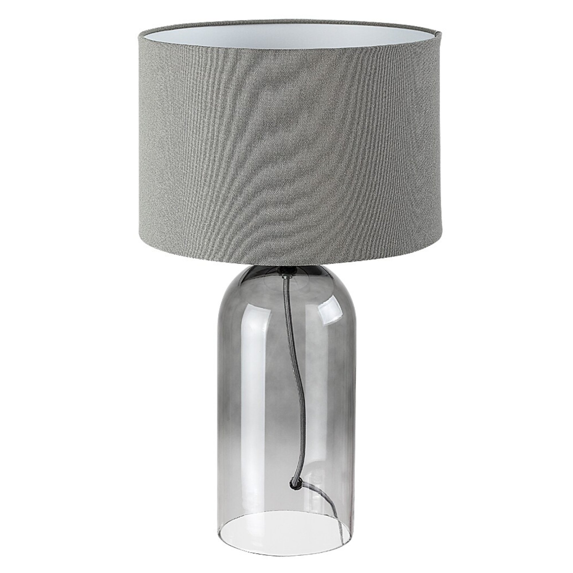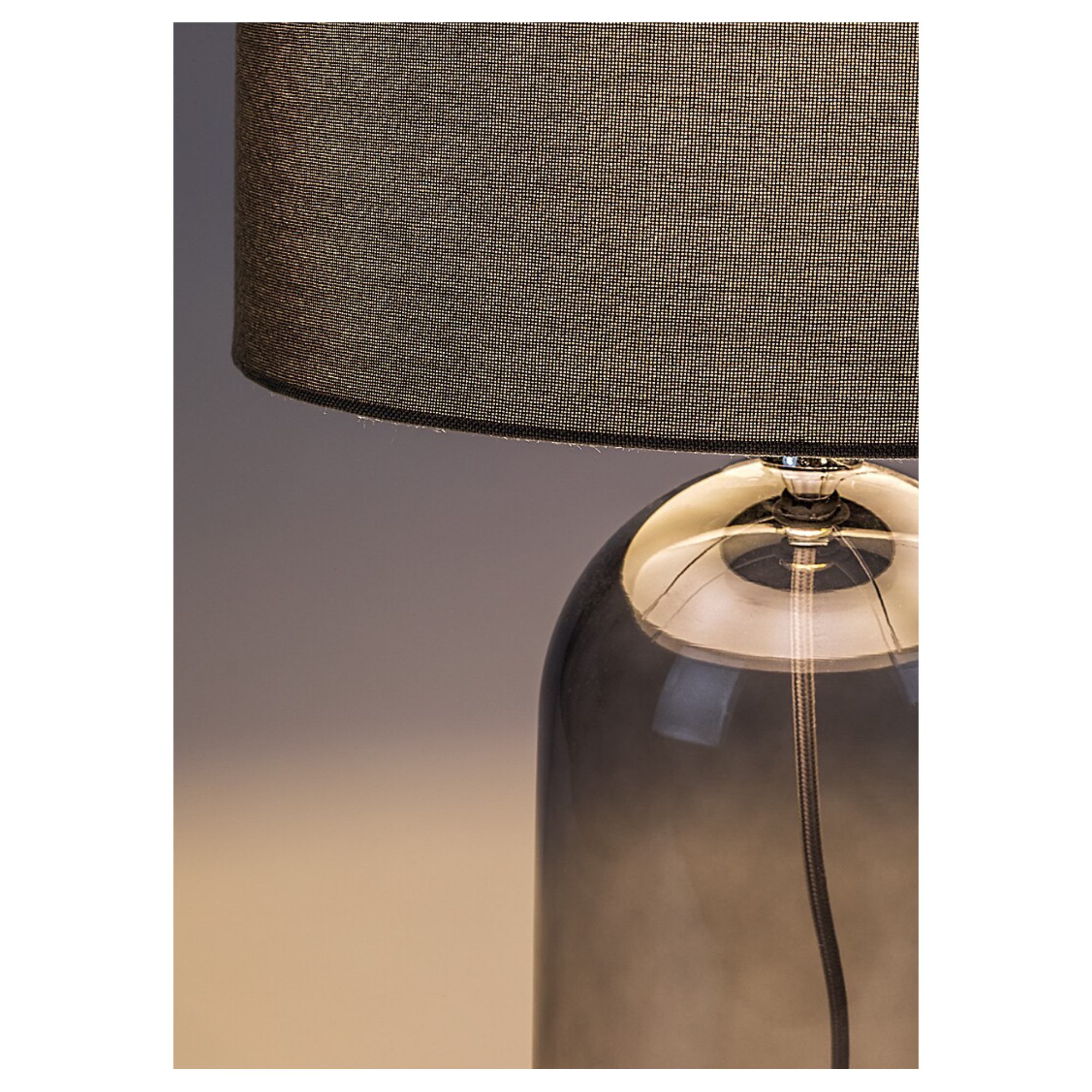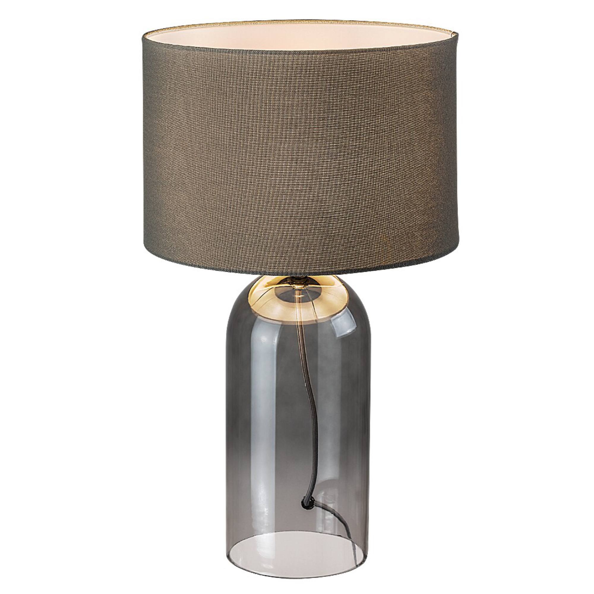 Tělo lampy je vyrobeno ze skla s kouřovým efektem, které ji dodává lehký retro nádech a originální vzhled. Klasické textilní stínidlo v šedé barvě je nepostradatelným doplňkem, který rovnoměrně rozloží světlo a dodá příjemnou atmosféru do místnosti. Díky jednoduchému, elegantnímu designu se bude vyjímat v řadě interiérů. Skvěle poslouží v obývacím pokoji či ložnici. Je doplněna vypínačem na kabelu o délce 140 cm.