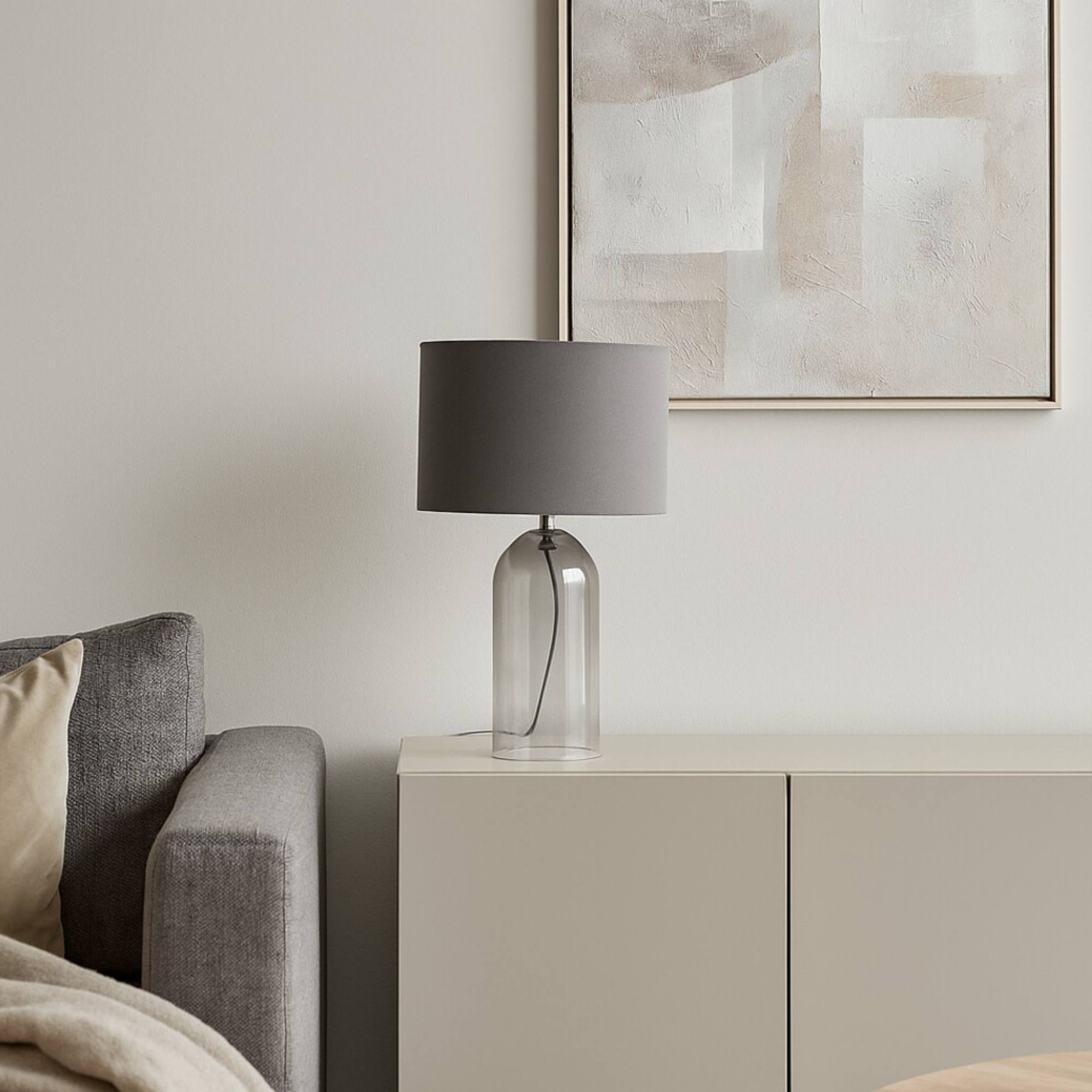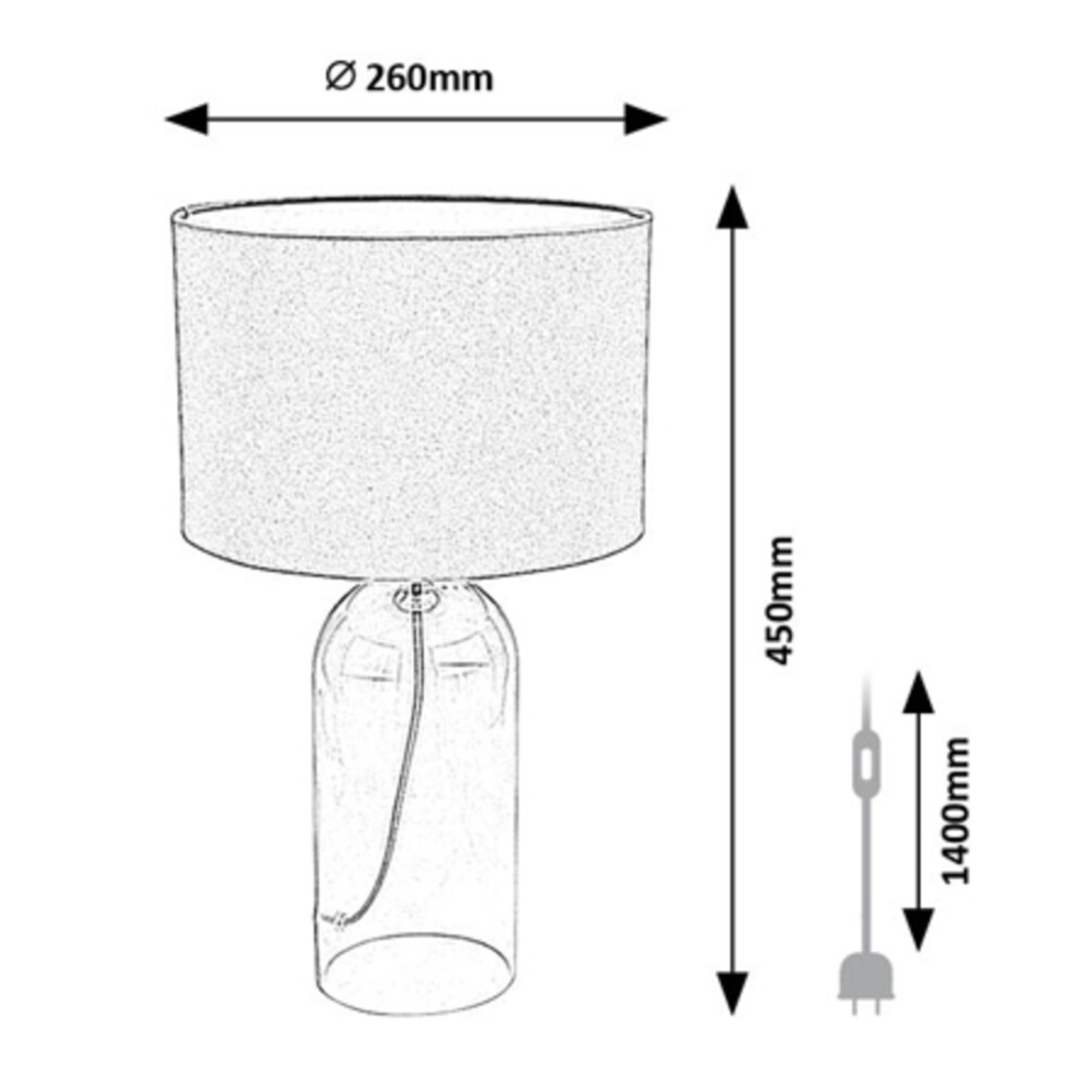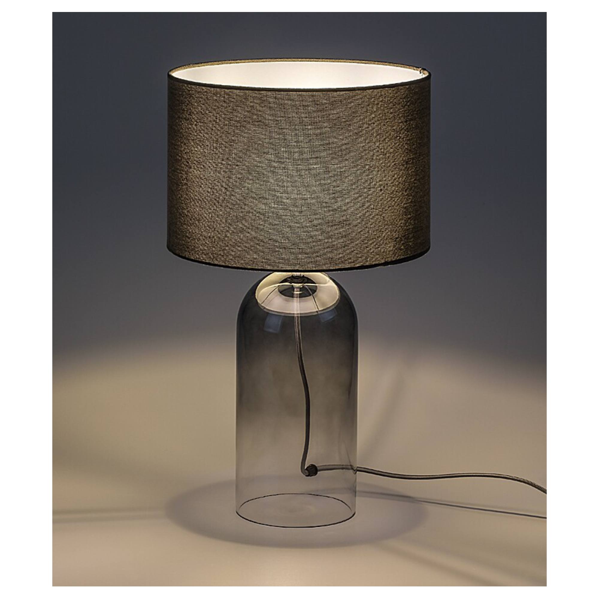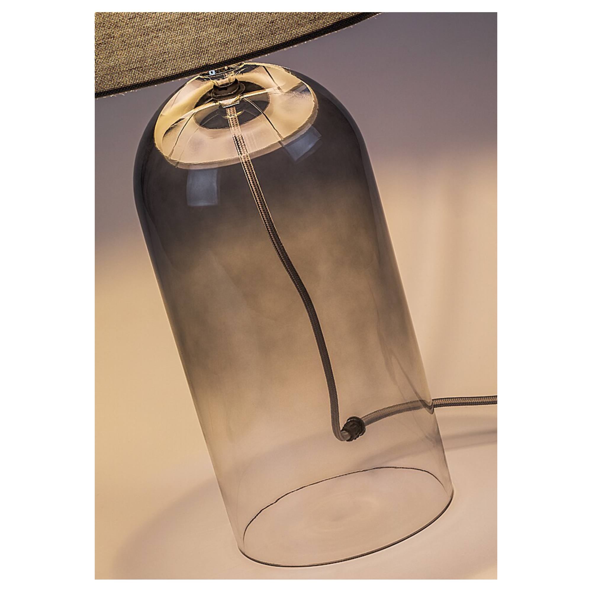 Tělo lampy je vyrobeno ze skla s kouřovým efektem, které ji dodává lehký retro nádech a originální vzhled. Klasické textilní stínidlo v šedé barvě je nepostradatelným doplňkem, který rovnoměrně rozloží světlo a dodá příjemnou atmosféru do místnosti. Díky jednoduchému, elegantnímu designu se bude vyjímat v řadě interiérů. Skvěle poslouží v obývacím pokoji či ložnici. Je doplněna vypínačem na kabelu o délce 140 cm.