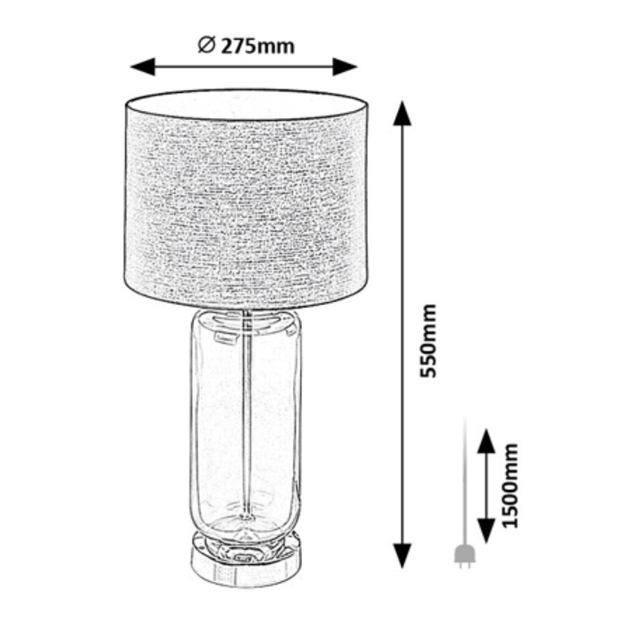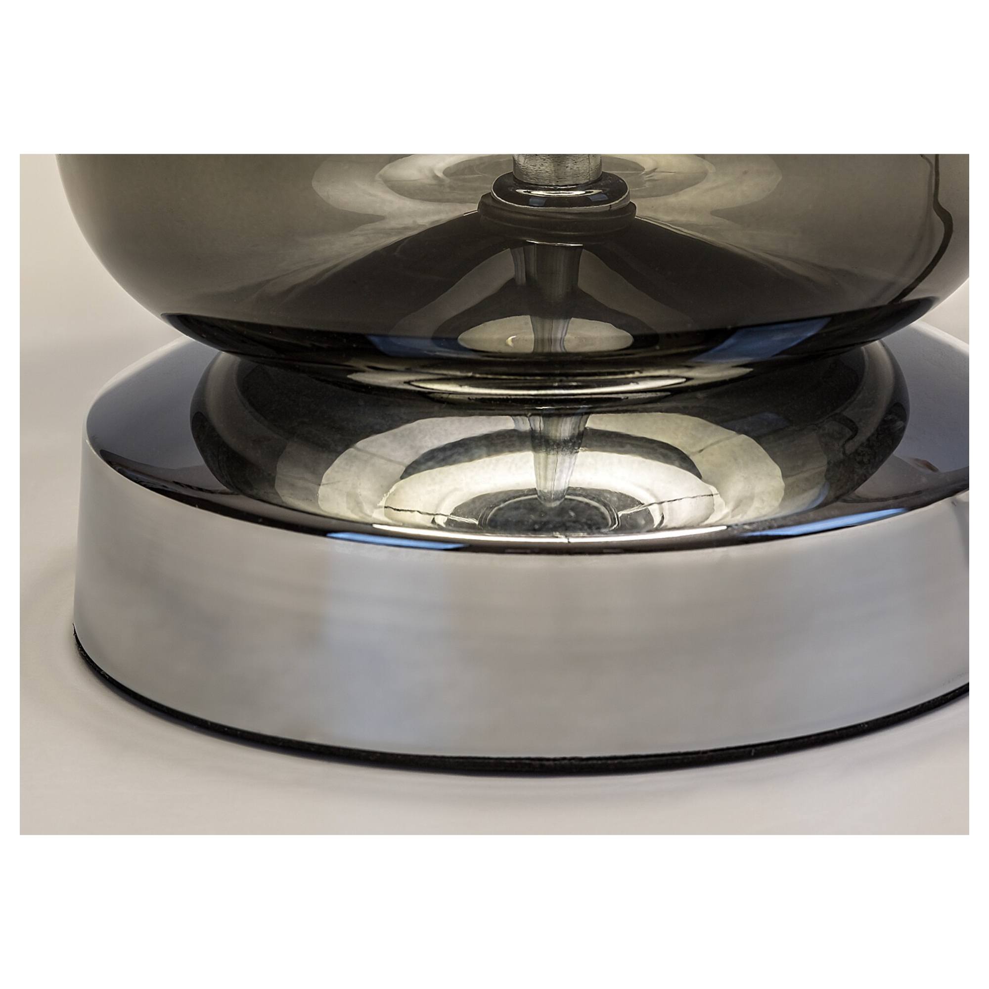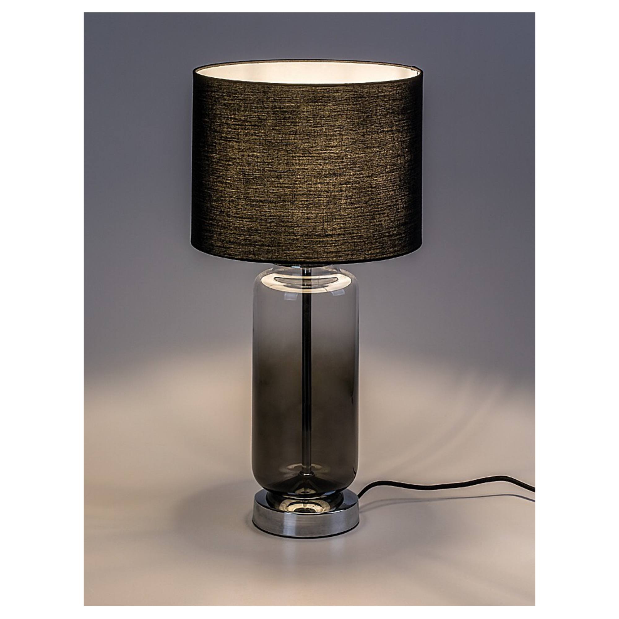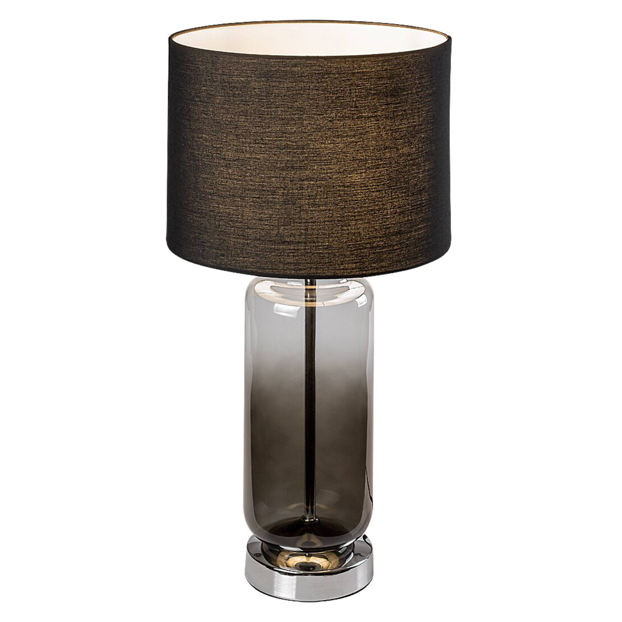 Tělo lampy je vyrobeno ze skla s kouřovým efektem a doplněno kovovým podstavcem. Tato kombinace dodává lampě lehký retro nádech a originální vzhled. Klasické textilní stínidlo v černé barvě je nepostradatelným doplňkem, který rovnoměrně rozloží světlo a dodá příjemnou atmosféru do místnosti. Díky jednoduchému, elegantnímu designu se bude vyjímat v řadě interiérů. Skvěle poslouží v obývacím pokoji či ložnici. Je doplněna vypínačem na kabelu o délce 150 cm.