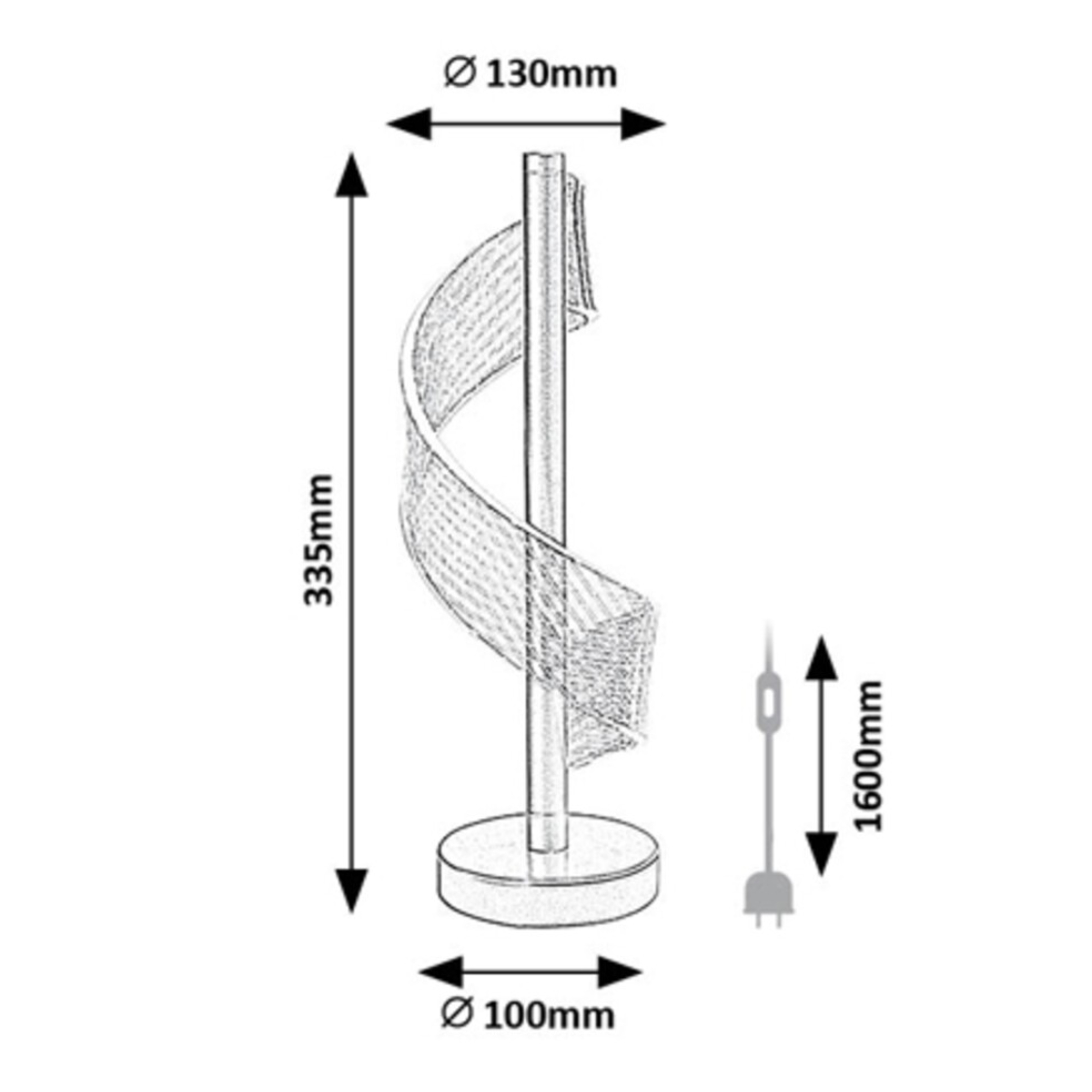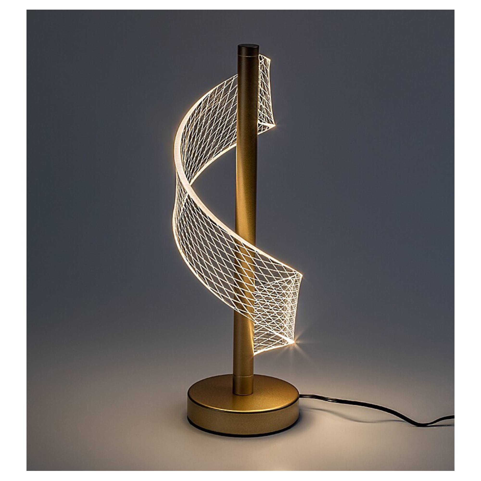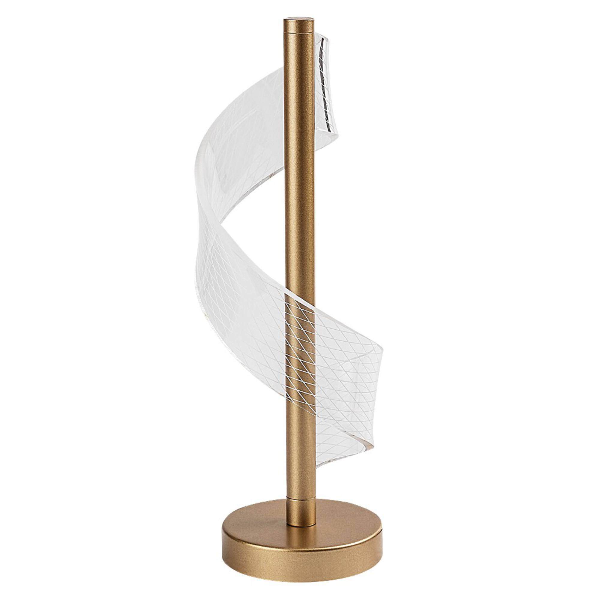 Zaujme na první pohled svým designovým stínidlem, které tvoří dominantní prvek lampy. Skládá se z kovové tyče ve zlaté barvě, kolem které se jako stuha ladně omotává stínidlo z průhledného akrylu. Akryl je navíc doplněn jemným vzorem, jež vytváří příjemné atmosférické osvětlení. Má jednoduchou kulatou základnu, která zajišťuje stabilitu. Je vybavena vypínačem na kabelu o délce 160 cm.