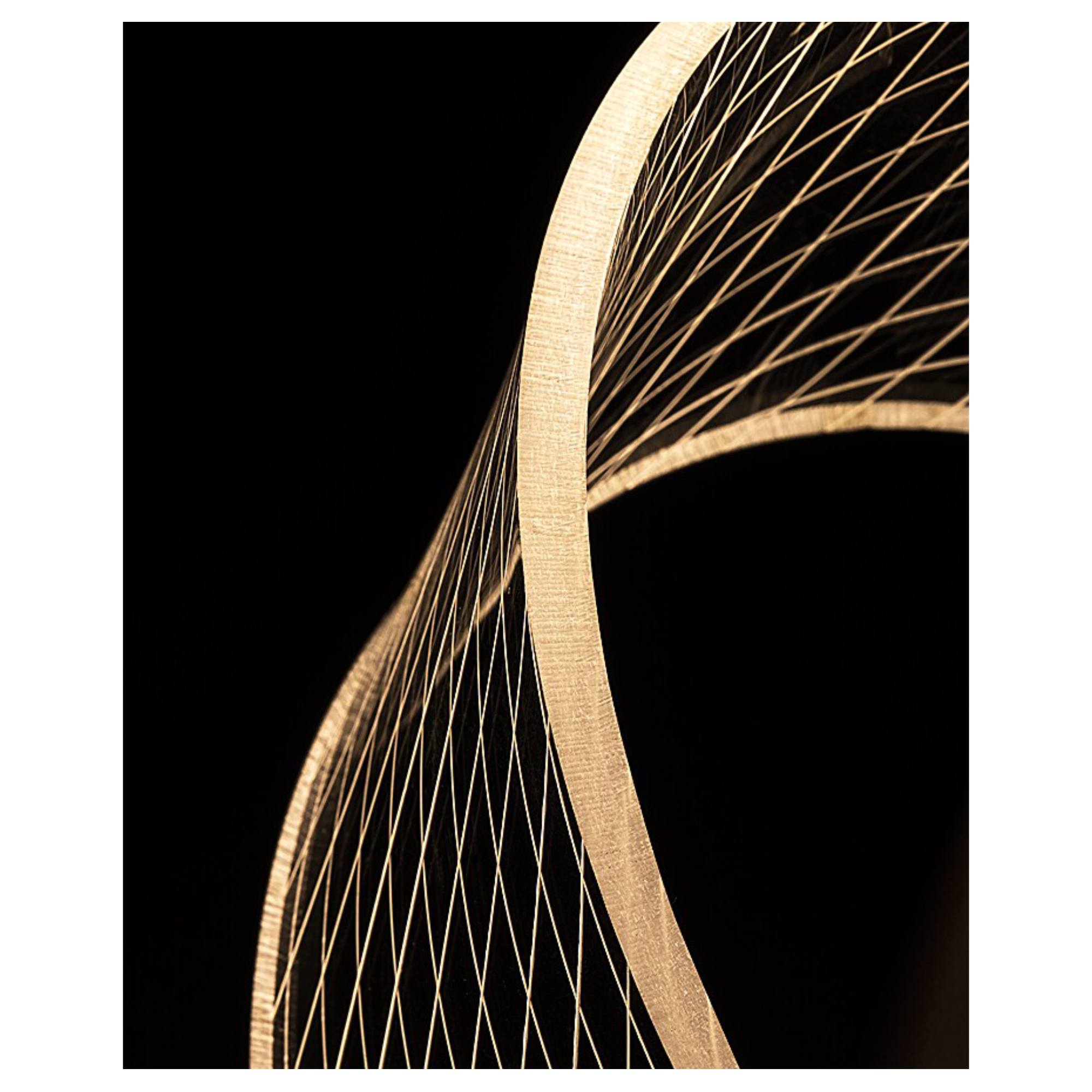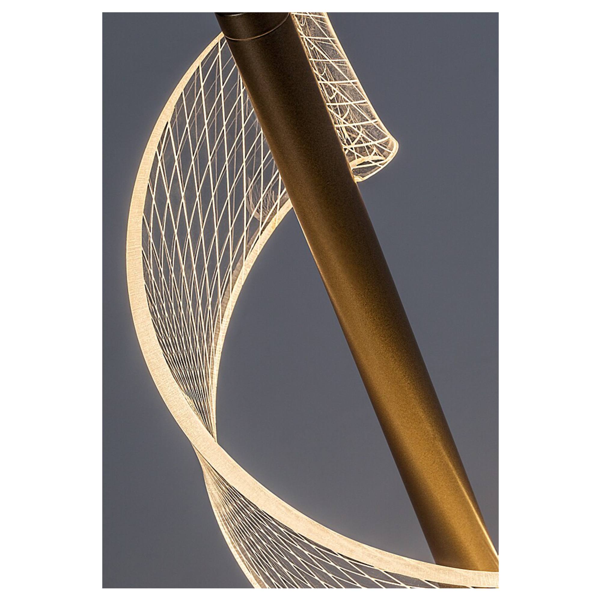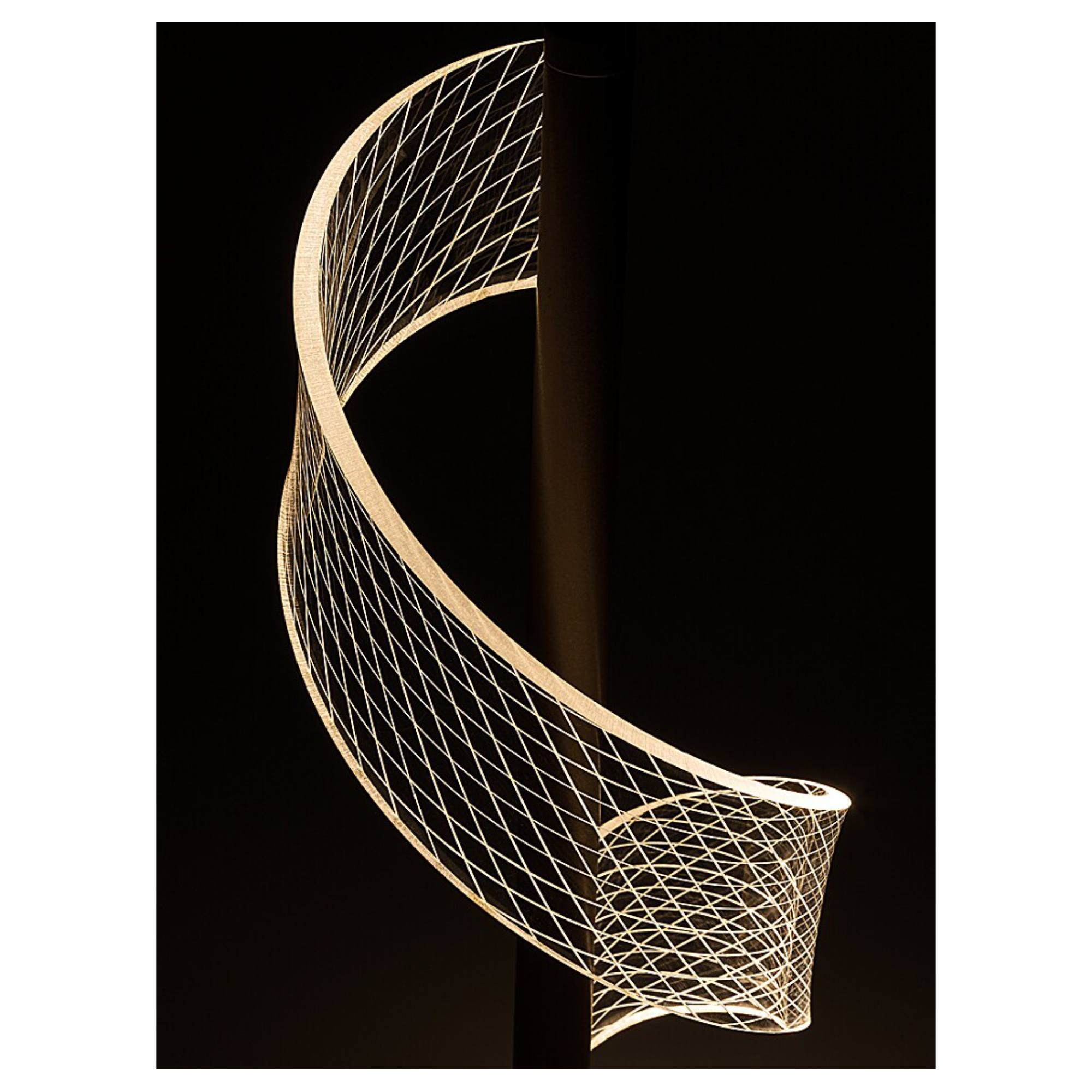 Zaujme na první pohled svým designovým stínidlem, které tvoří dominantní prvek lampy. Skládá se z kovové tyče ve zlaté barvě, kolem které se jako stuha ladně omotává stínidlo z průhledného akrylu. Akryl je navíc doplněn jemným vzorem, jež vytváří příjemné atmosférické osvětlení. Má jednoduchou kulatou základnu, která zajišťuje stabilitu. Je vybavena vypínačem na kabelu o délce 160 cm.