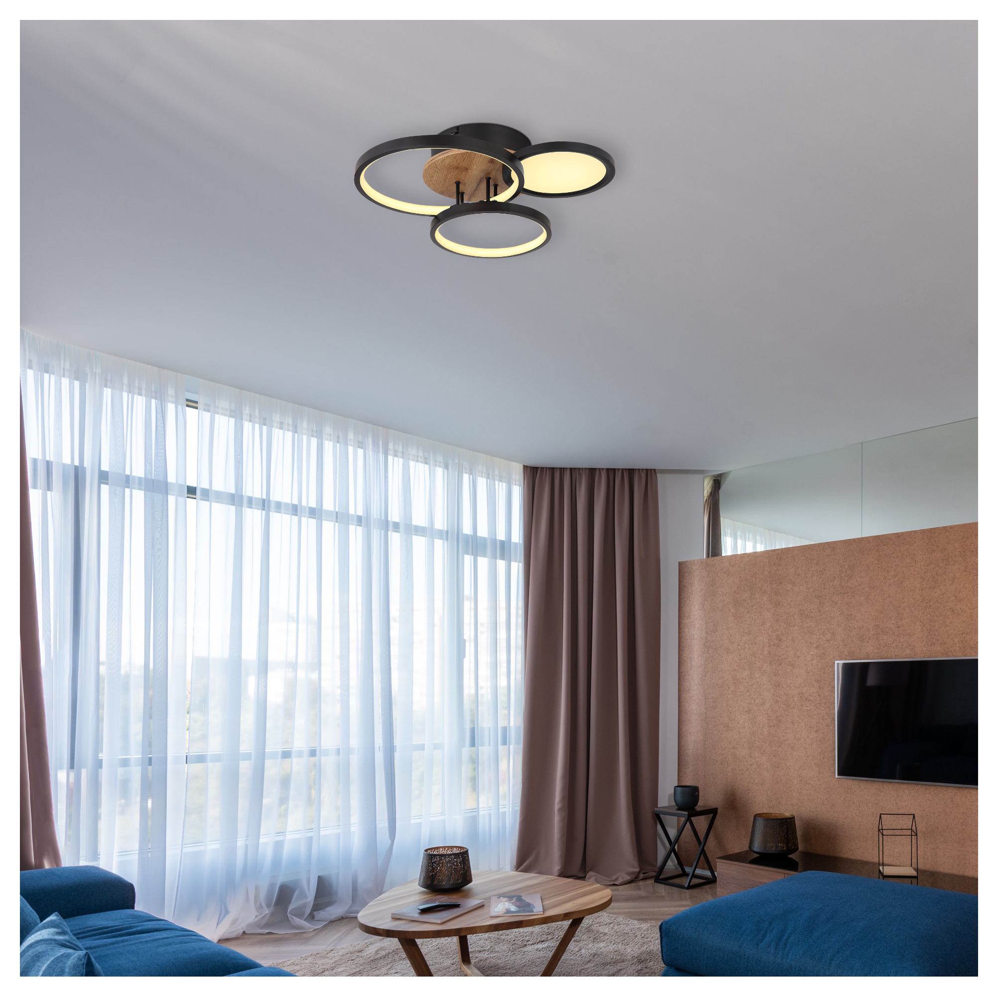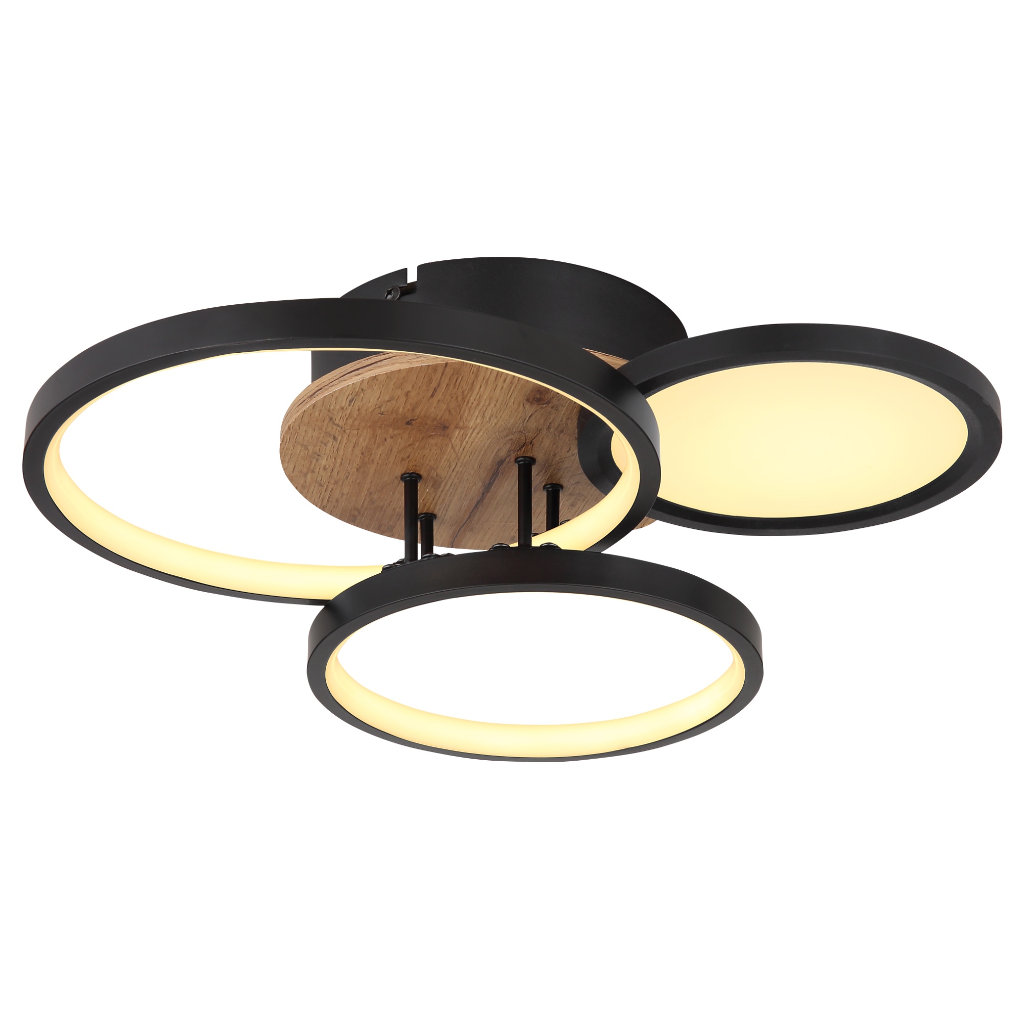 Jeho unikátní vzhled je tvořen 3** kruhovými stínidly různých velikostí**, které společně vytvářejí zajímavou asymetrii. Černý kovový rám dodává svítidlu elegantní nádech, zatímco bílé plastové části zajišťují rovnoměrné rozptýlení světla. Podstava z MDF materiálu imitujícího dřevo přidává svítidlu přírodní a teplý prvek, který doplňuje jeho minimalistický design.