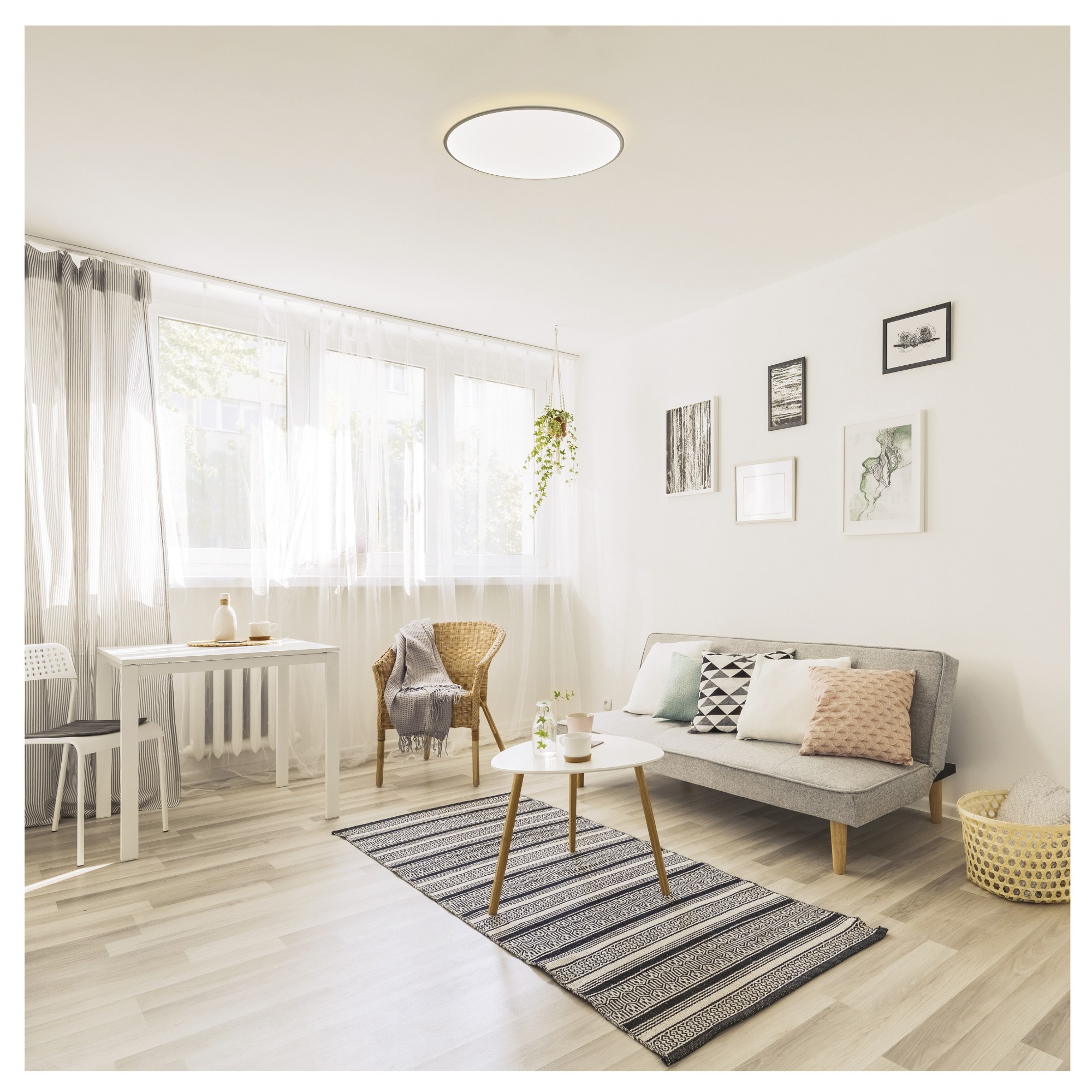 Má kovovou konstrukci v kulatém tvaru o průměru 50 cm. Balení obsahuje bílý i stříbrný rám, takže si můžete přizpůsobit design podle svých preferencí. Za bílým plastovým stínidlem se ukrývá integrovaný LED světelný zdroj s maximálním příkonem 36W. Zdroj má světelný tok 140 až 2880 lumenů s volitelnou teplotou světla 2700 až 6500 Kelvinů. Díky funkci stmívání si snadno zvolíte intenzitu světla podle potřeby. Je také vybaveno nočním režimem s nízkou intenzitou pro poklidný večer. Časovač umožní nastavení vypnutí v daném intervalu 30 nebo 60 minut.