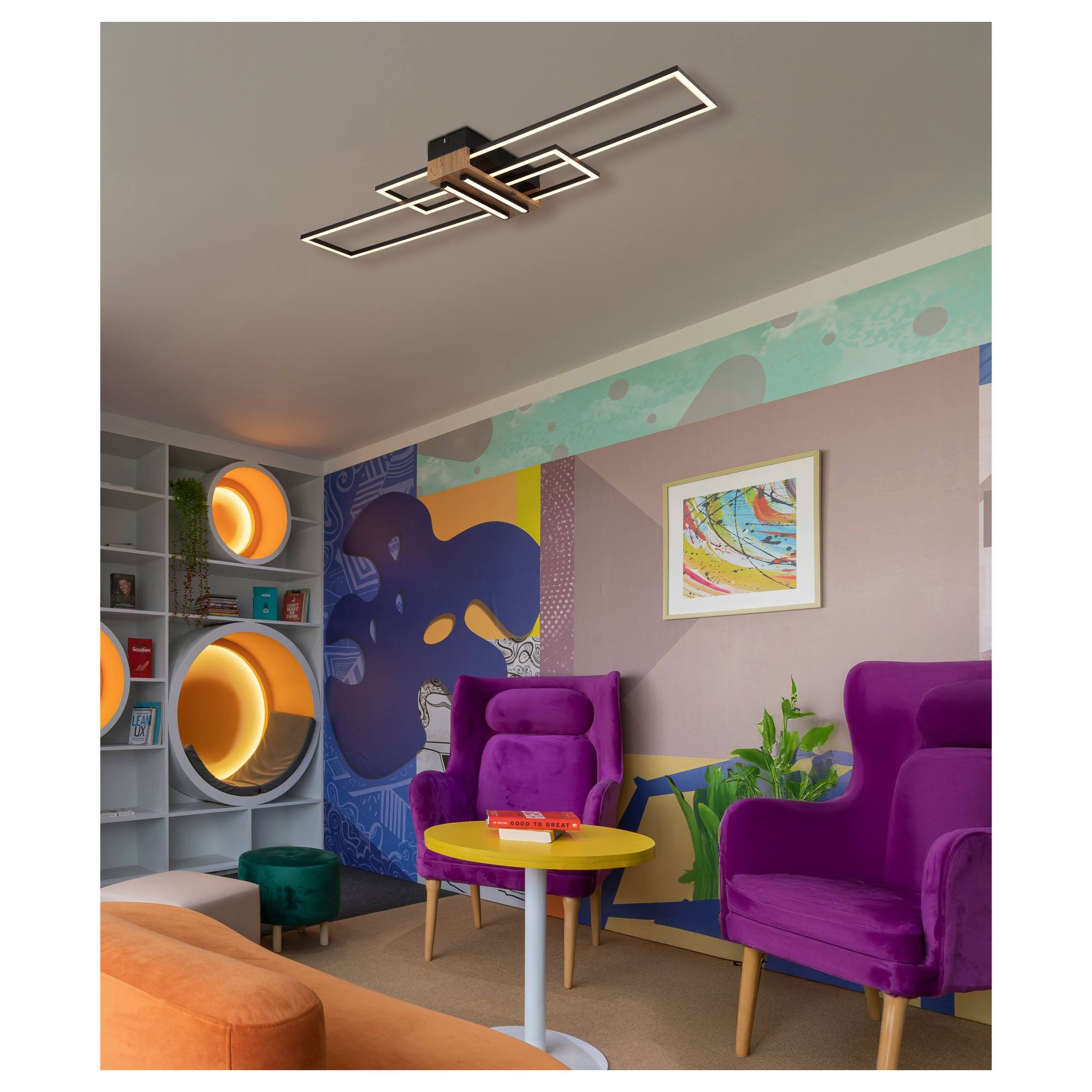 Má černou kovovou konstrukci doplněnou o dřevovláknitou MDF desku s dekorem tmavého dřeva. Zaujme svou šířkou 100 cm, díky které je ideálním osvětlením do větších místností. Jeho unikátní stínidla z něj vytvářejí nejen praktický, ale také stylový doplněk.