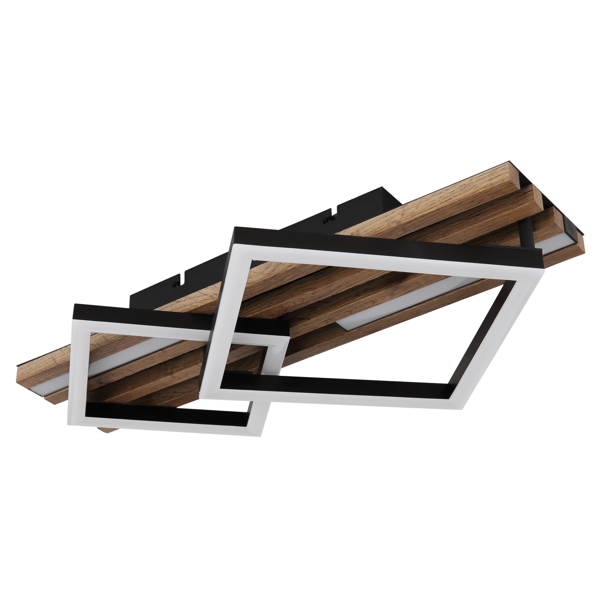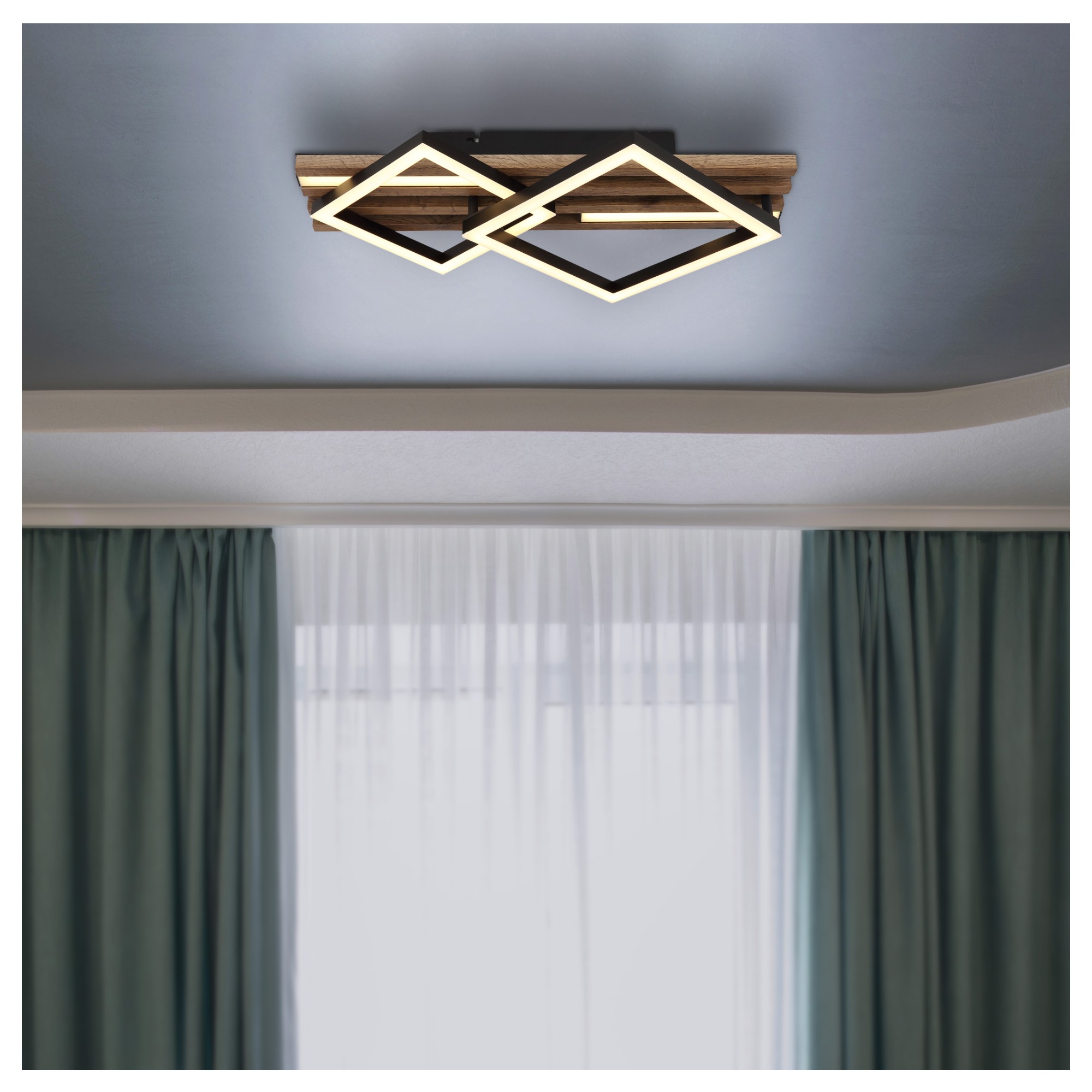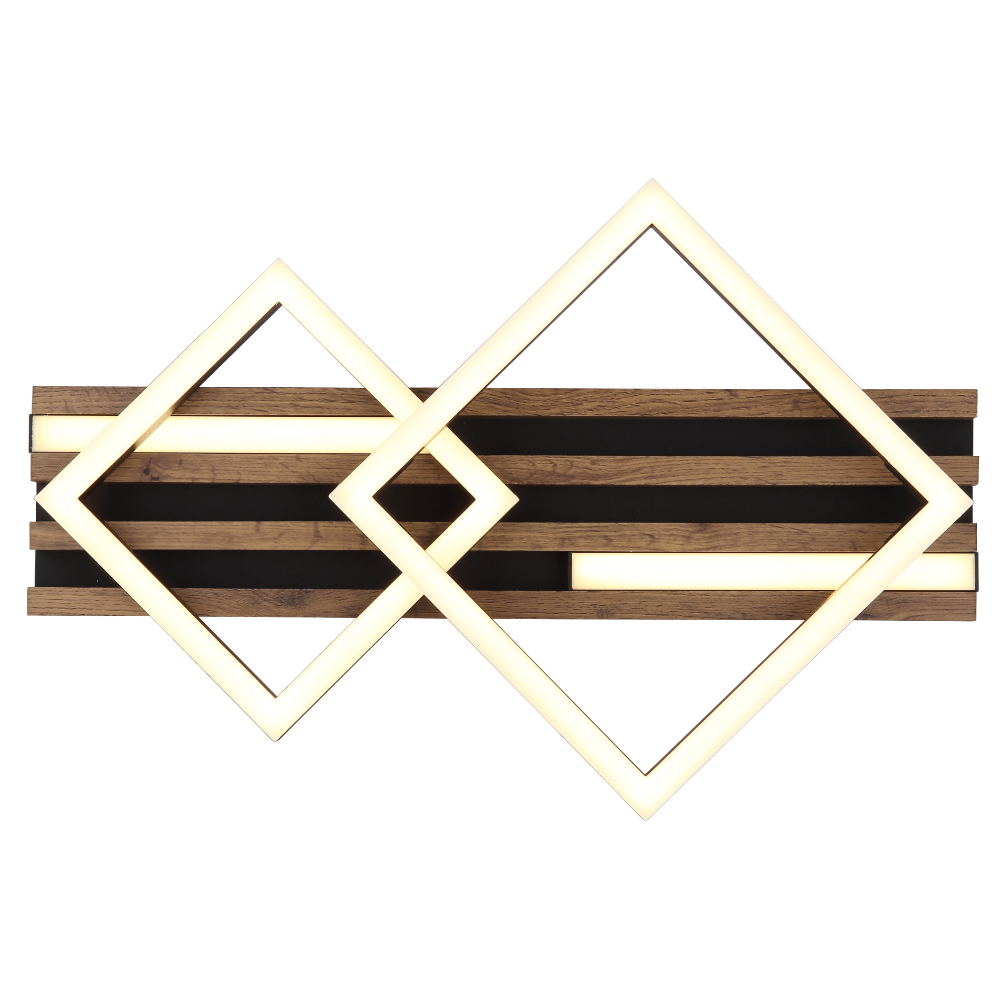 Zaujme na první pohled svým poutavým designem. Má černou kovovou konstrukci, která je doplněna lamelami z pevné dřevovláknité MDF desky s dekorem tmavého dřeva. Ten dodá do místnosti nádech přírody. Mezi lamelami jsou umístěny 2 podlouhlé LED panely a na nich 2 čtverce.
