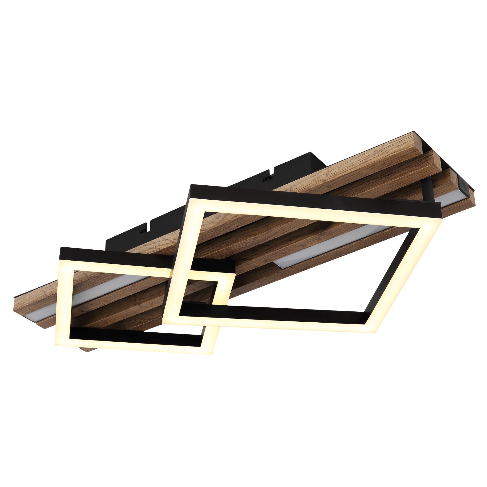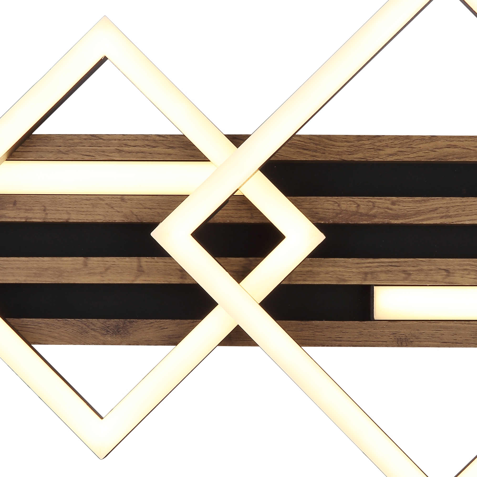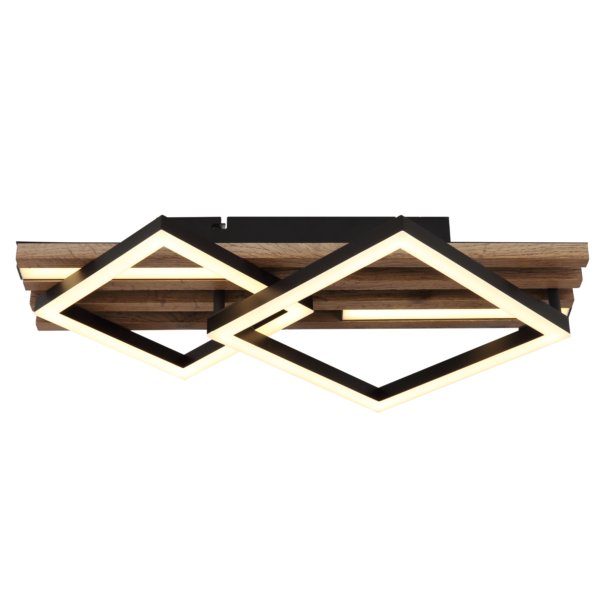 Zaujme na první pohled svým poutavým designem. Má černou kovovou konstrukci, která je doplněna lamelami z pevné dřevovláknité MDF desky s dekorem tmavého dřeva. Ten dodá do místnosti nádech přírody. Mezi lamelami jsou umístěny 2 podlouhlé LED panely a na nich 2 čtverce.