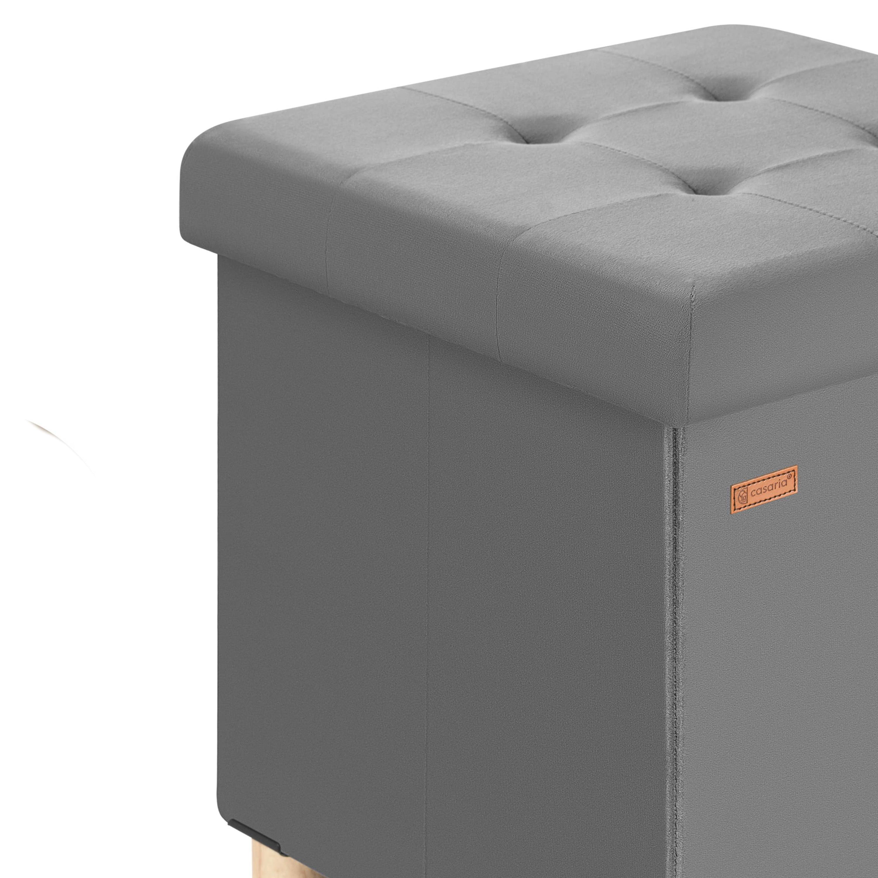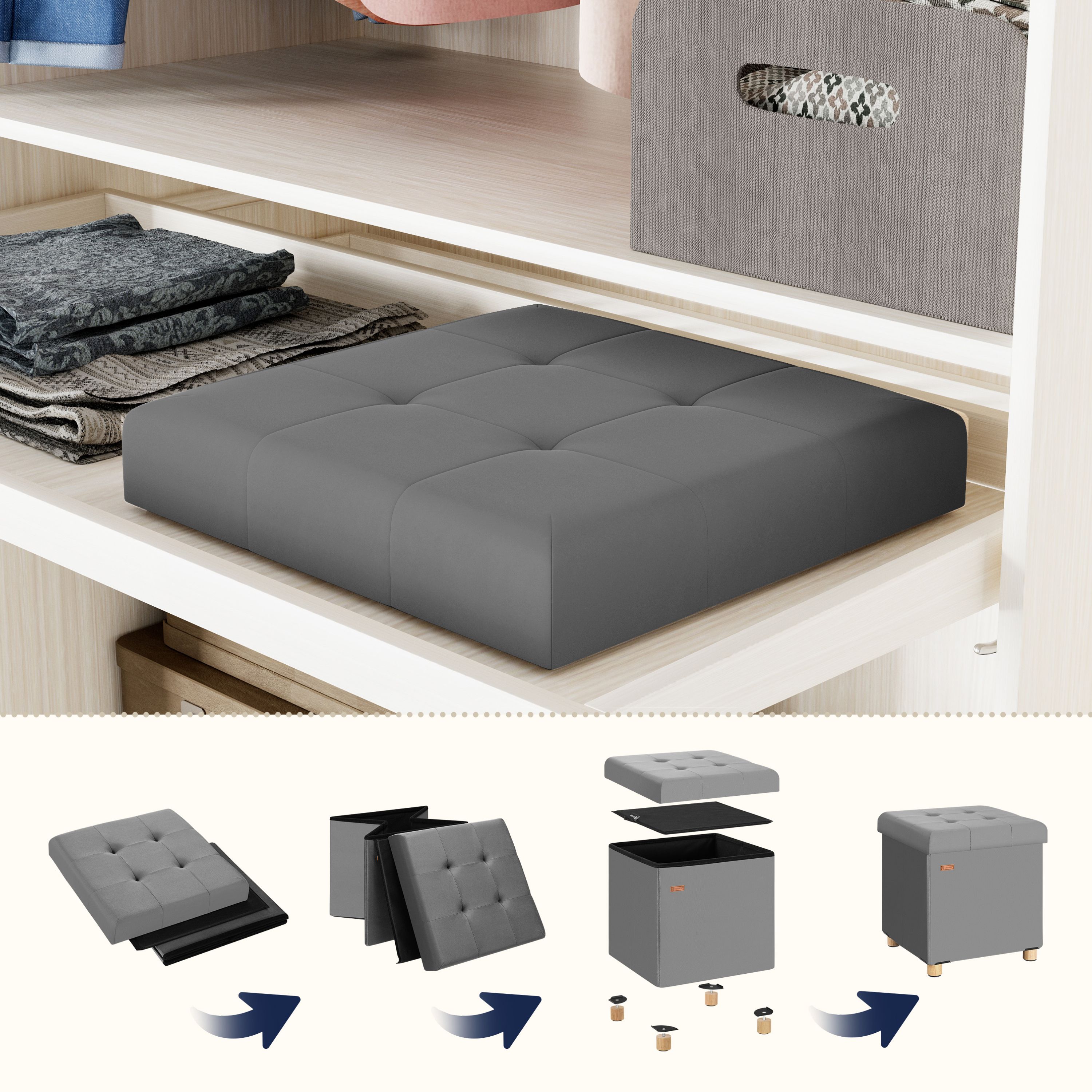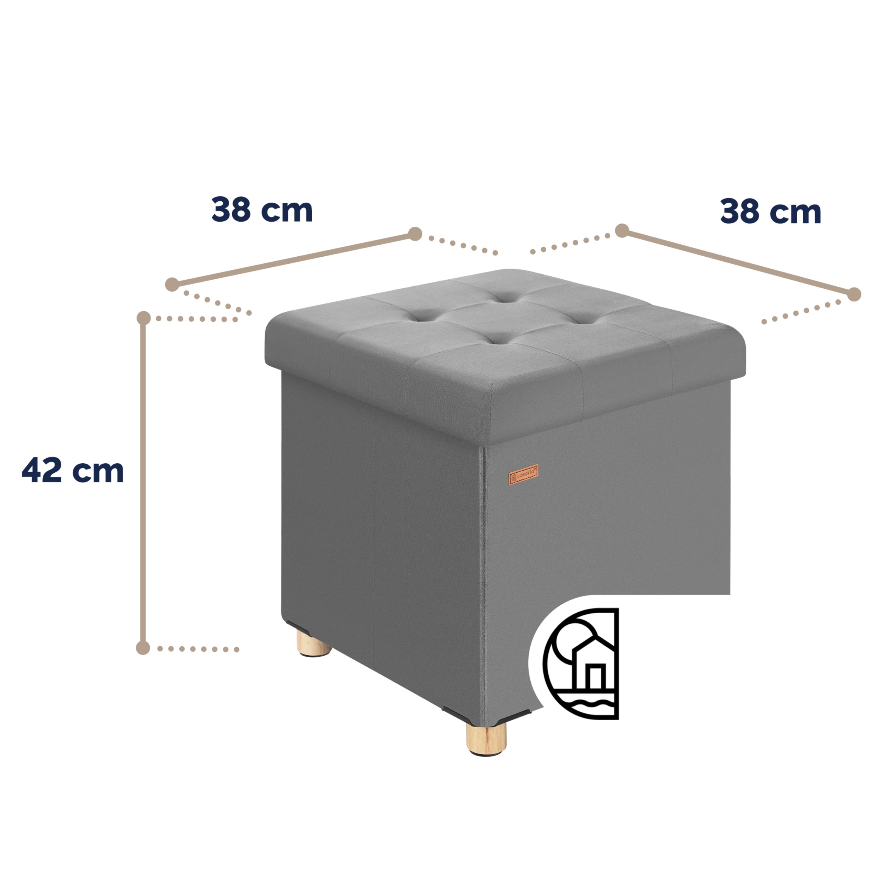 Silně polstrované víko s jádrem z polyuretanové pěny poskytuje pohodlné sezení a zároveň ukrývá praktický úložný prostor o objemu 40 litrů, který je ideální pro uložení dek, polštářů, hraček nebo dalších drobností. Taburet lze navíc velmi snadno rozložit a uskladnit, pokud jej právě nepotřebujete. Díky tomu je praktickým řešením i pro menší prostory.