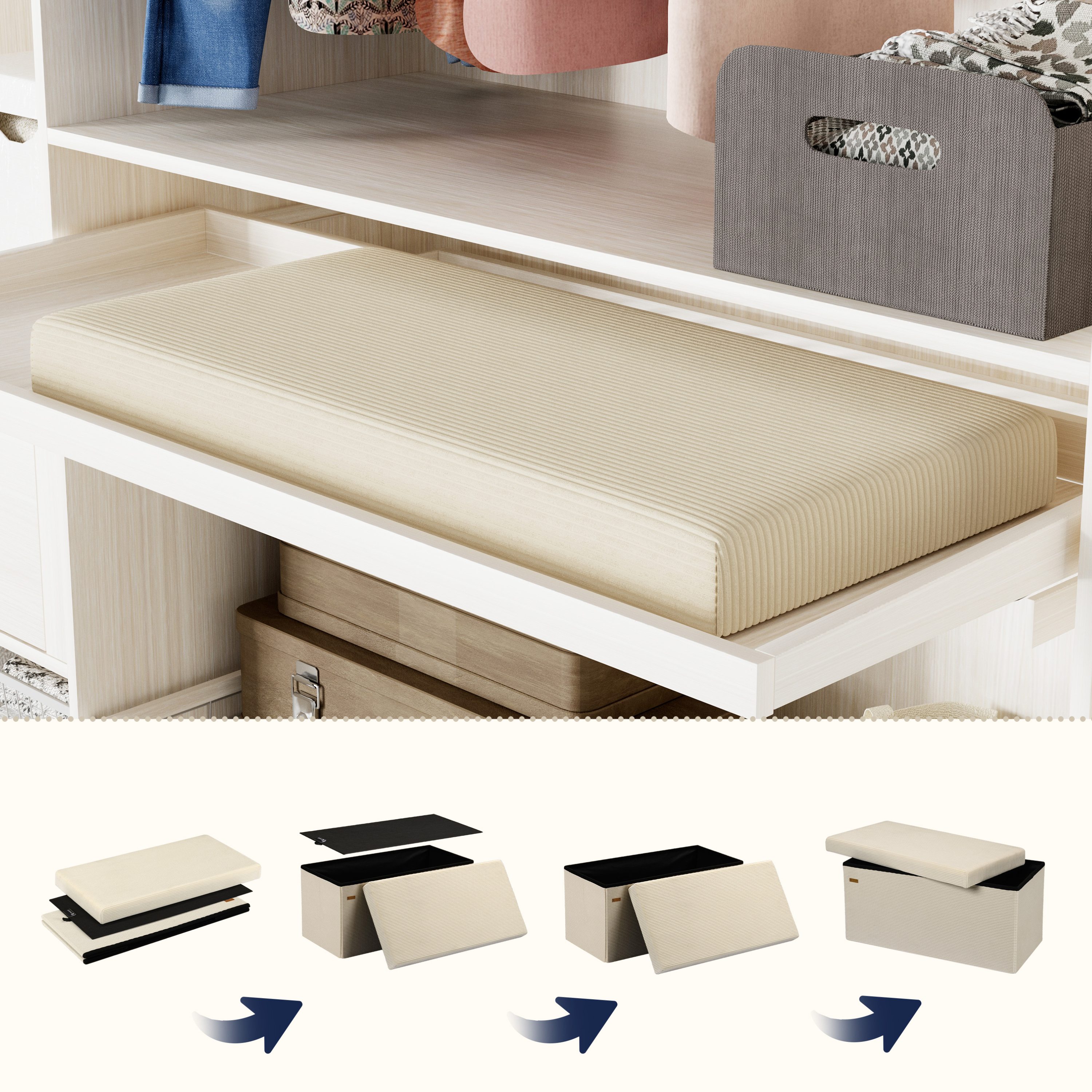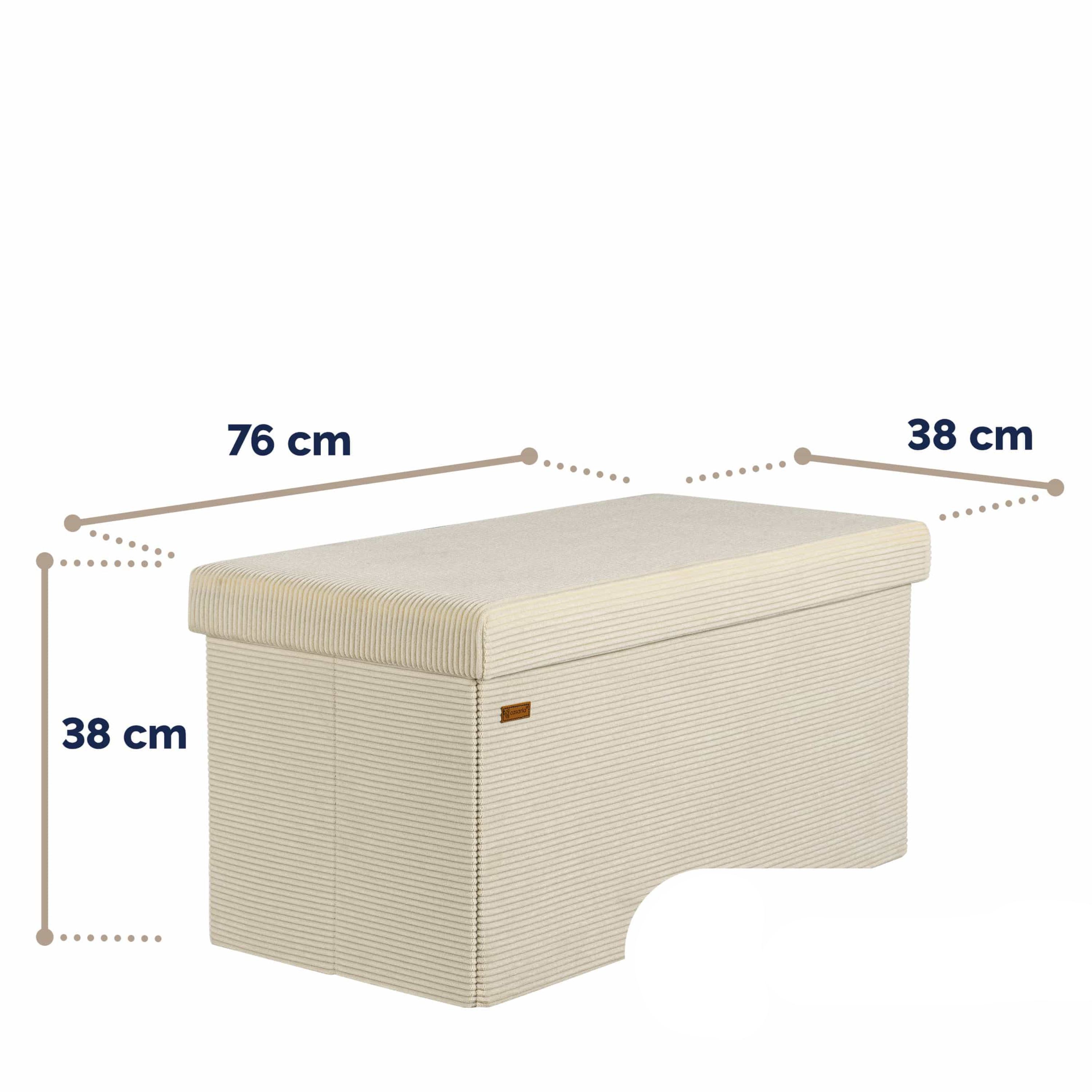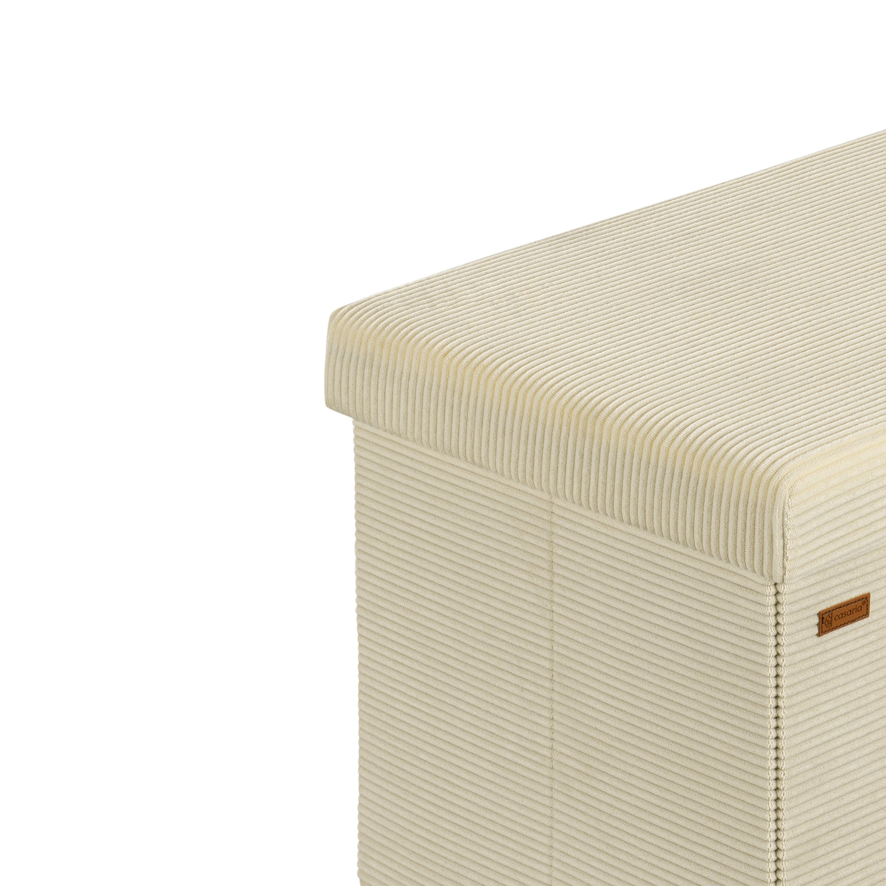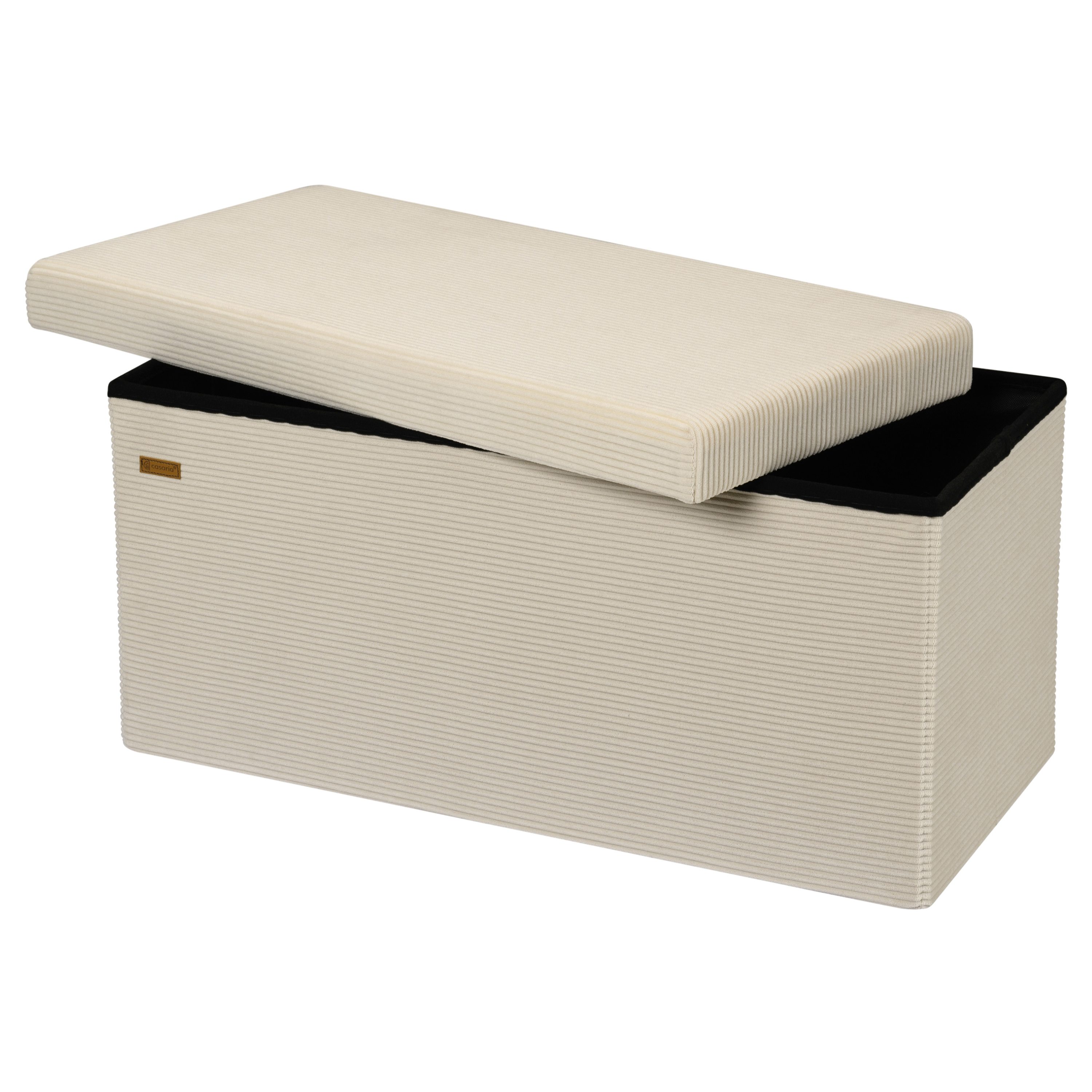 Silně polstrované víko s jádrem z polyuretanové pěny poskytuje pohodlné sezení a zároveň ukrývá praktický úložný prostor o objemu 100 litrů, který je ideální pro uložení dek, polštářů, hraček nebo dalších drobností. Taburet lze navíc velmi snadno rozložit a uskladnit, pokud jej právě nepotřebujete. Díky tomu je praktickým řešením i pro menší prostory.