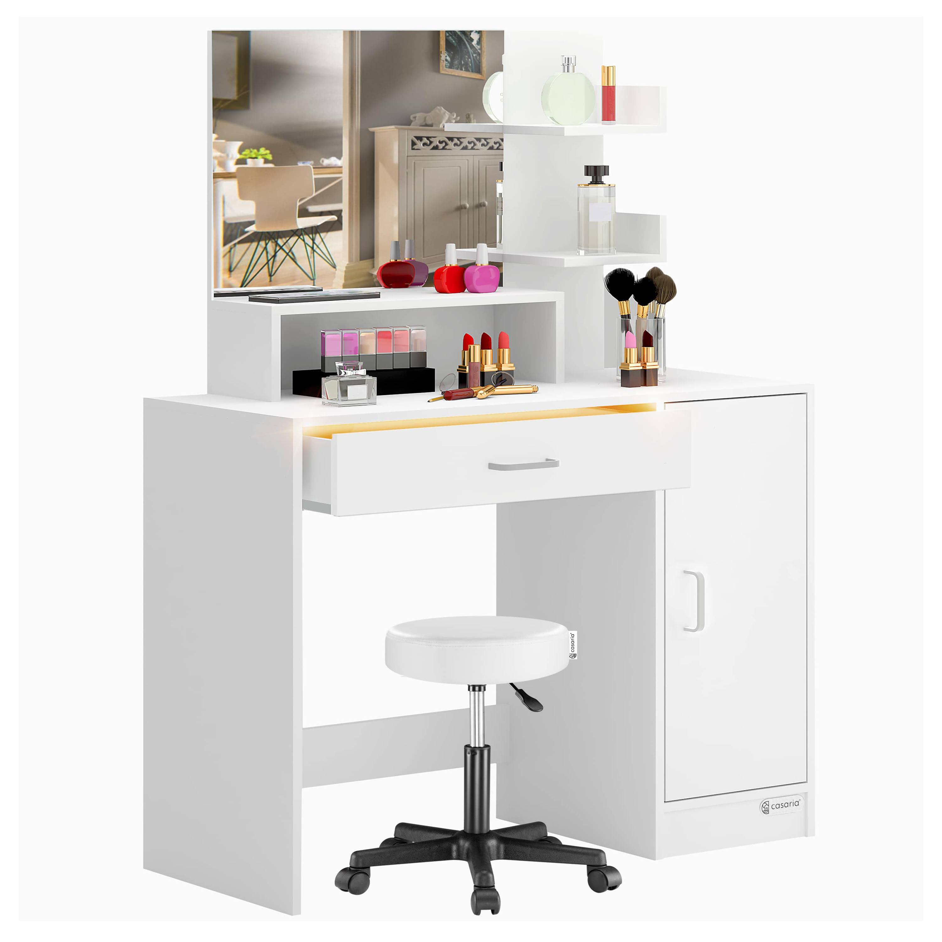 Dominantním prvkem stolu je prostorné zrcadlo, které vám usnadní každodenní ranní i večerní rutinu. To je doplněno 3 otevřenými poličkami pro přehledné uložení kosmetiky a doplňků. Velkou předností tohoto stolku je praktická zásuvka s integrovaným podsvícením, které se automaticky aktivuje při otevření a zhasne po zavření. Dále nabízí ještě uzavíratelný prostor za otočnými dveřmi. Stolek lze pro větší stabilitu připevnit ke stěně a na jeho nohách jsou připevněny chrániče, které chrání vaši podlahu a zabraňují poškrábání.