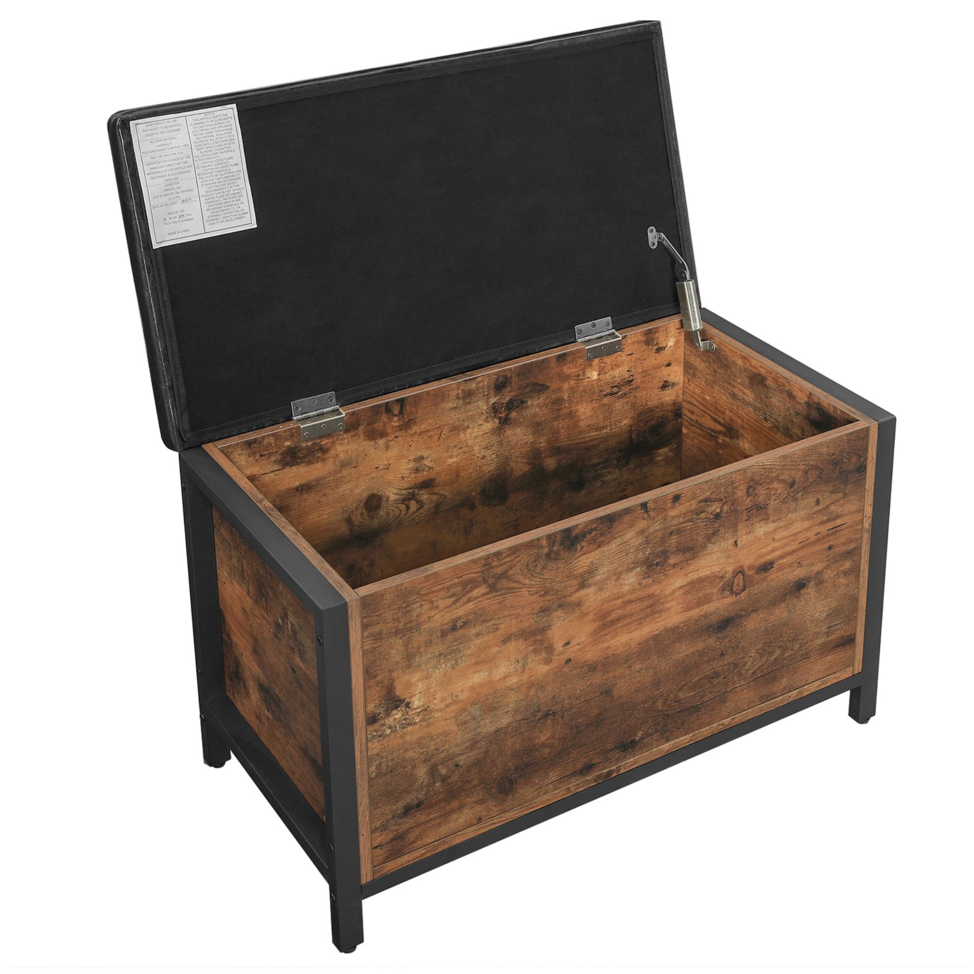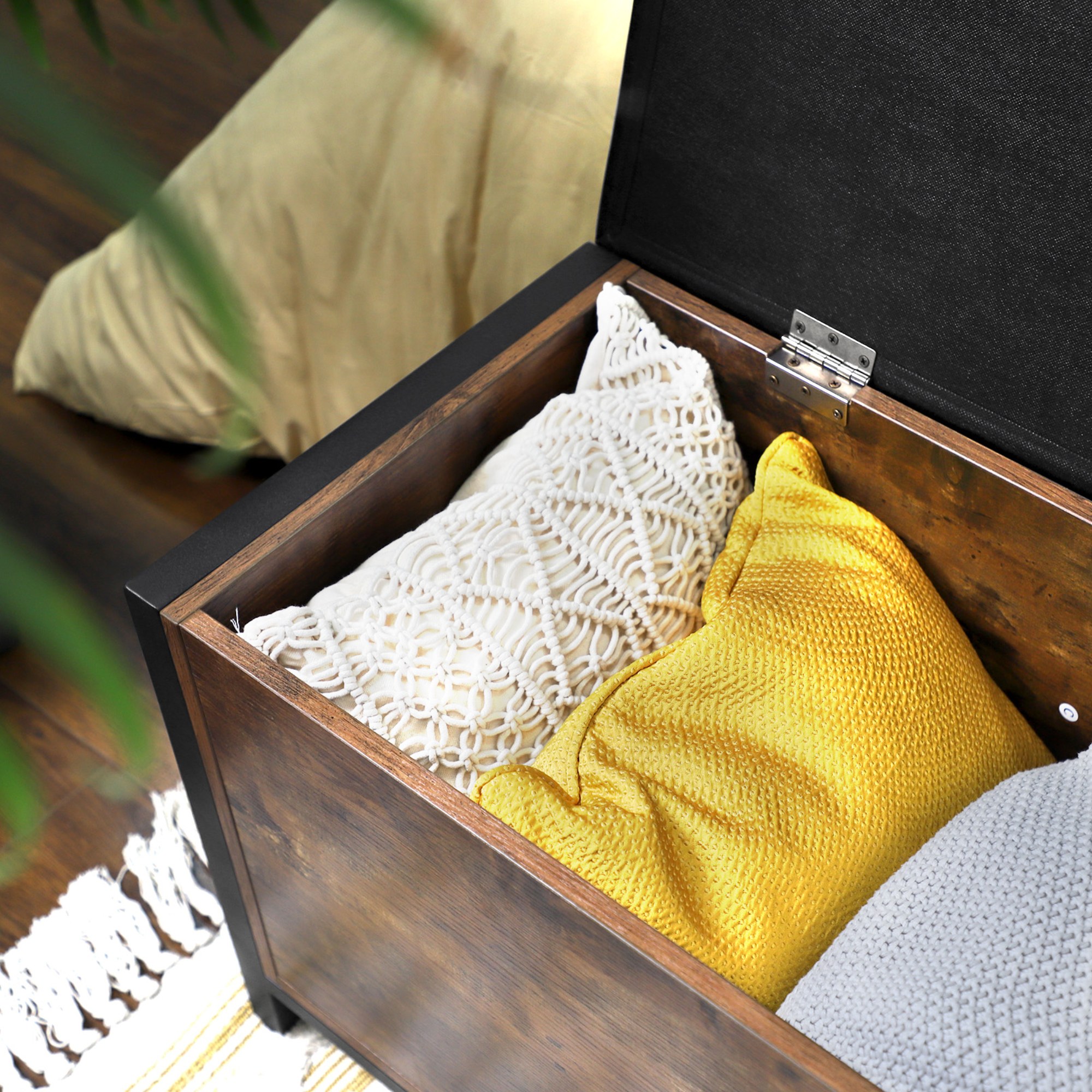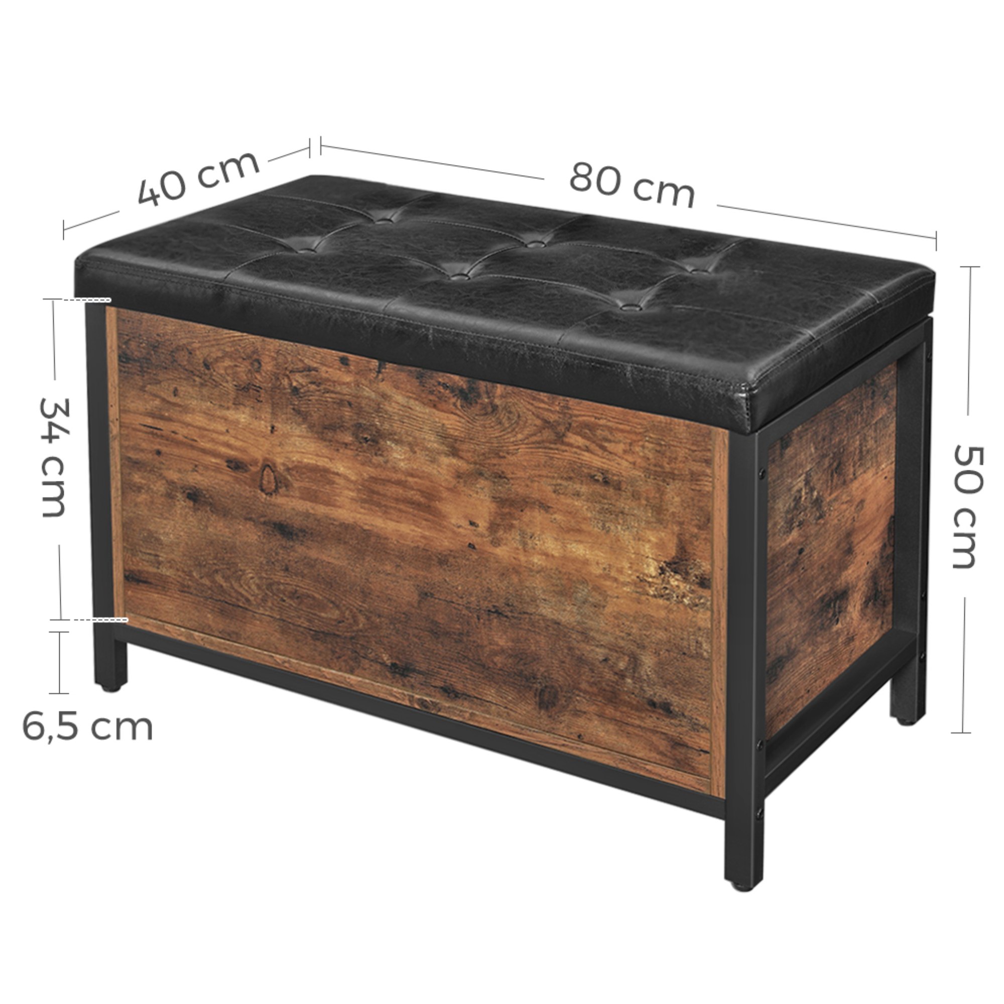 Truhla FREN v industriálním provedení nabízí univerzální řešení do vašeho interiéru. Kombinace černé kovové konstrukce s rustikální hnědou barvou vytváří příjemnou a živou atmosféru v celé místnosti. Pro odložení všeho potřebného je zde uzavíratelný úložný prostor s nosností až 20 kg. Ten je chráněn víkem, jehož povrch je potažený syntetickou kůží s vnitřkem vyplněným PU pěnou. Díky namontovanému vnitřnímu pístu se víko jednoduše manipuluje. Nosnost konstrukce je až 90 kg, takže truhlu můžete využít i na částečné sezení.