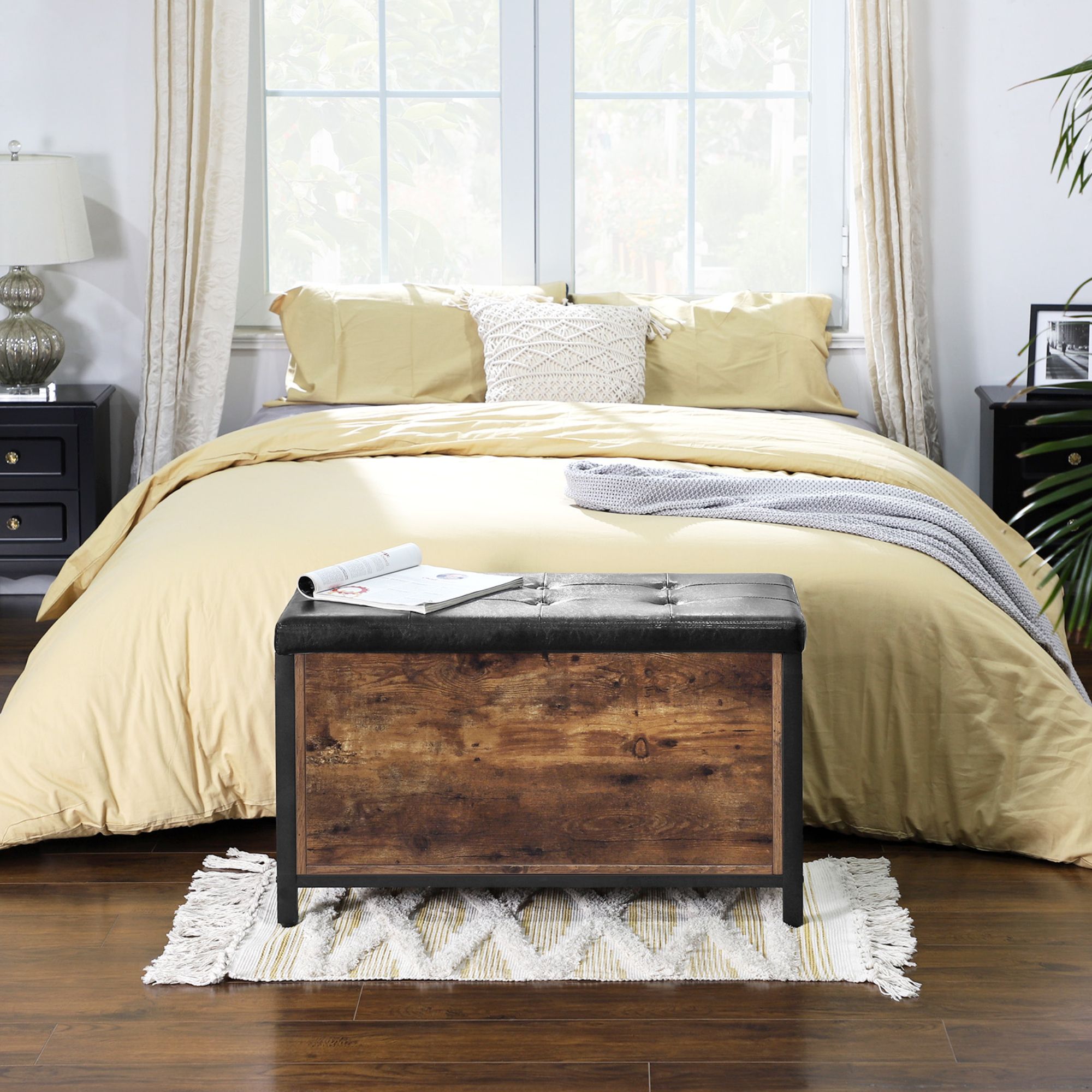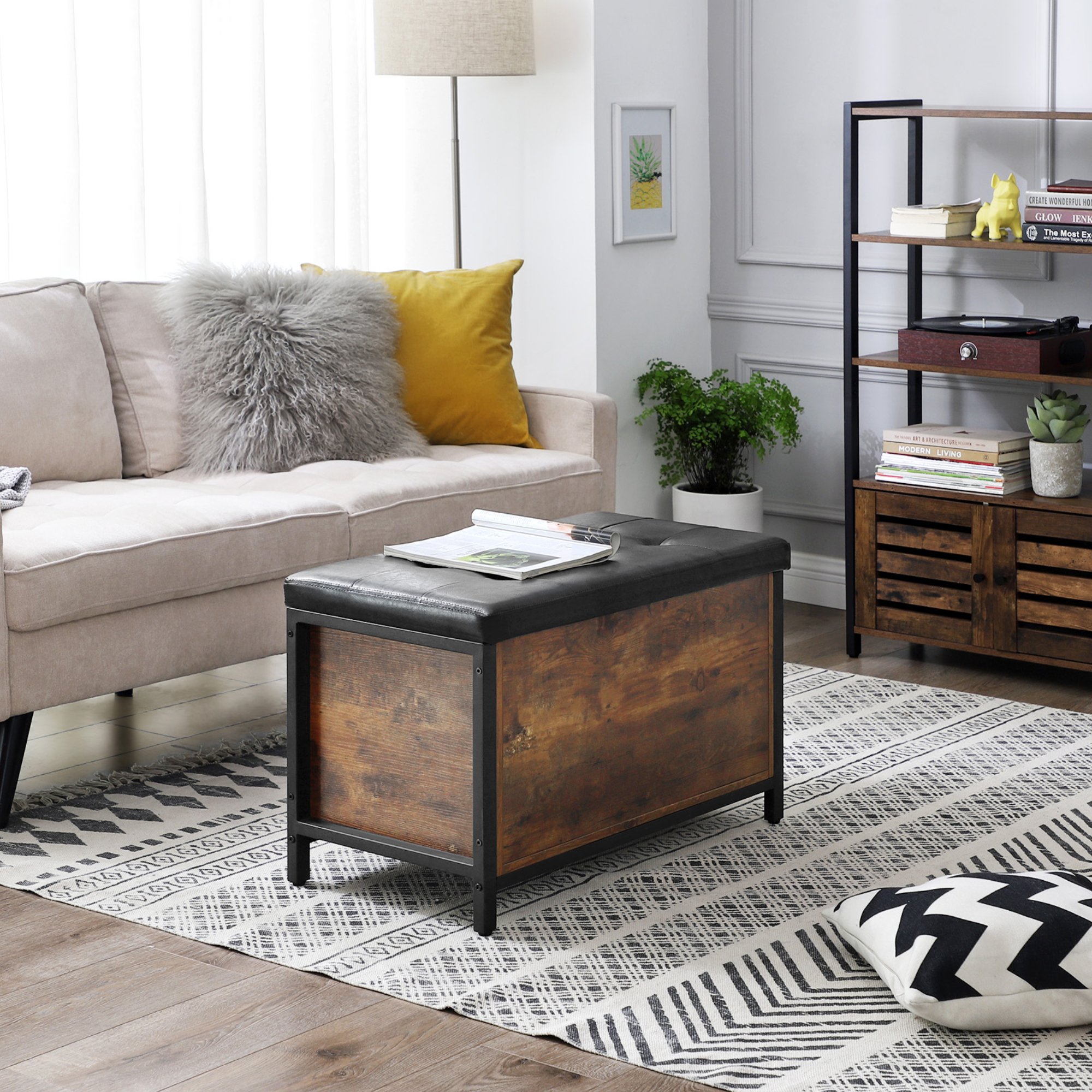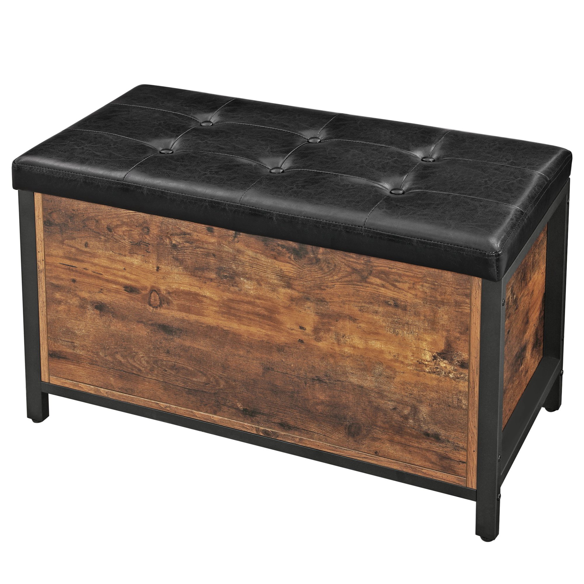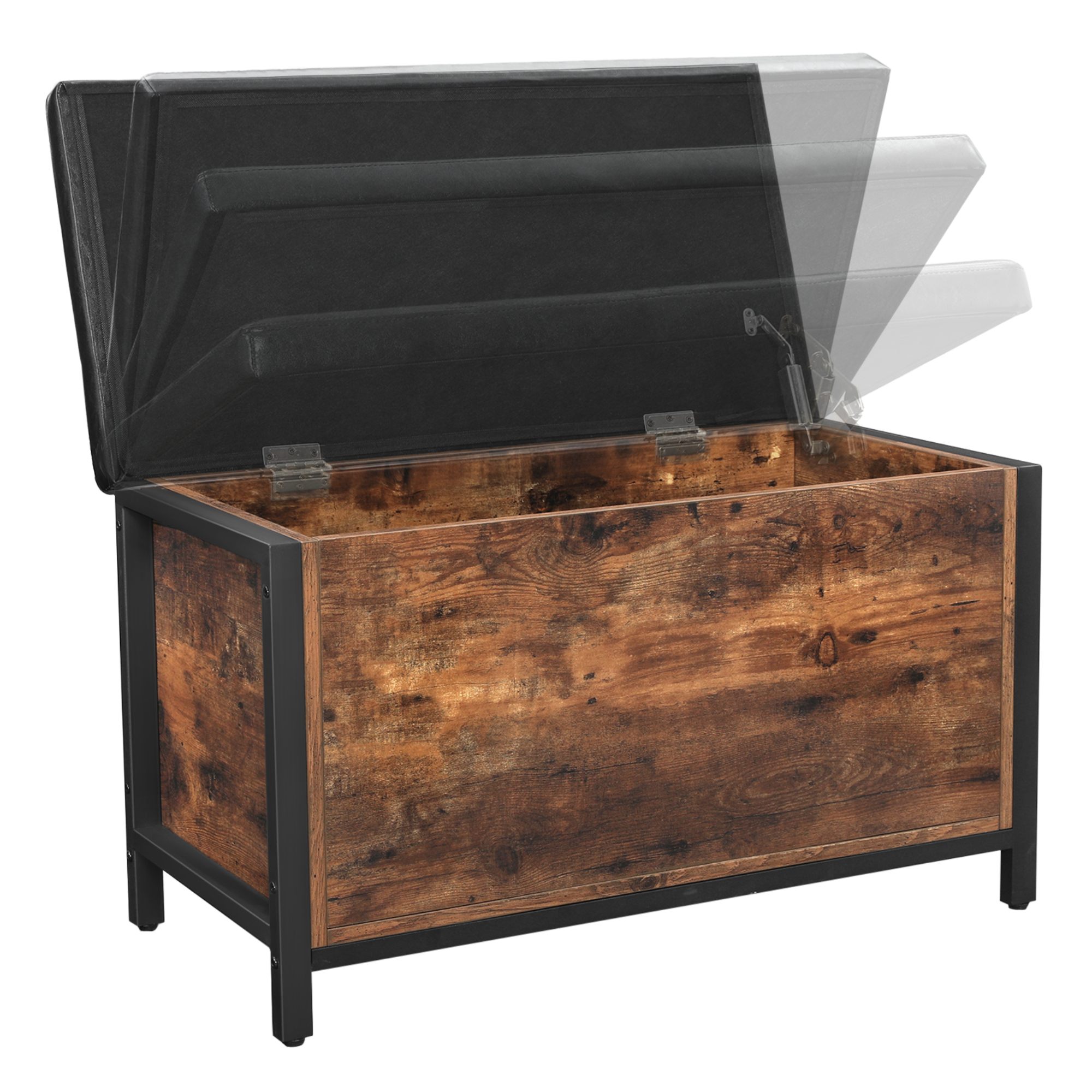 Truhla FREN v industriálním provedení nabízí univerzální řešení do vašeho interiéru. Kombinace černé kovové konstrukce s rustikální hnědou barvou vytváří příjemnou a živou atmosféru v celé místnosti. Pro odložení všeho potřebného je zde uzavíratelný úložný prostor s nosností až 20 kg. Ten je chráněn víkem, jehož povrch je potažený syntetickou kůží s vnitřkem vyplněným PU pěnou. Díky namontovanému vnitřnímu pístu se víko jednoduše manipuluje. Nosnost konstrukce je až 90 kg, takže truhlu můžete využít i na částečné sezení.