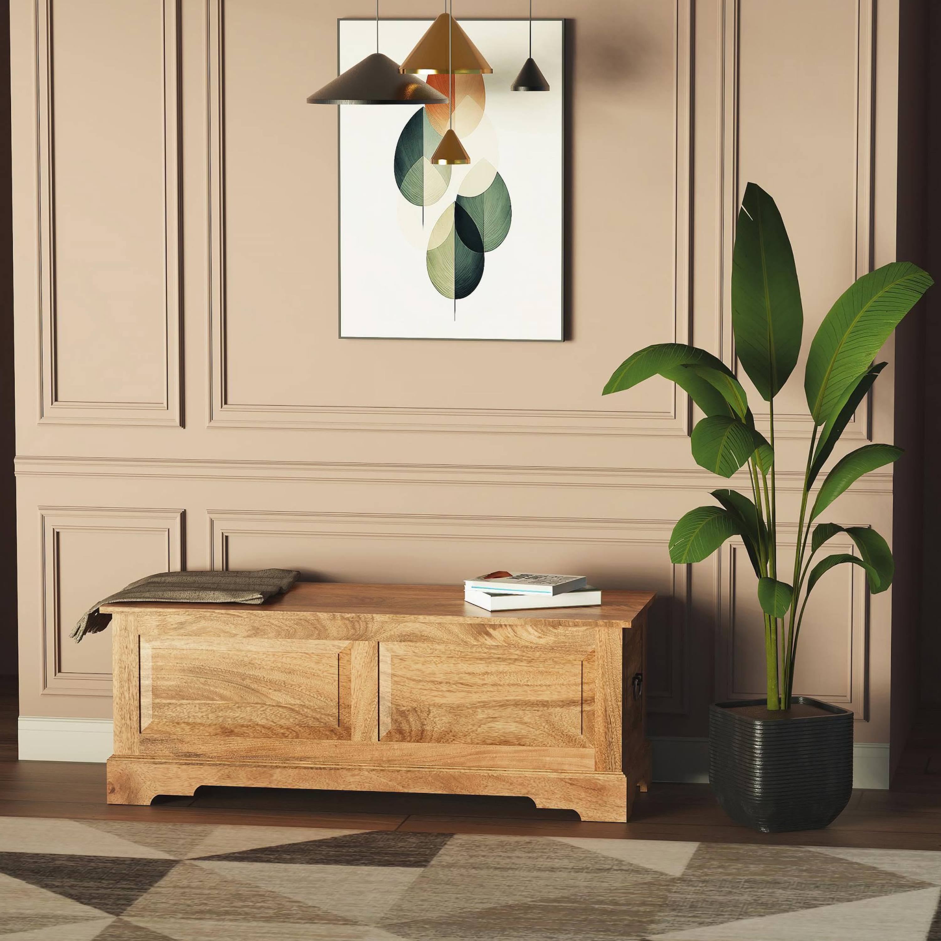 Díky svým rozměrům a kvalitnímu řemeslnému zpracování je truhla ideální volbou pro milovníky přírodních materiálů a nadčasového designu.