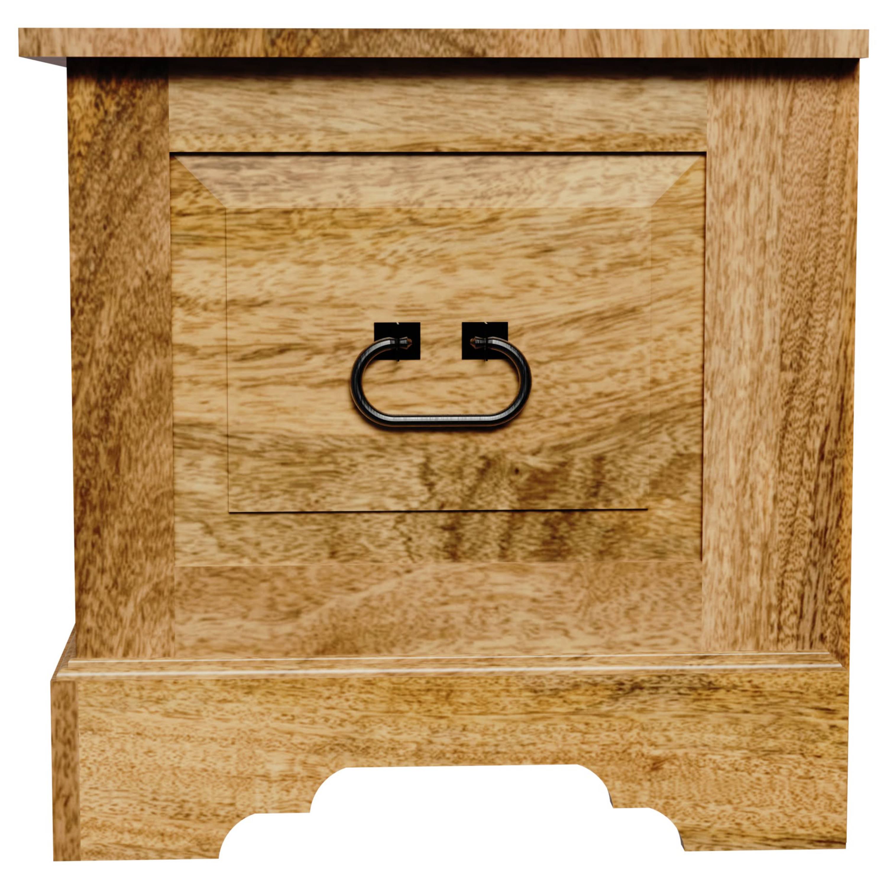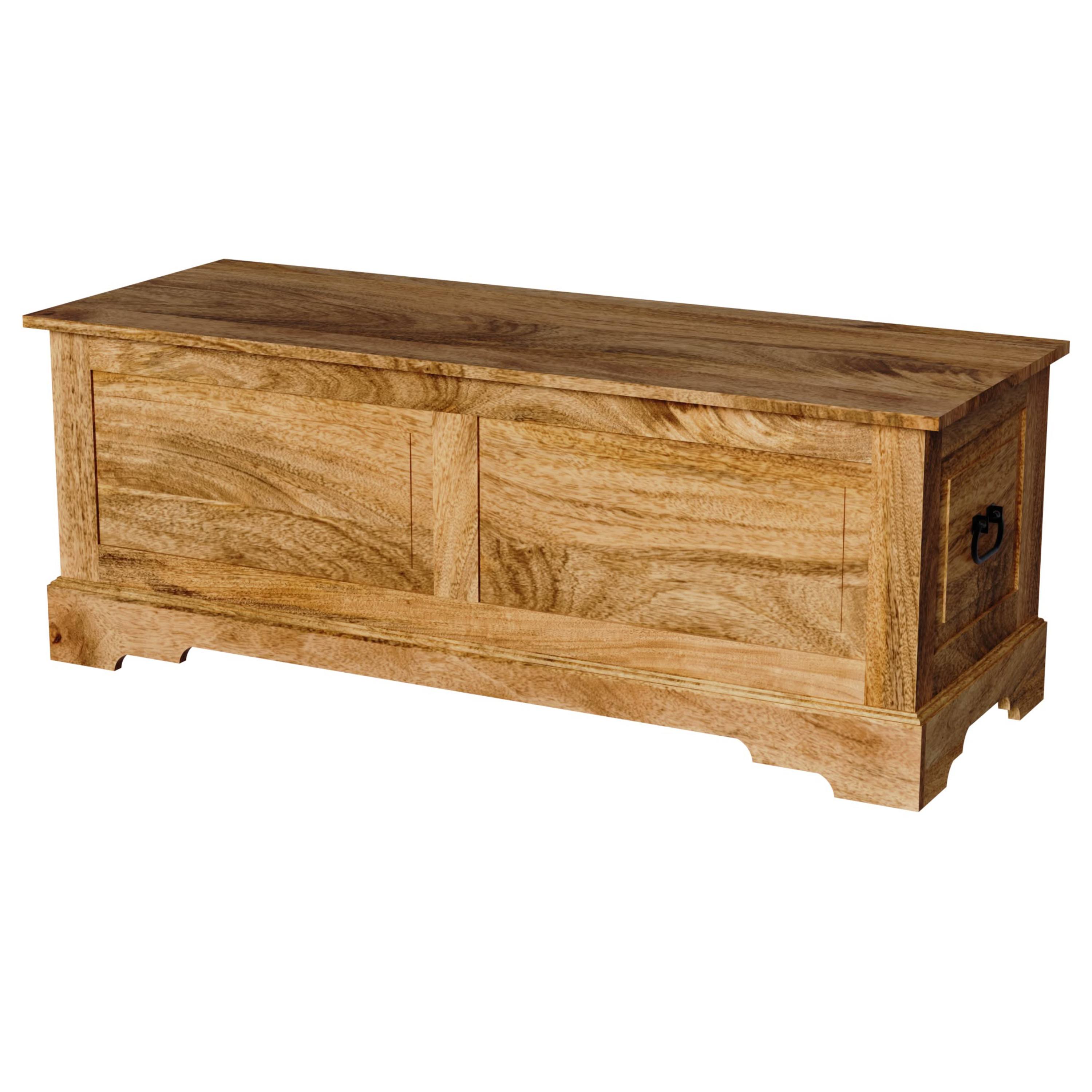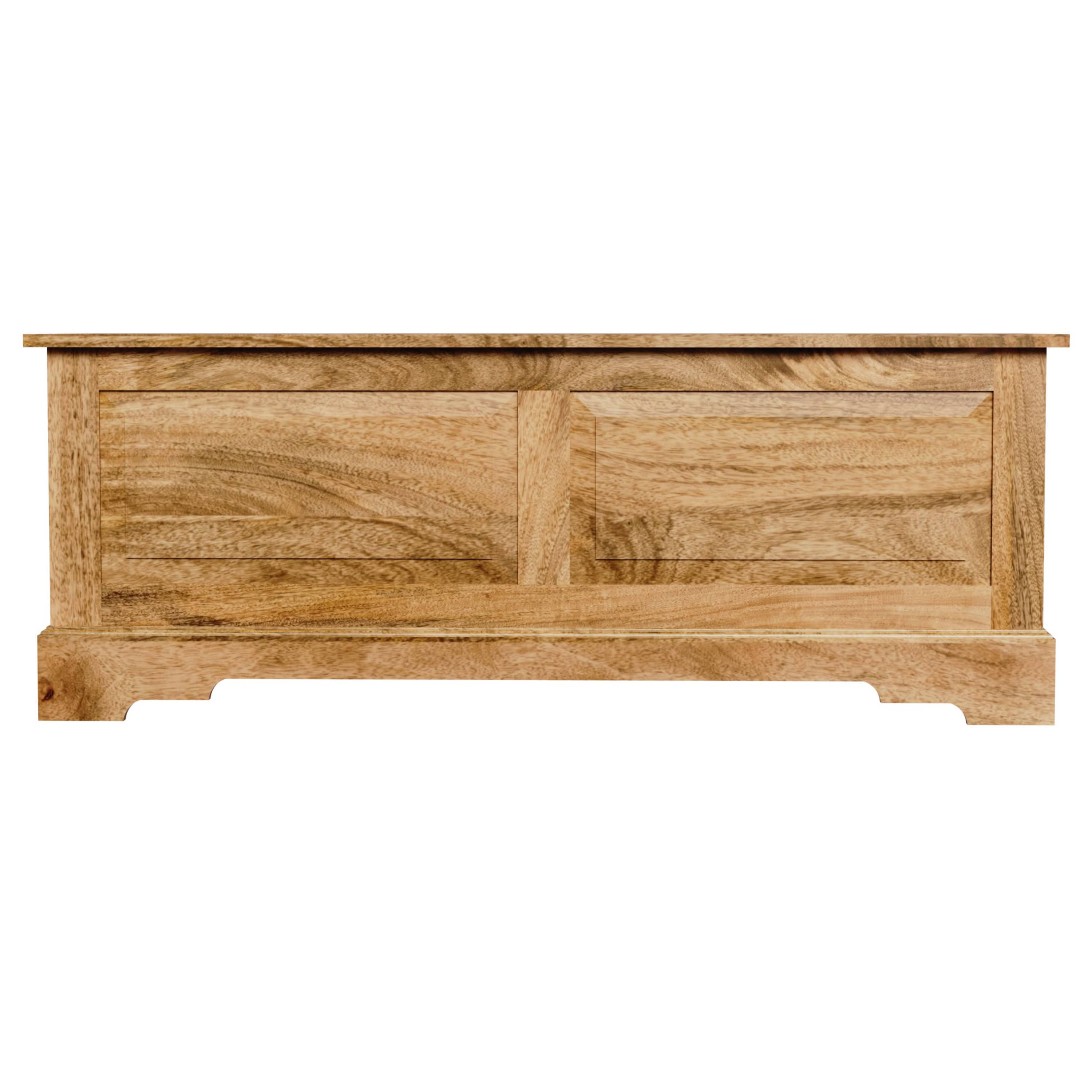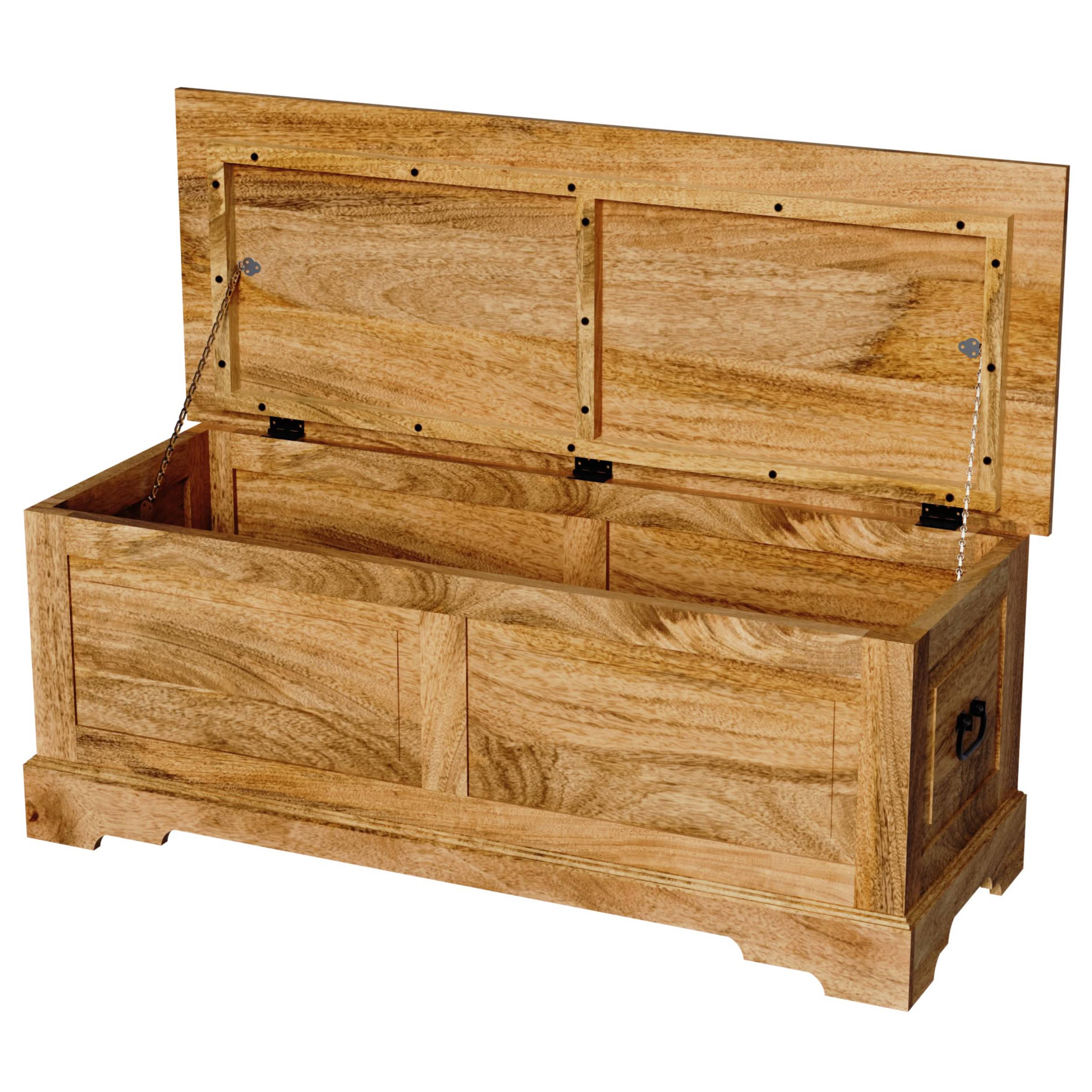 Robustní konstrukce truhly s masivním rámem a pečlivě opracovaným dřevem odhaluje bohatou a různorodou kresbu mangového dřeva. Boční kovové úchyty nejen dodávají praktickou funkci, ale také přidávají rustikální charakter, který ladí s přírodními tóny truhly. Elegantně tvarovaný spodní okraj základny dodává vizuální lehkost a jemně ozvláštňuje celkový design.