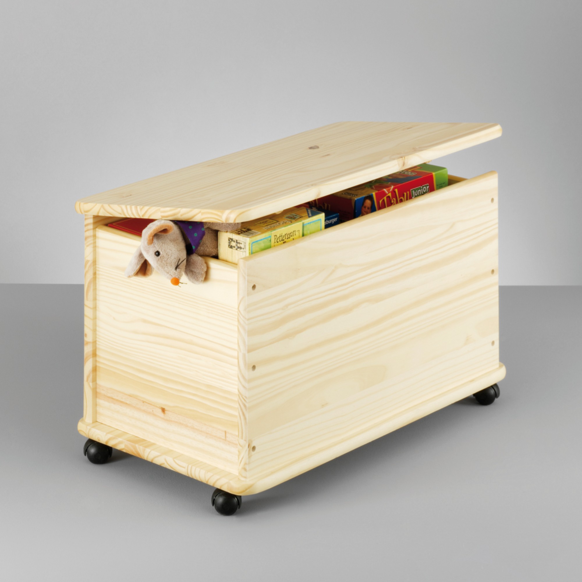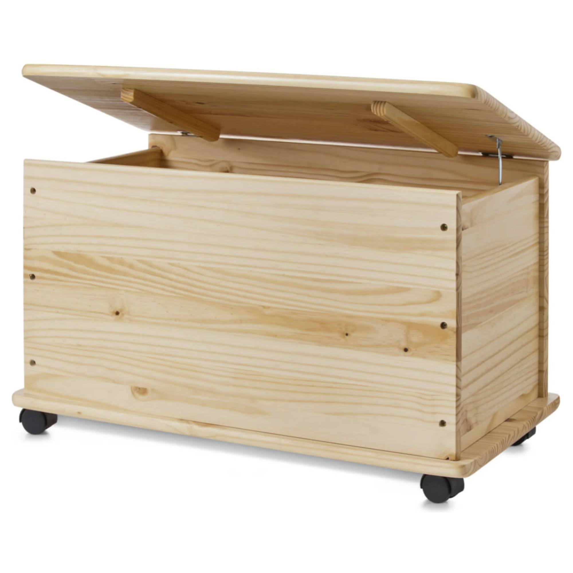 PINA je dětská truhla z masivní borovice ideální především na hračky. Jejich povrch je upraven lakem a je pro snadnější manipulaci má k dispozici i kolečka, takže ji lze přemisťovat z místa na místo.