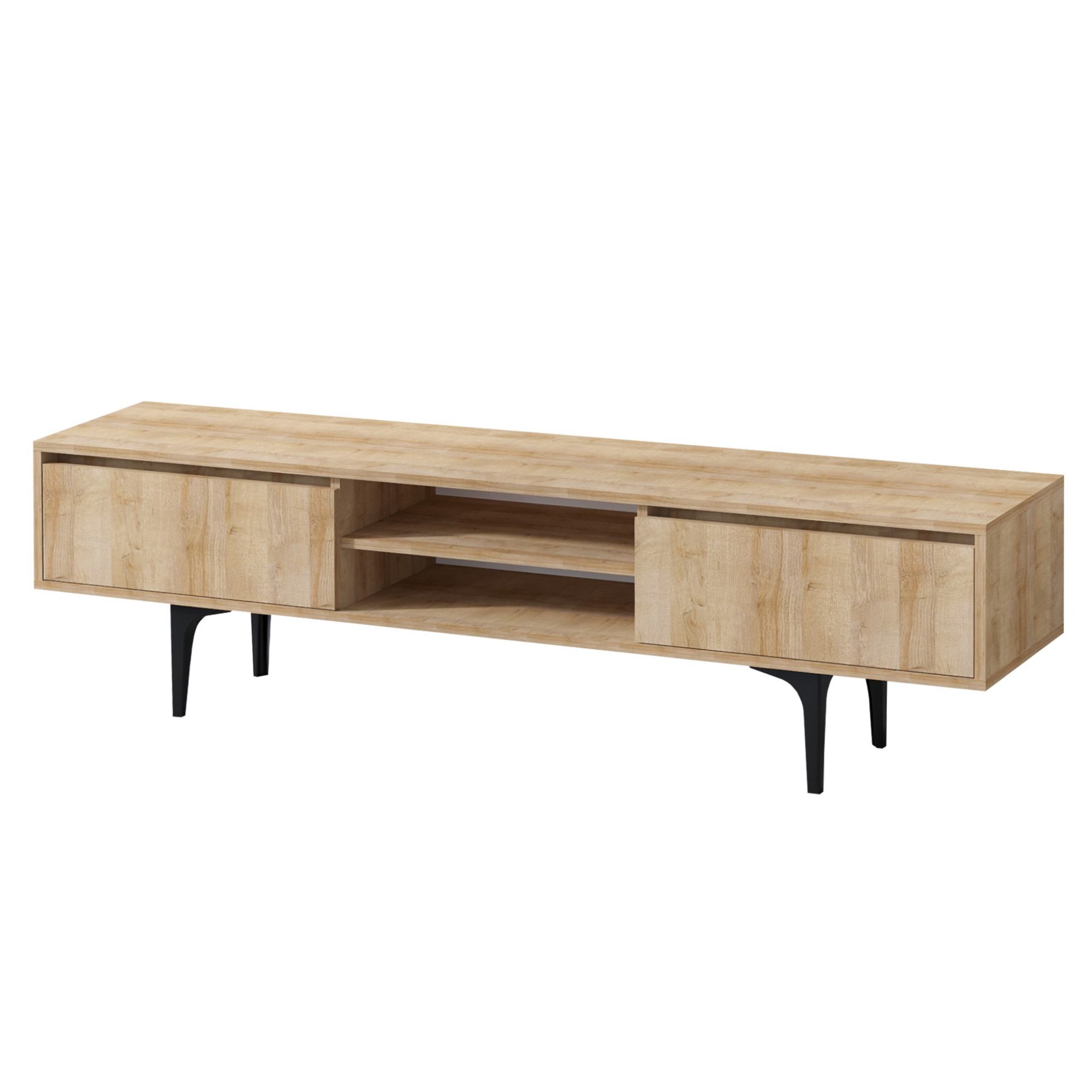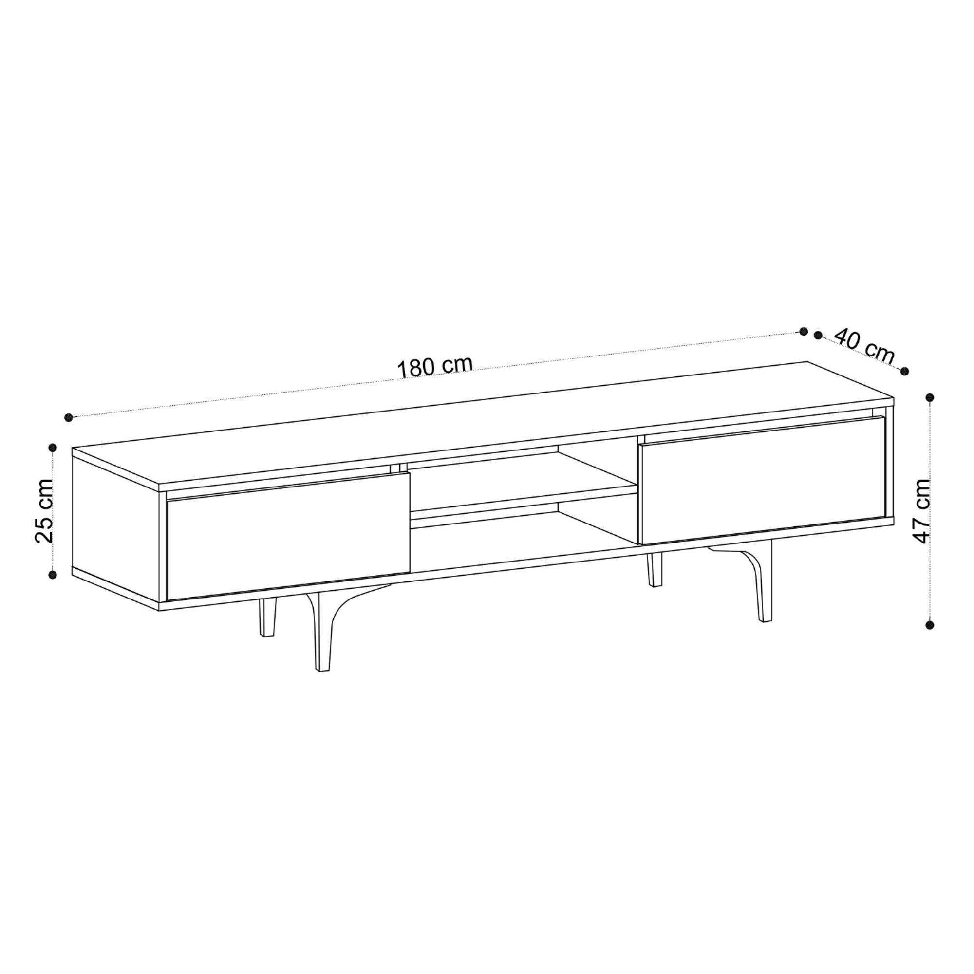 Uprostřed komody je otevřený úložný prostor s 1 policí. Ta je ideální pro umístění set top boxů, DVD přehrávačů a jiné elektroniky. Dále disponuje 2 zásuvkami, které poskytují dostatek místa pro odložení všeho, co potřebujete mít po ruce. Vrchní deska o šířce 180 cm nabízí prostor pro televizi, ovladače i dekorace. Provedení bez úchytek podtrhuje její moderní vzhled.
