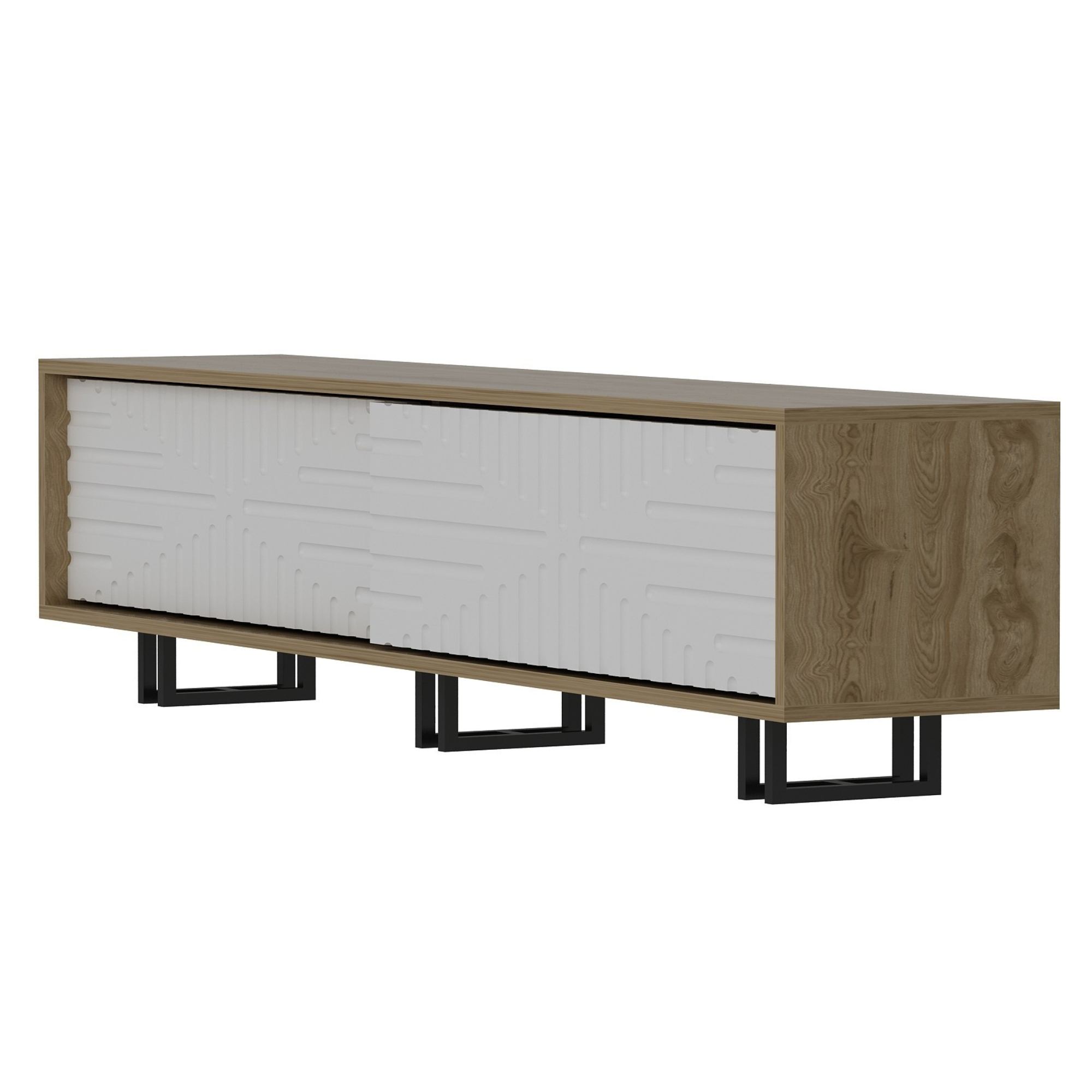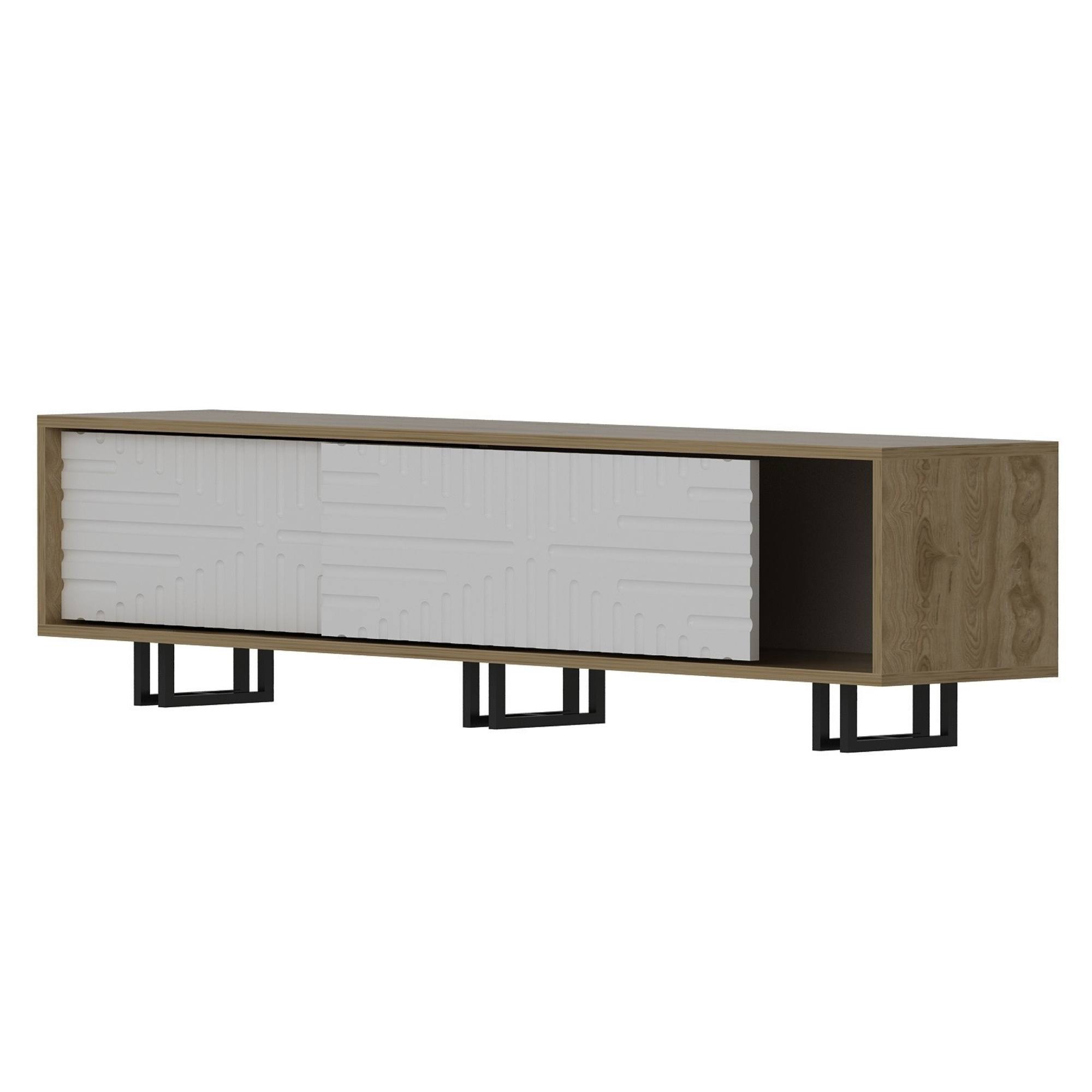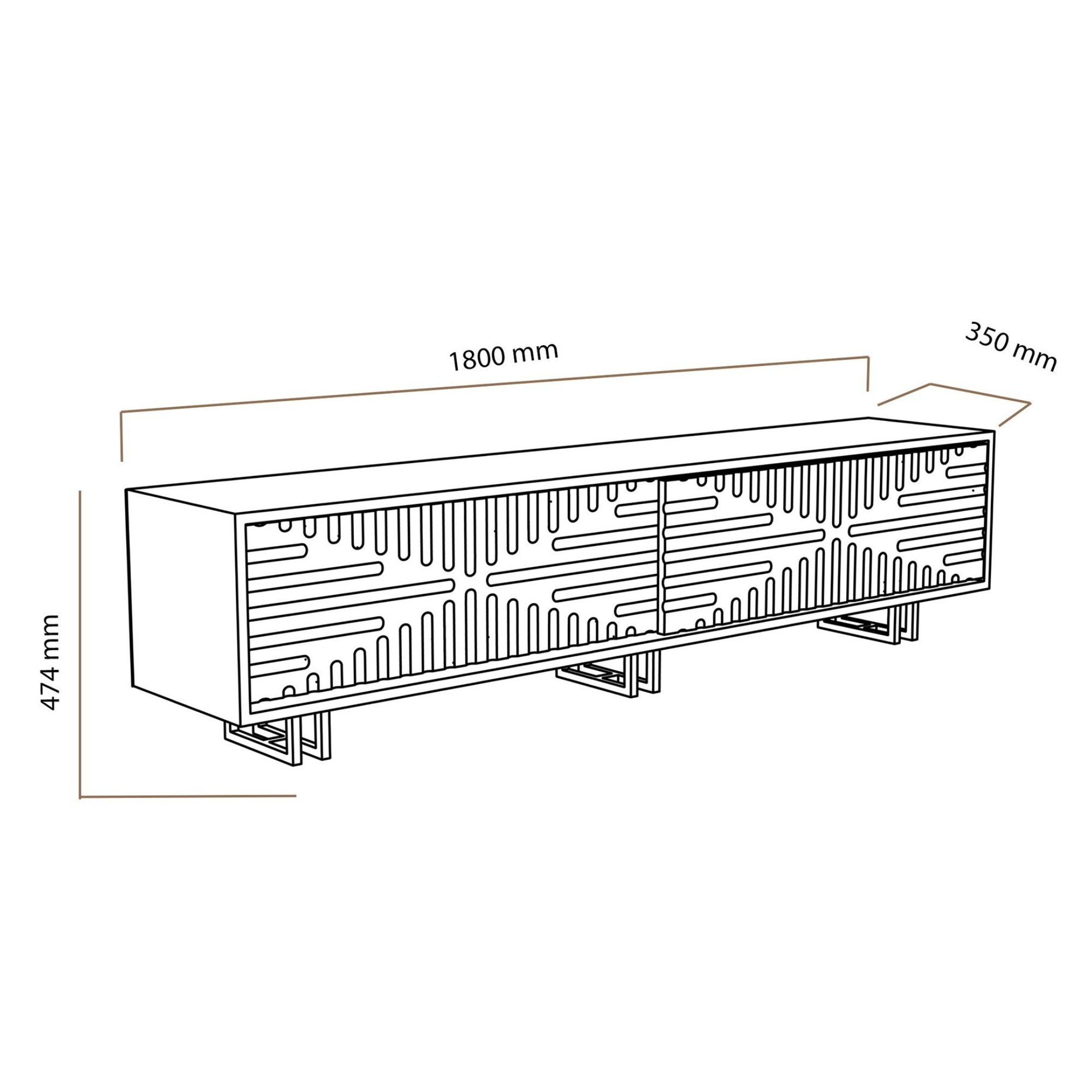 Disponuje 2 posuvnými dvířky, která odkrývají velký úložný prostor. Ten nabízí dostatek místa pro odložení všeho, co potřebujete mít po ruce. Vrchní deska o šířce 180 cm nabízí prostor pro televizi, ovladače i dekorace. Dvířka jsou doplněna zajímavým designem, který oživuje jinak jednoduchý vzhled. Díky provedení bez úchytek design hezky vyniká.
