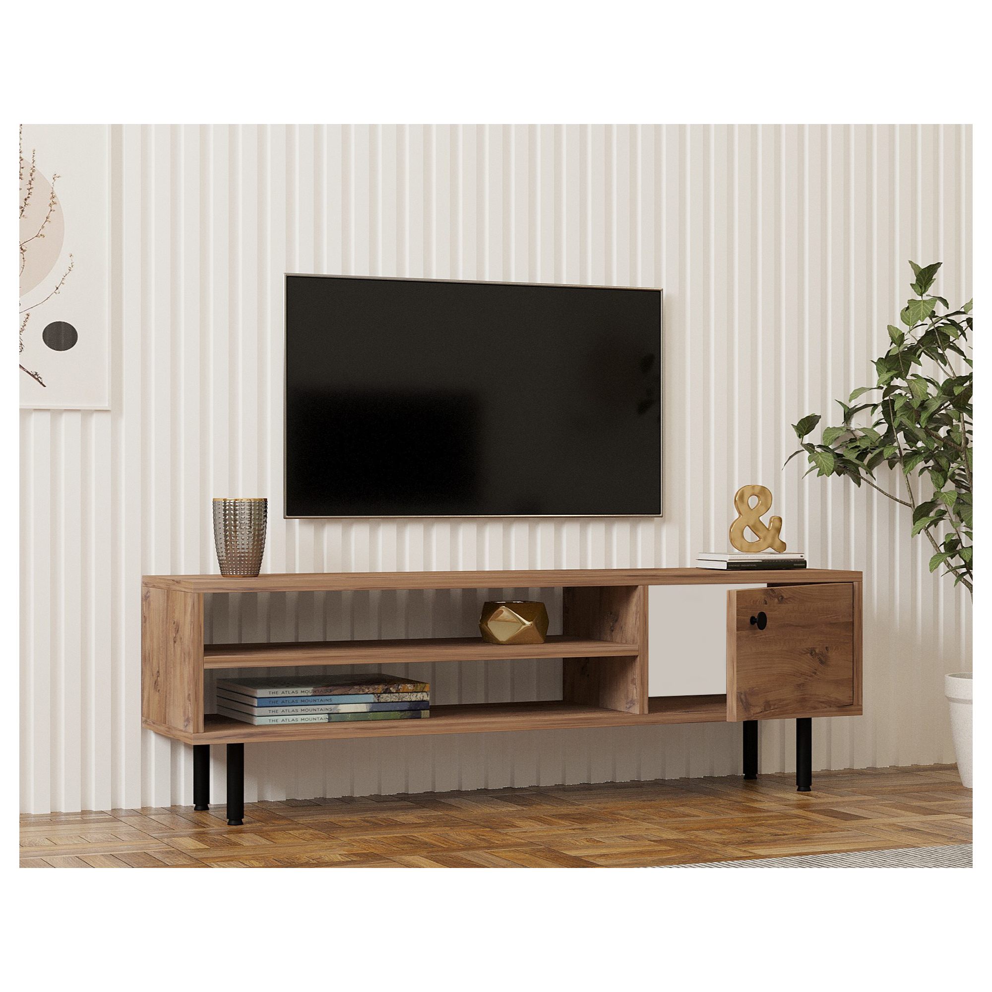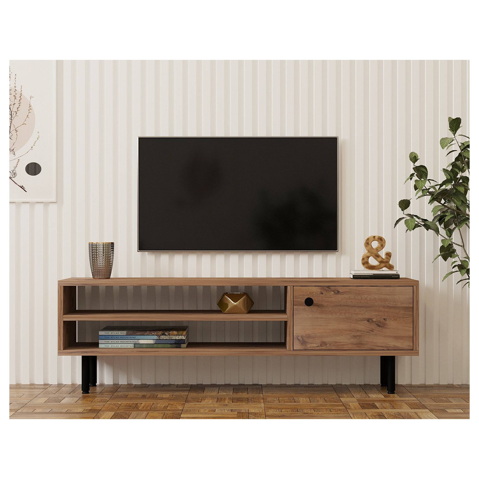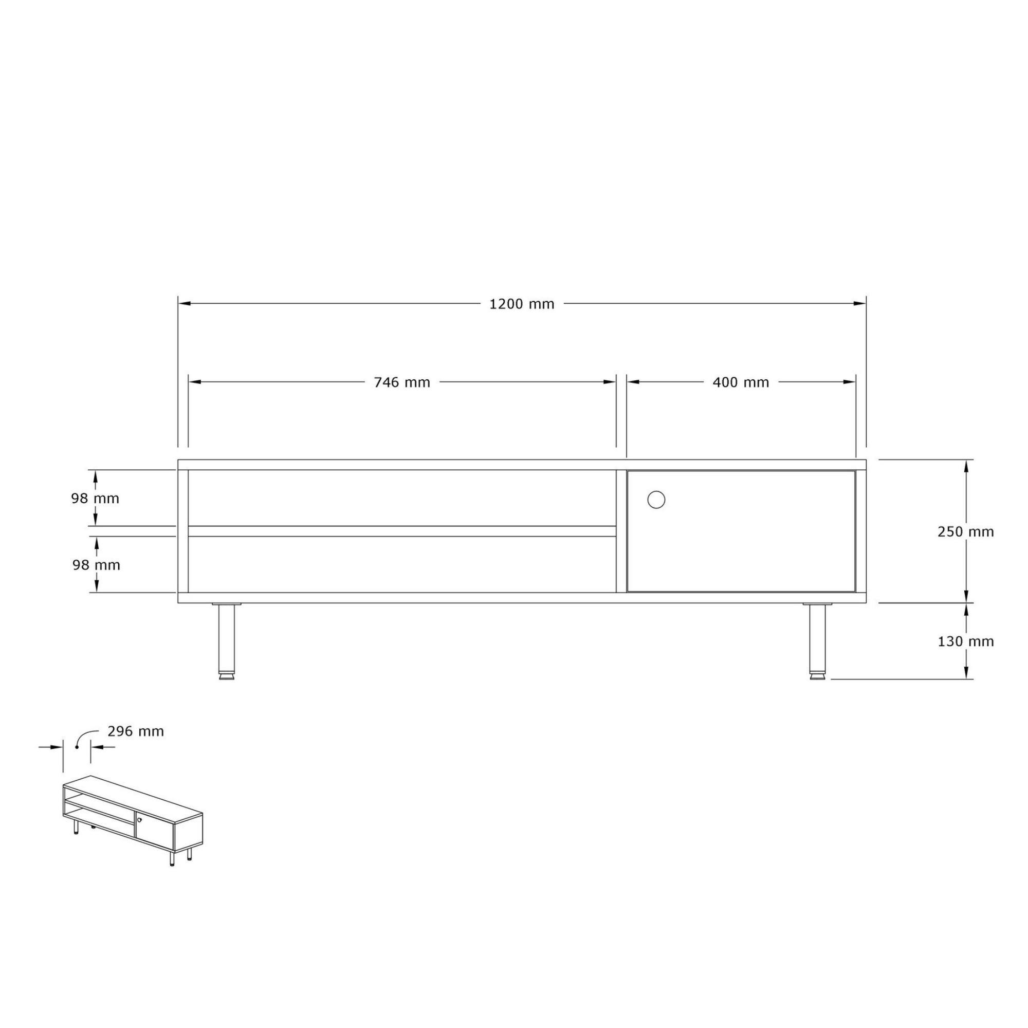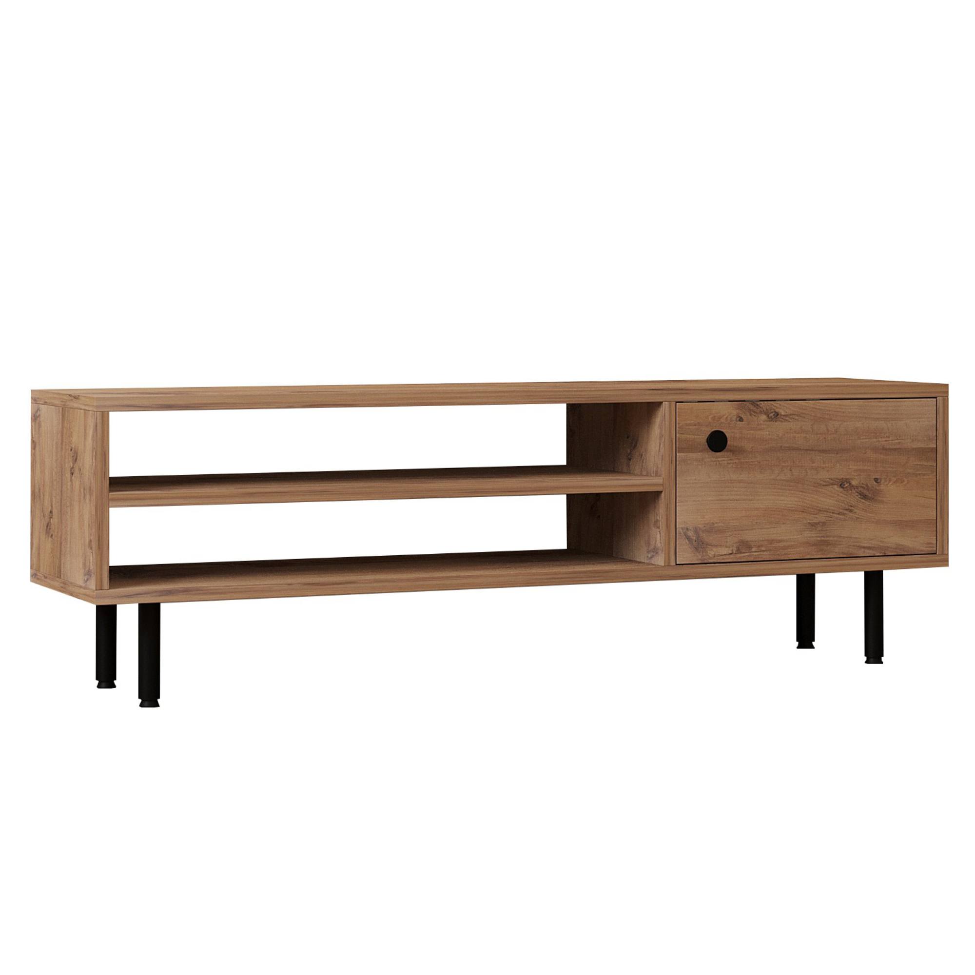 Levá strana komody disponuje otevřeným úložným prostorem s 1 policí. Ta je ideální pro umístění set top boxů, DVD přehrávačů a jiné elektroniky. Dále je vybavena 1 otočnými dvířky, za kterými naleznete další úložný prostor. Ten poskytuje místo pro odložení maličkostí, co potřebujete mít po ruce. Dvířka jsou doplněna úchytkou pro pohodlnější manipulaci.