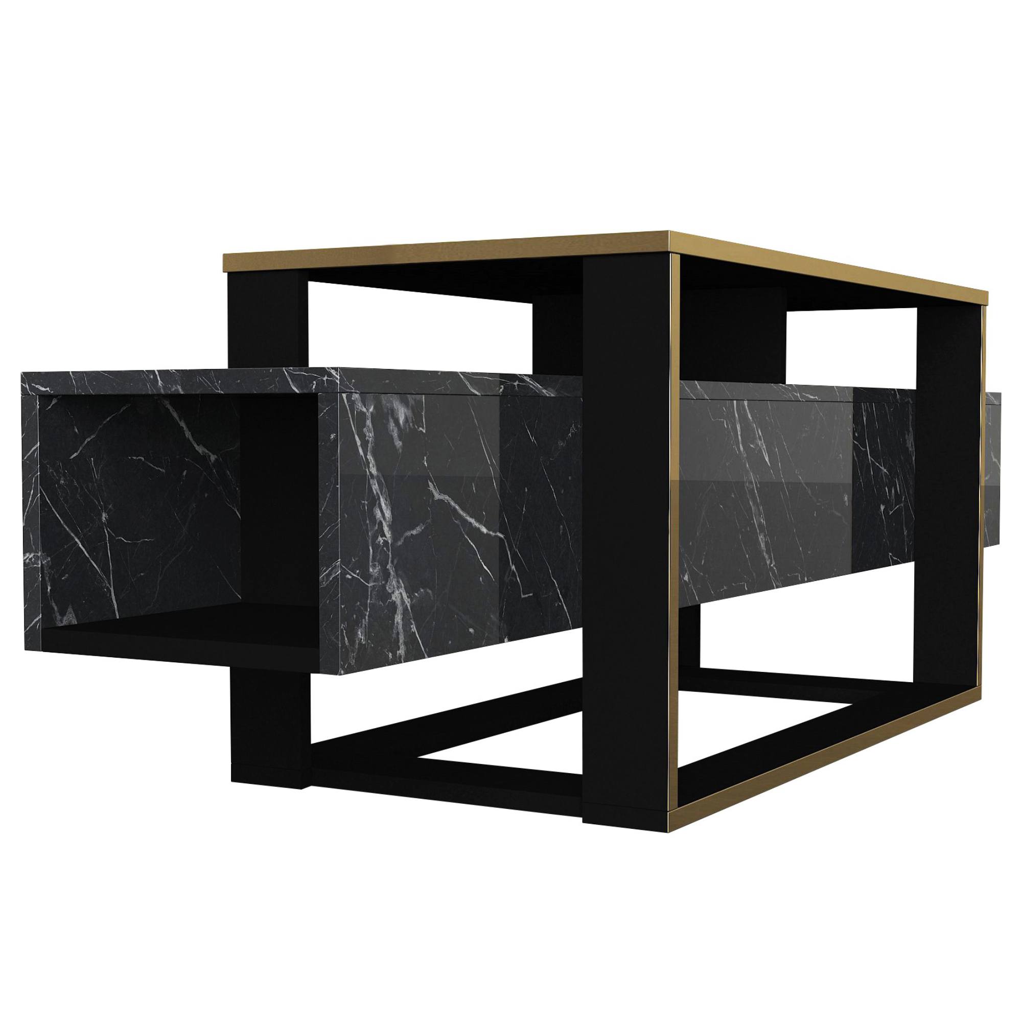 Vyrobena je z laminovaného dřevěného materiálu, pro který je typická snadná udržovatelnost i dlouhá životnost. Korpus prostřední části imituje mramorovou desku – ta komodě dodává kontrastní rozměr a interiéru punc luxusu. Mramorový korpus obepíná konstrukce se zlatými prvky, která ve spod přirozeně přechází ve stabilní podnož.