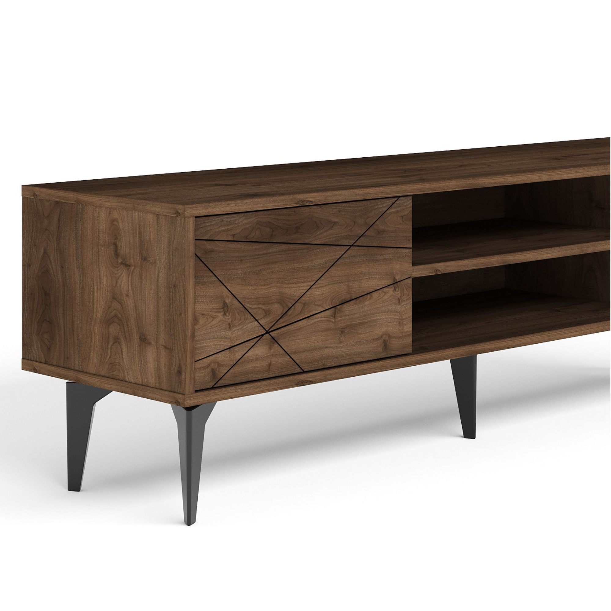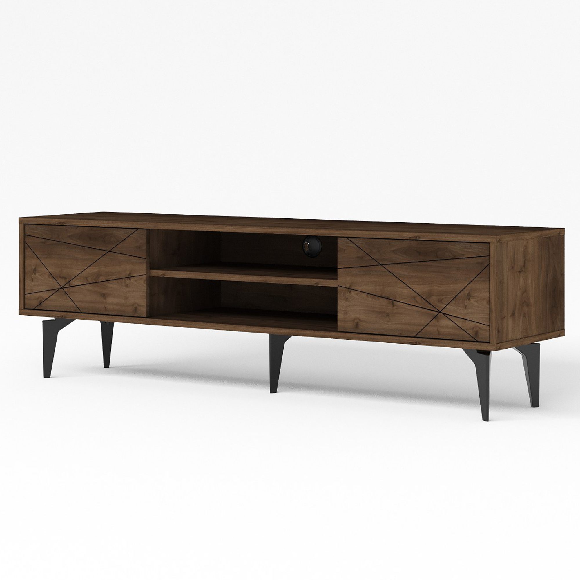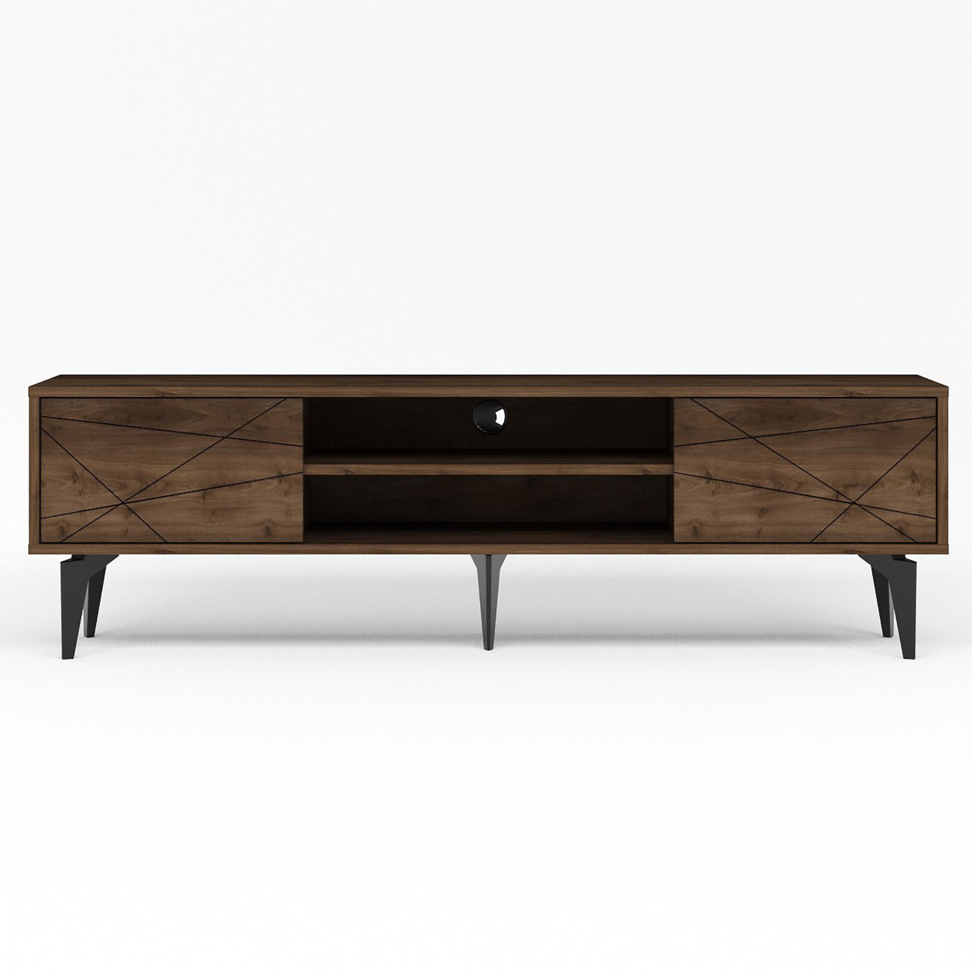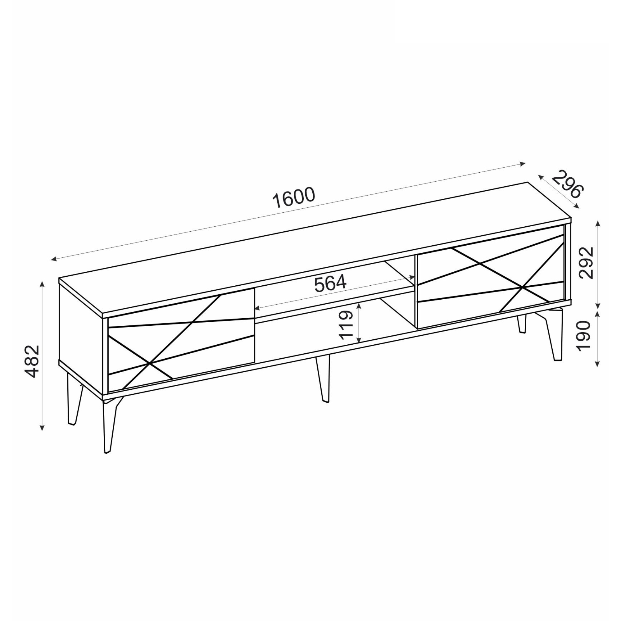 Uprostřed komody je otevřený úložný prostor s 1 policí a otvorem pro kabeláž. Ta je ideální pro umístění set top boxů, DVD přehrávačů a jiné elektroniky. Dále disponuje 2 otočnými dvířky, za kterými naleznete další úložný prostor. Ten poskytuje dostatek místa pro odložení všeho, co potřebujete mít po ruce. Vrchní deska o šířce 160 cm nabízí prostor pro televizi, ovladače i dekorace. Dvířka jsou doplněna tenkými liniemi, které oživují jinak jednoduchý vzhled. Díky provedení bez úchytek design hezky vyniká.