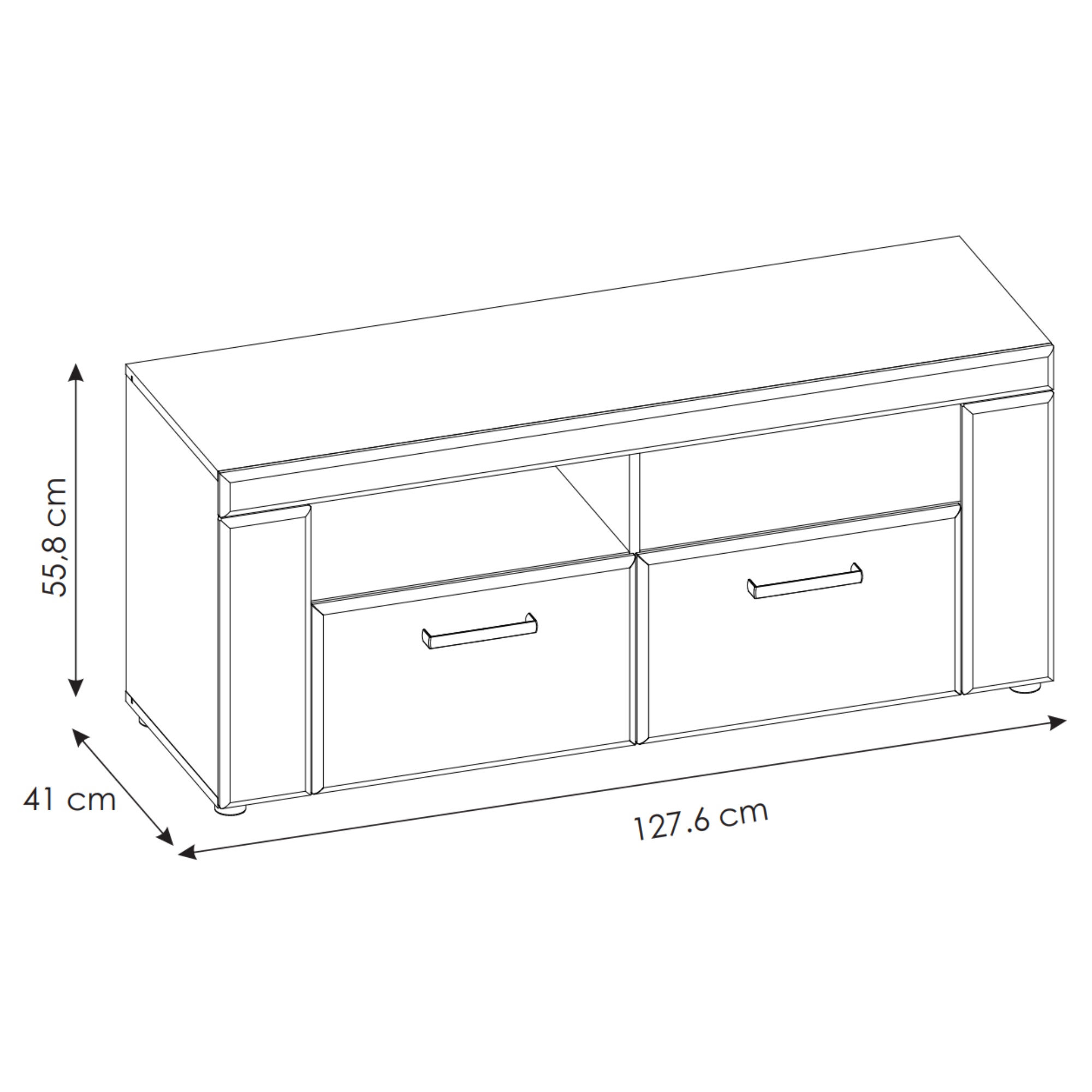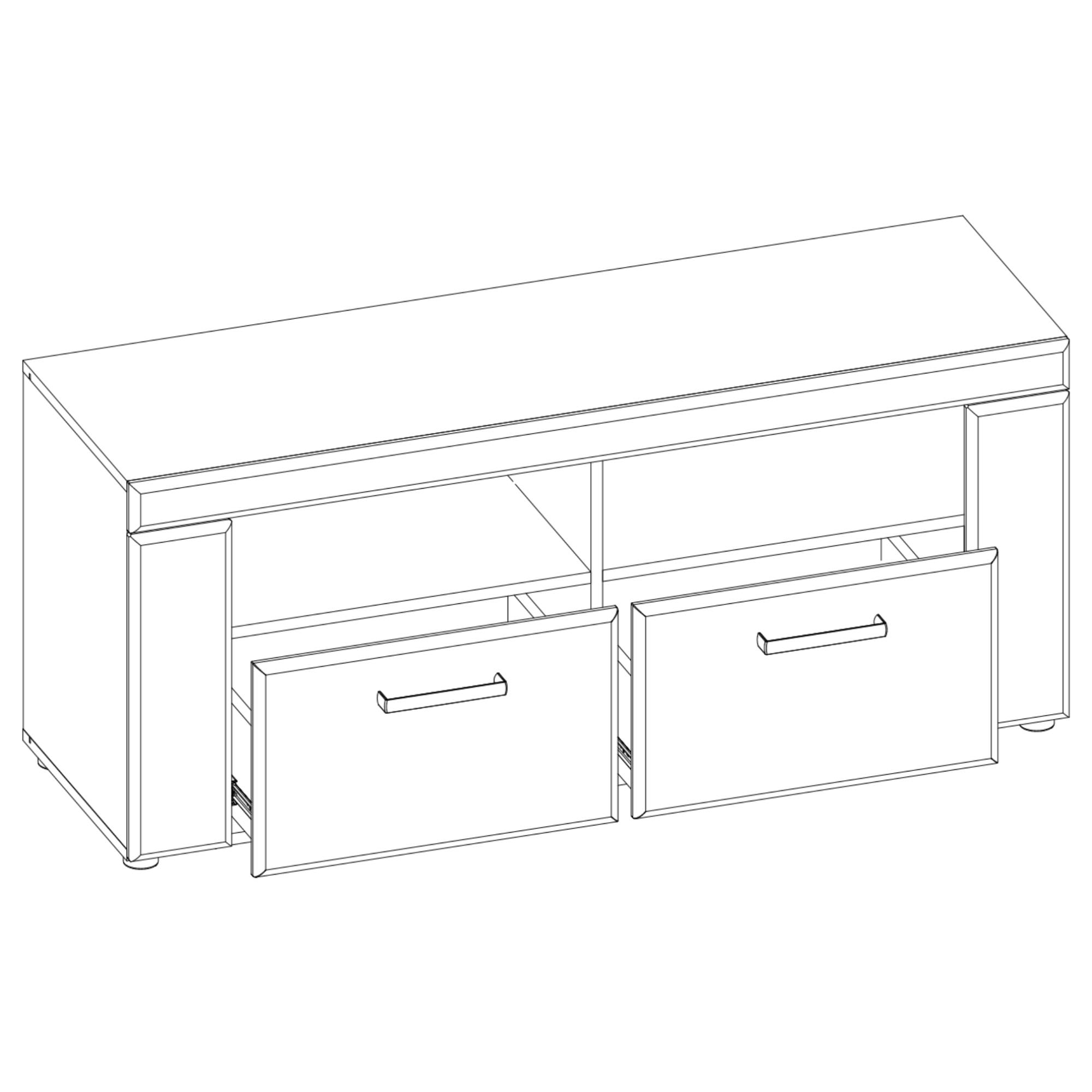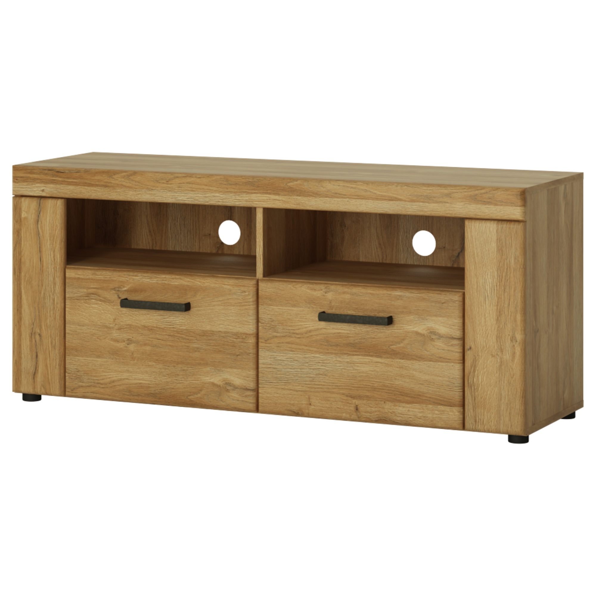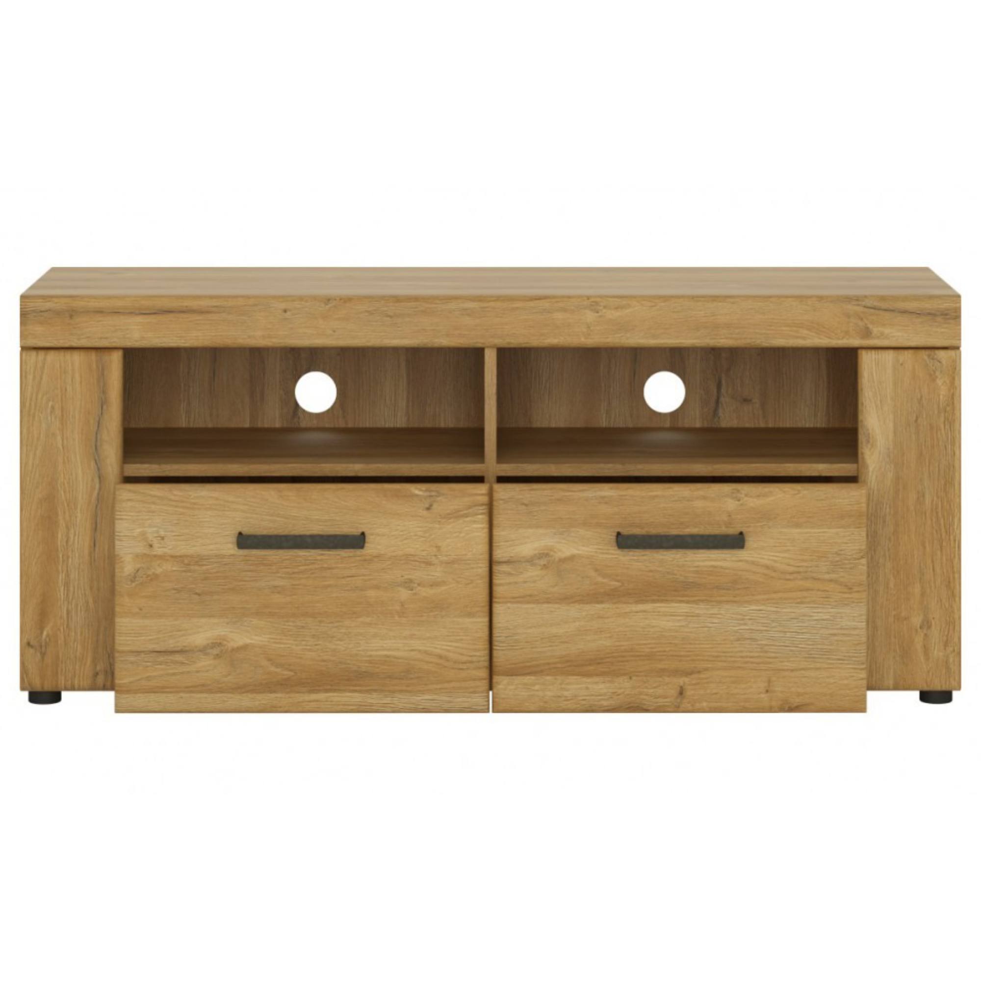 Elegantní TV komoda CORTINA nechává vyniknout výrazné kresbě dřeva. Masivní struktura zásuvek v kombinaci s kovovými úchytkami připomíná klasický dřevěný nábytek. TV komoda poskytuje dostatek krytého úložného prostoru i místo pro multimediální zařízení. Zajistí dokonalý výhled na televizi, zvládne i větší úhlopříčky a dopřeje vám nerušeně sledovat váš oblíbený pořad díky mechanismu tichého dovírání zásuvek. V zadní části otevřených poliček je praktický otvor, kde snadno ukryjete směsici kabelů. TV komoda CORTINA je dokonalým spojením elegance, útulnosti a funkčnosti.