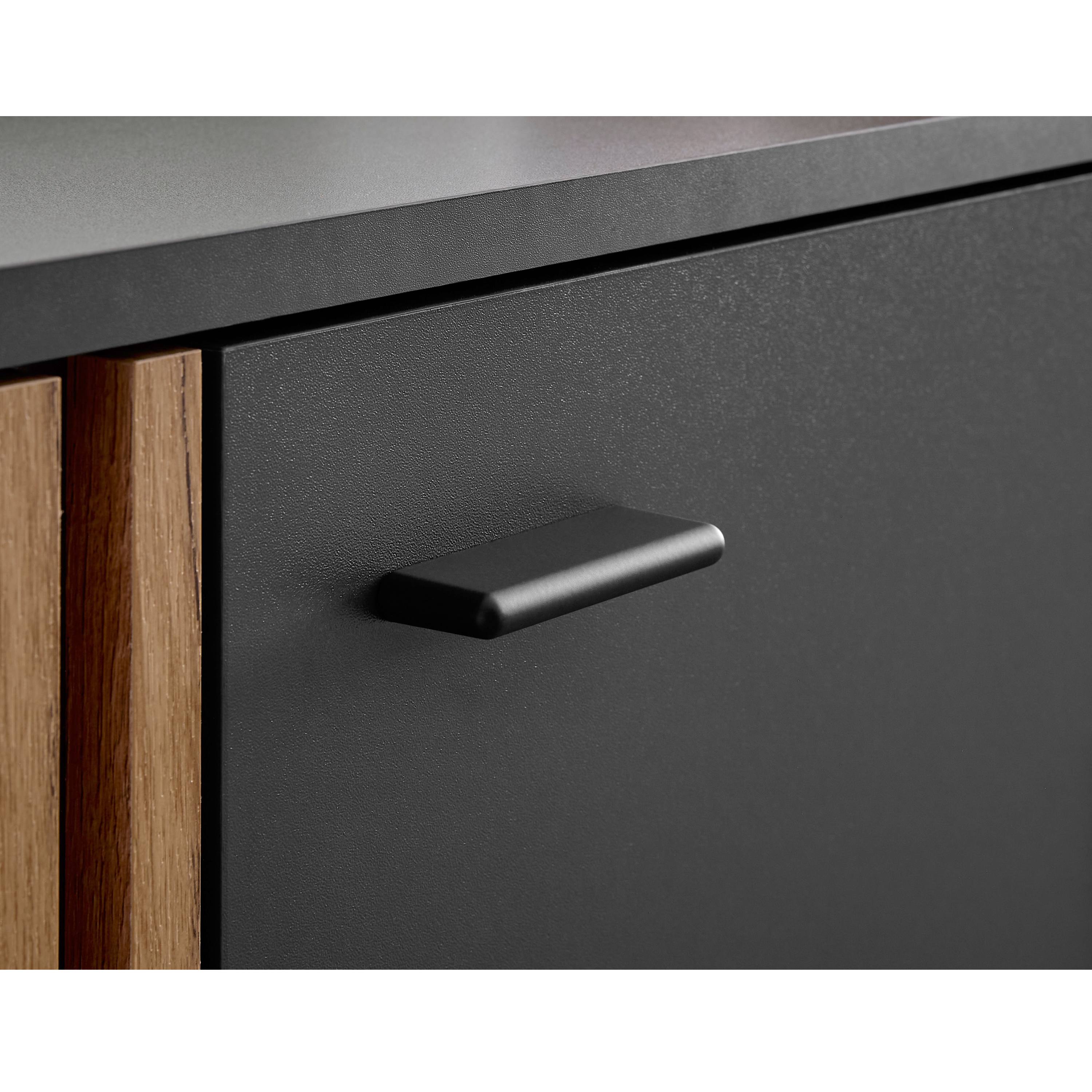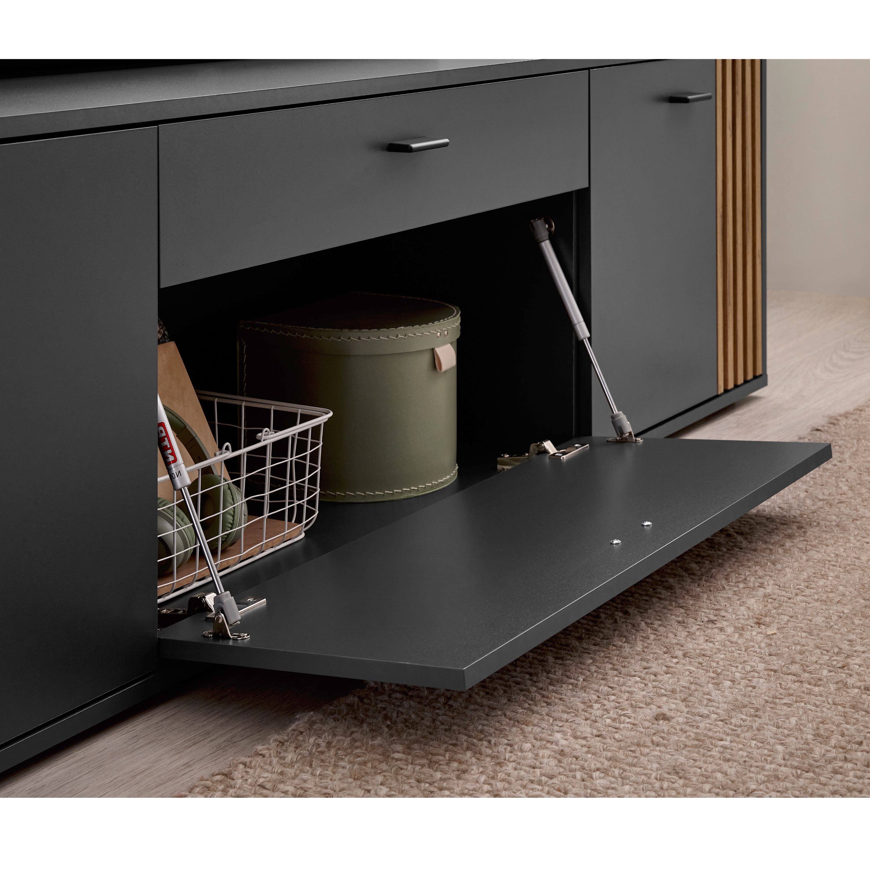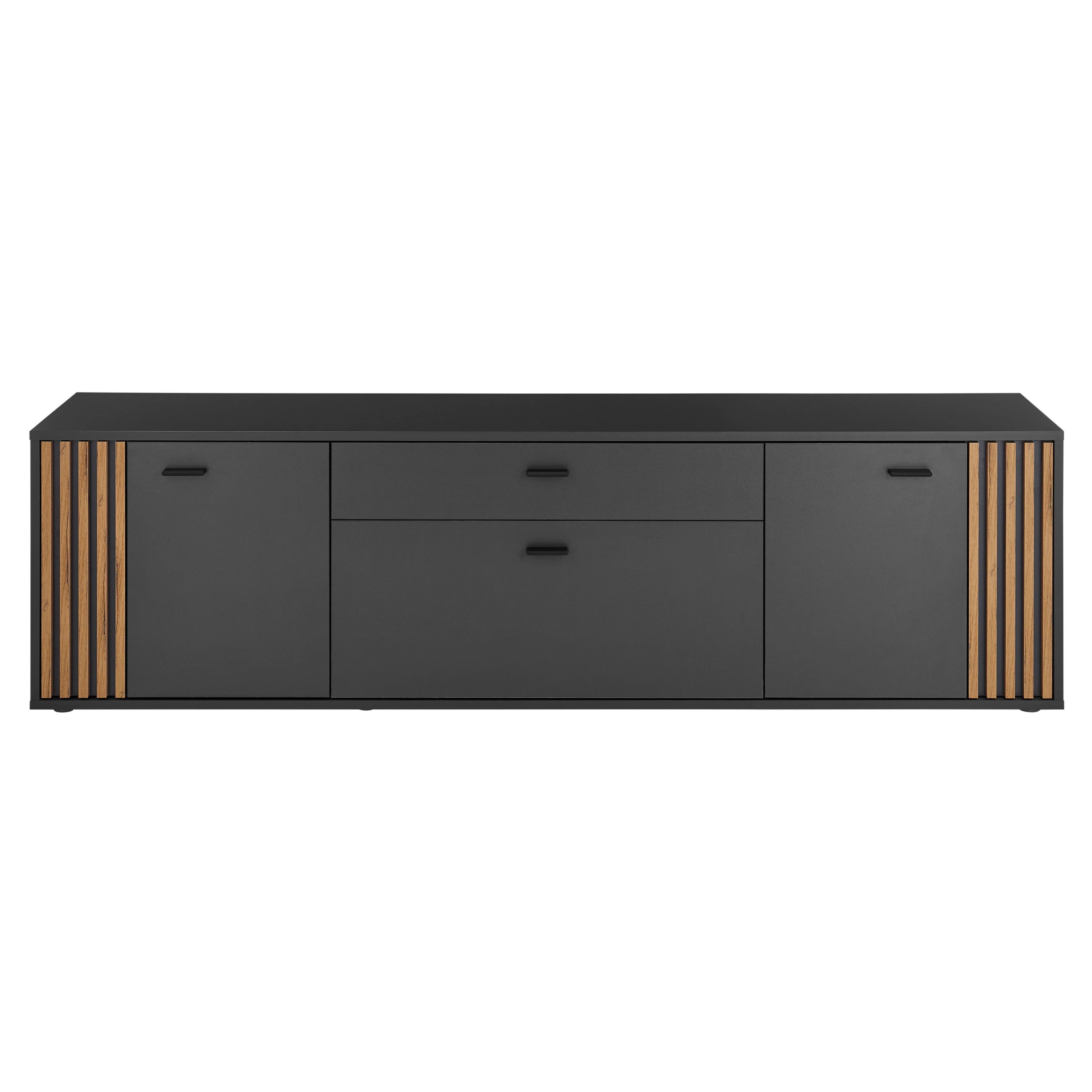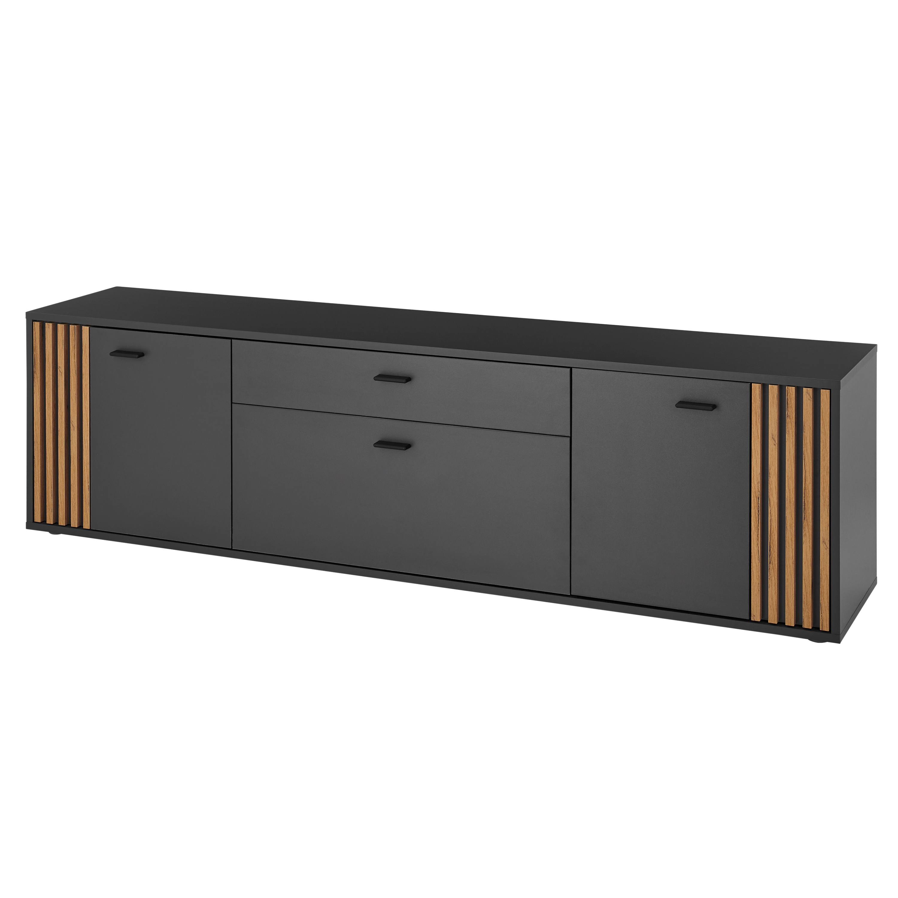 TV komoda DUBLIN v moderním designu zaujme výraznou kombinací antracitové barvy a přírodního dekoru dubu evoke, kterou doplňují dekorativní lamely na bocích. Ty dodávají nábytku osobitý charakter a vytvářejí zajímavý vizuální prvek, který oživí každý interiér.