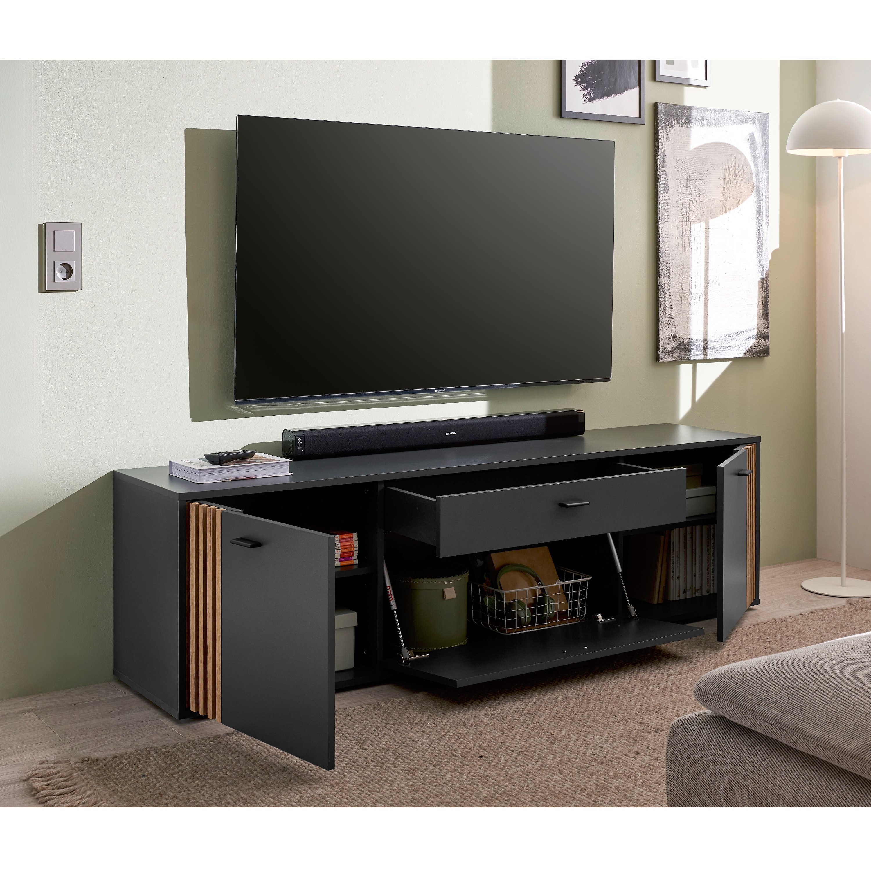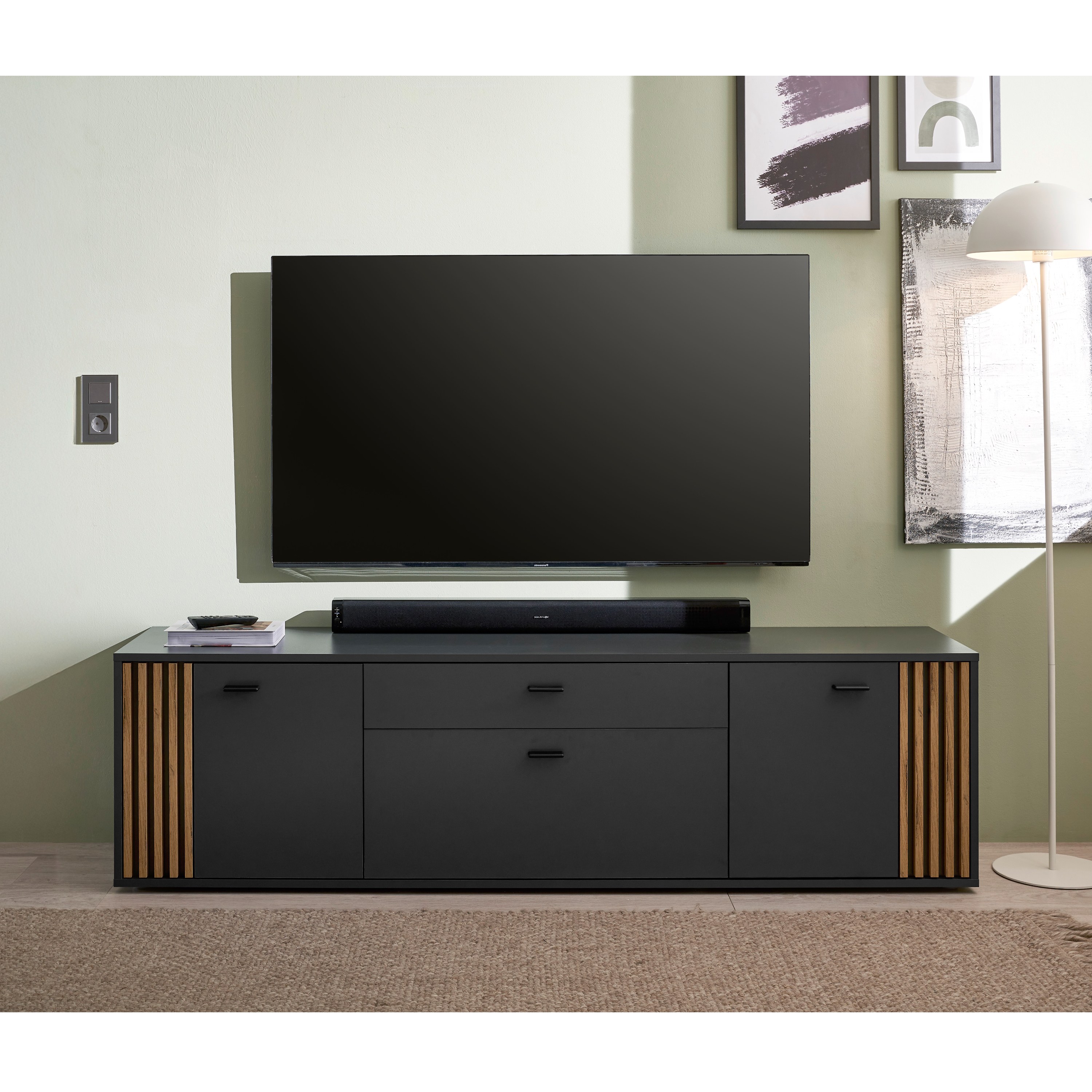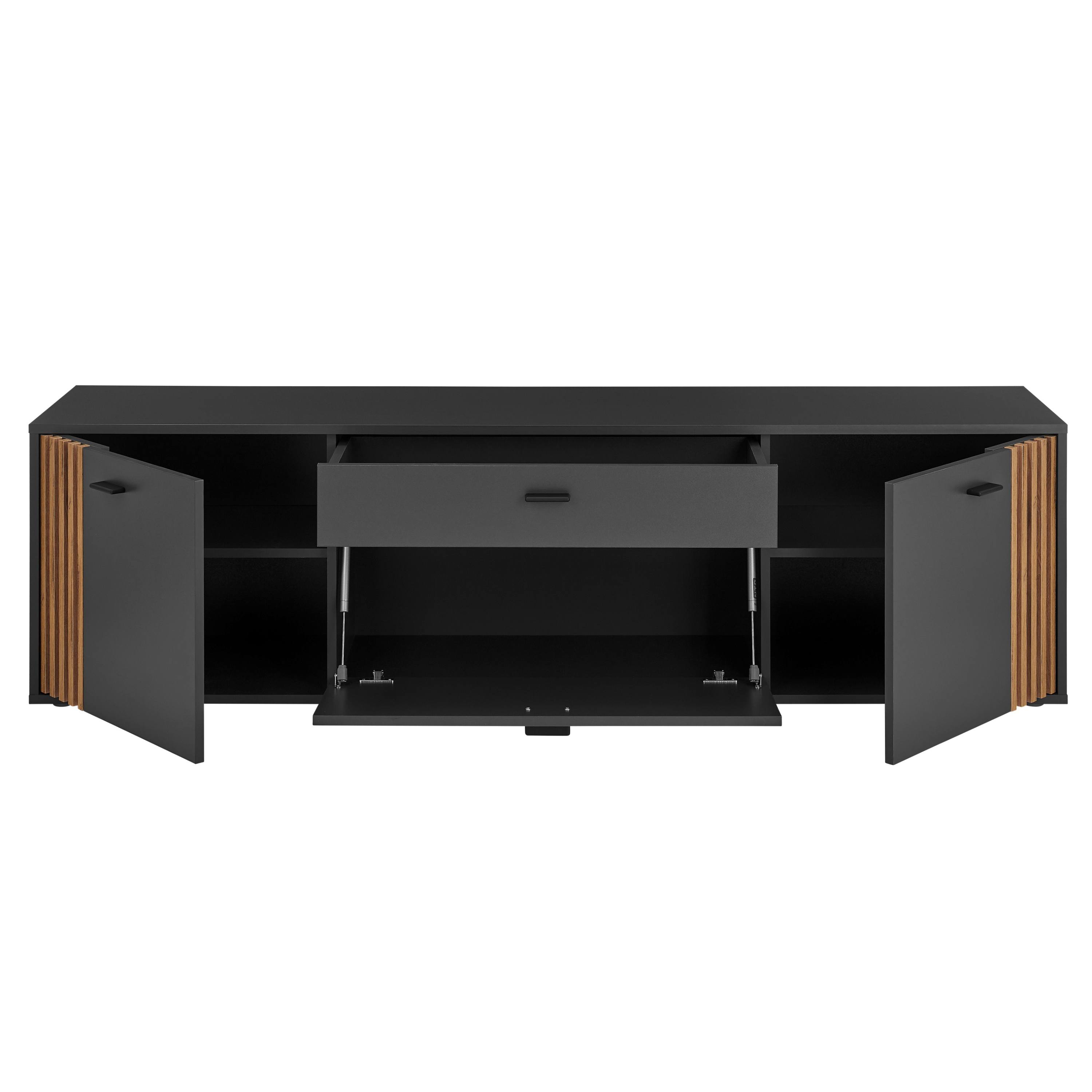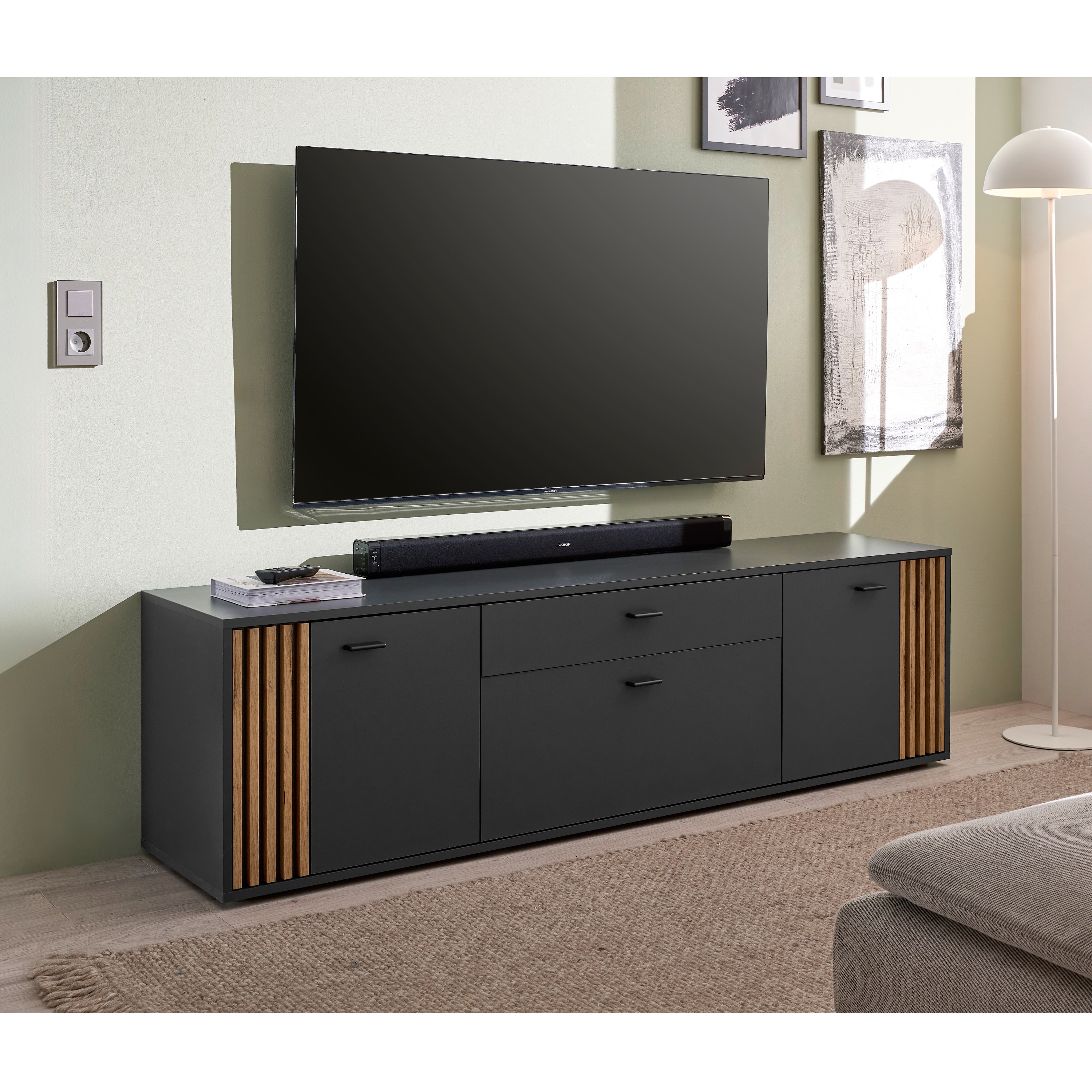 TV komoda DUBLIN v moderním designu zaujme výraznou kombinací antracitové barvy a přírodního dekoru dubu evoke, kterou doplňují dekorativní lamely na bocích. Ty dodávají nábytku osobitý charakter a vytvářejí zajímavý vizuální prvek, který oživí každý interiér.
