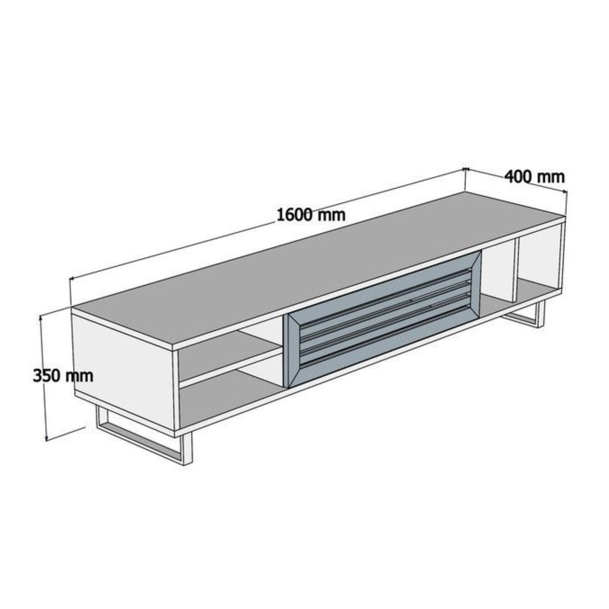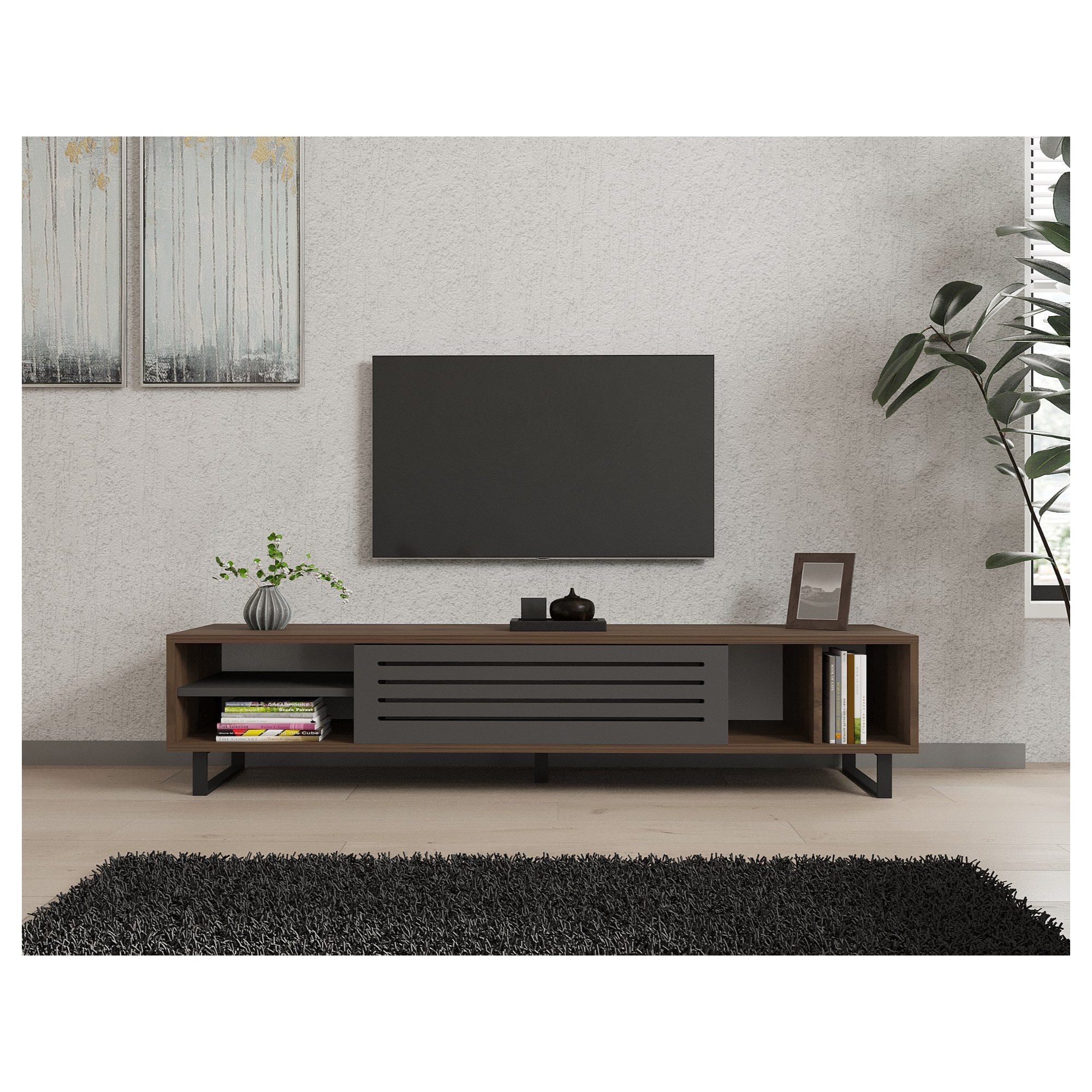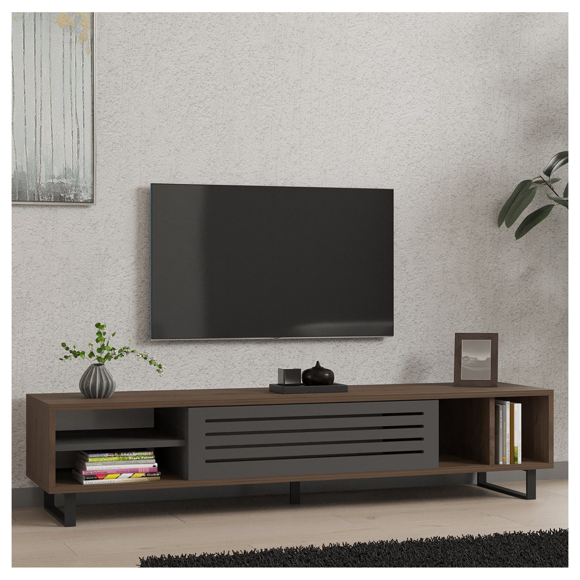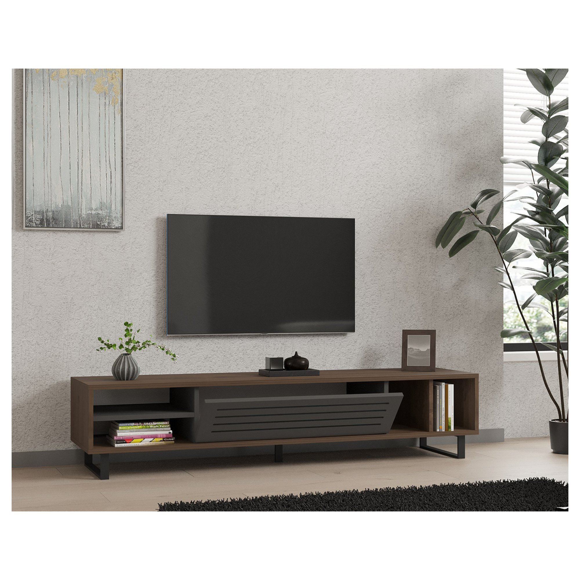 Disponuje 1 výklopnými dvířky, za kterými naleznete úložný prostor pro odložení všeho, co potřebujete mít po ruce. Na levé straně se nachází otevřený úložný prostor s 1 policí a na pravé 2 oddělené úložné prostory. Vrchní deska o šířce 160 cm nabízí dostatek místa pro televizi i dekorace. Provedení bez úchytek podtrhuje její moderní vzhled.