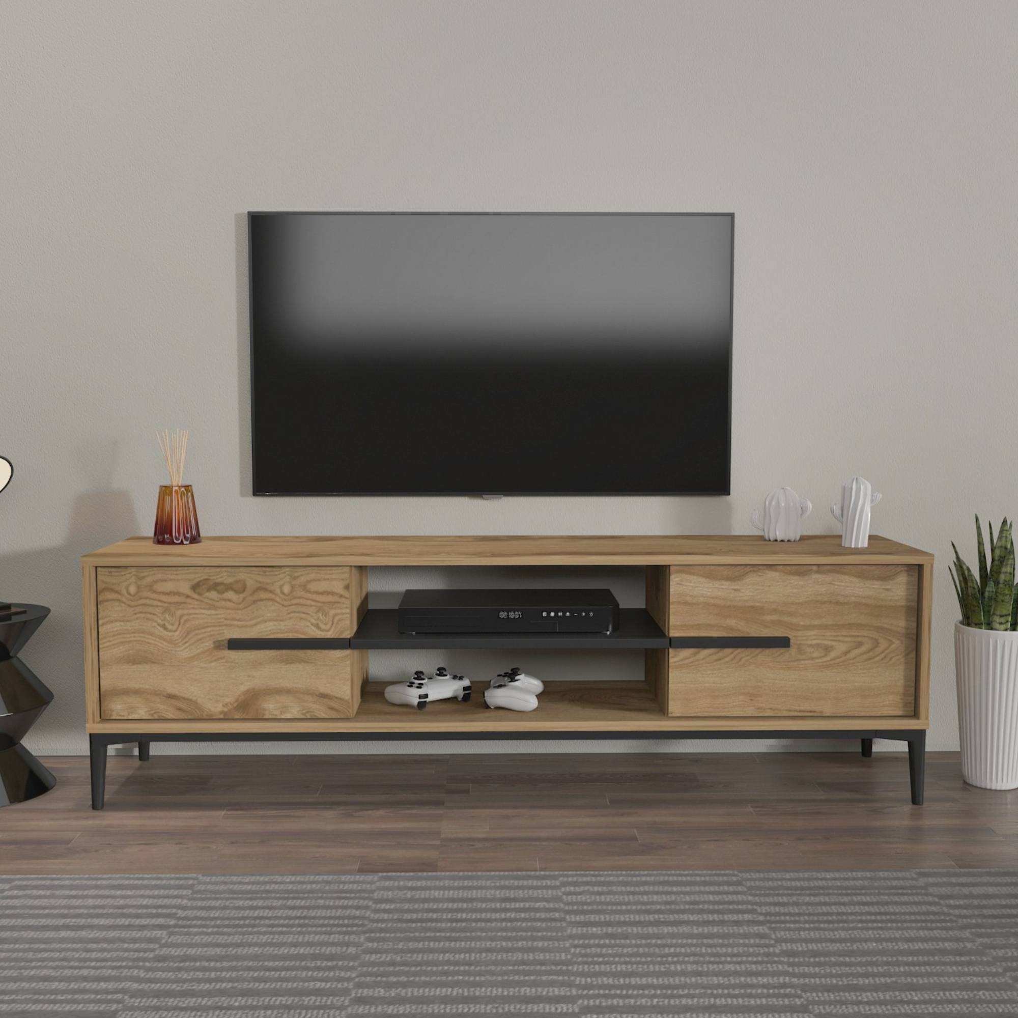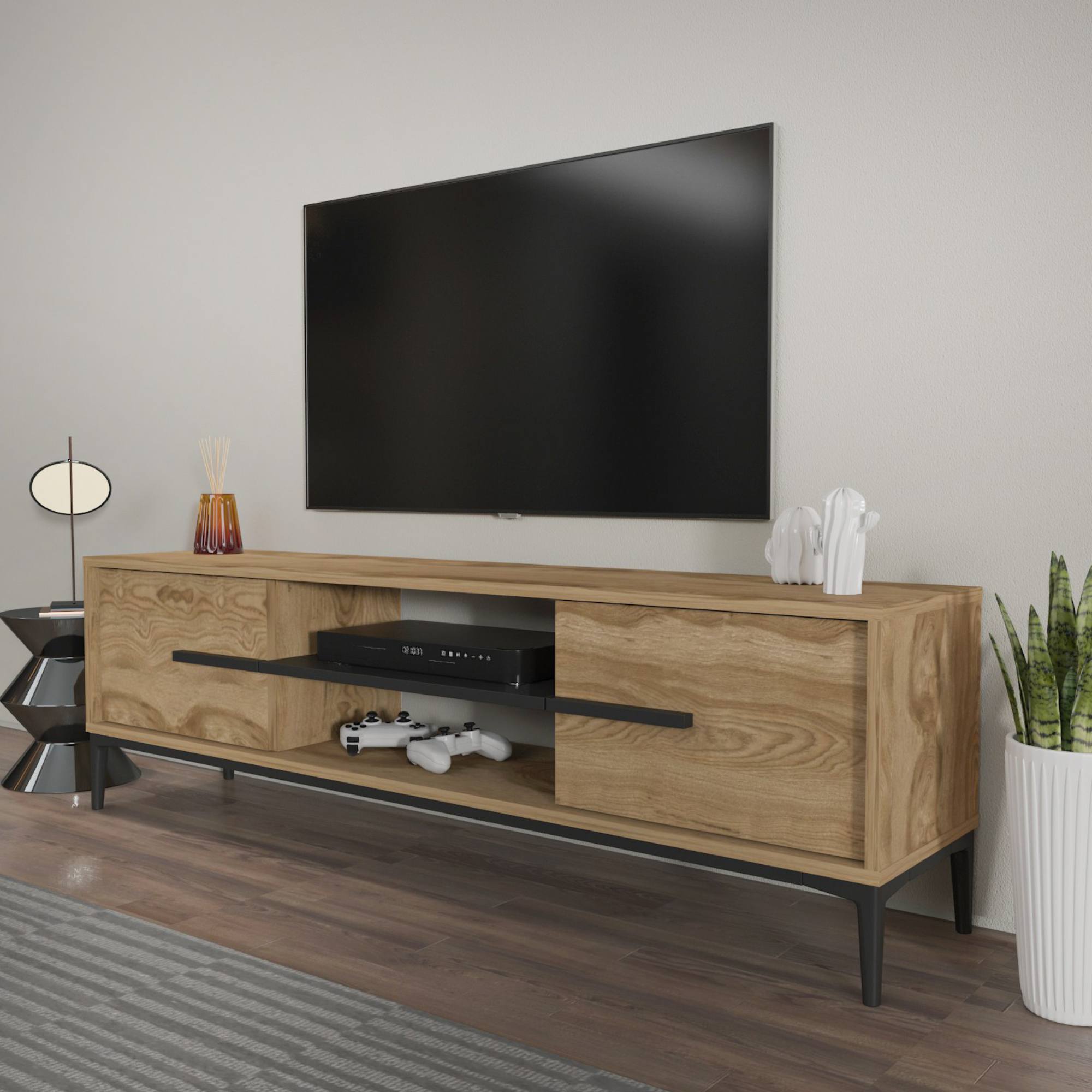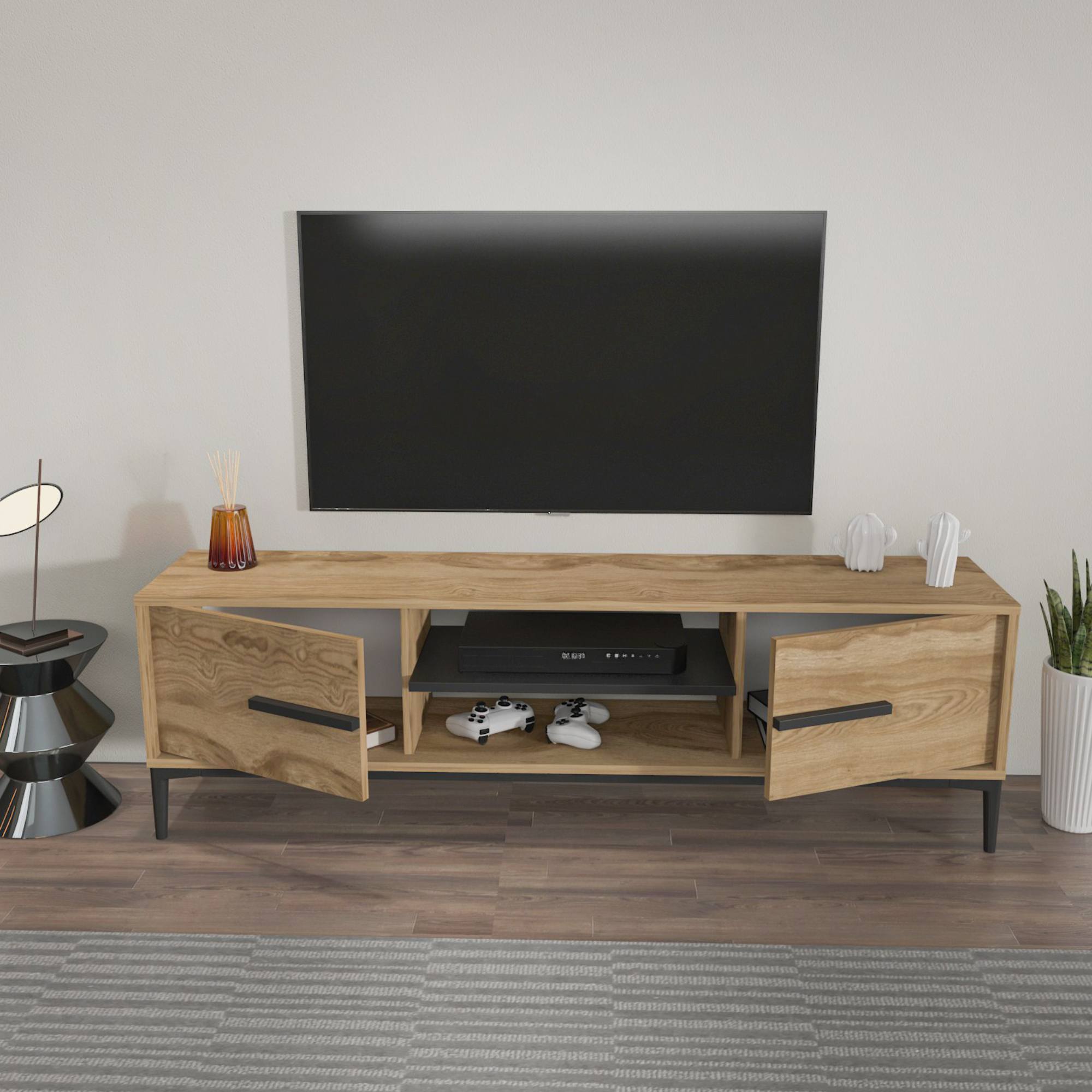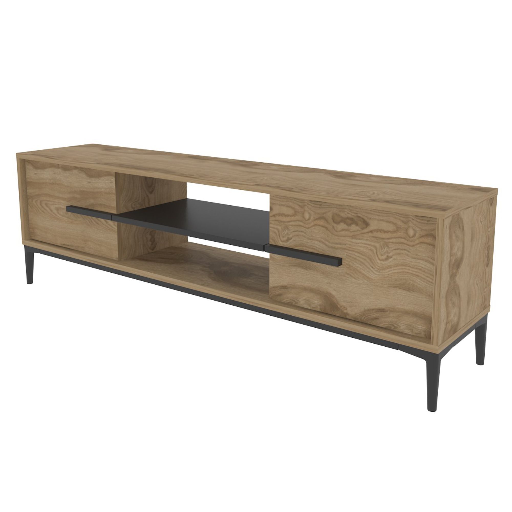 Uprostřed komody je otevřený úložný prostor s 1 policí. Ten je ideální pro umístění set top boxů, DVD přehrávačů a jiné elektroniky. Dále disponuje 2 otočnými dvířky, za kterými naleznete další úložný prostor. Ten poskytuje dostatek místa pro odložení všeho, co potřebujete mít po ruce. Vrchní deska o šířce 120 cm nabízí prostor pro televizi, ovladače i dekorace. Zajímavým designovým prvkem jsou úchyty, které plynule navazují na polici a ozvláštňují jinak jednoduchý design komody.