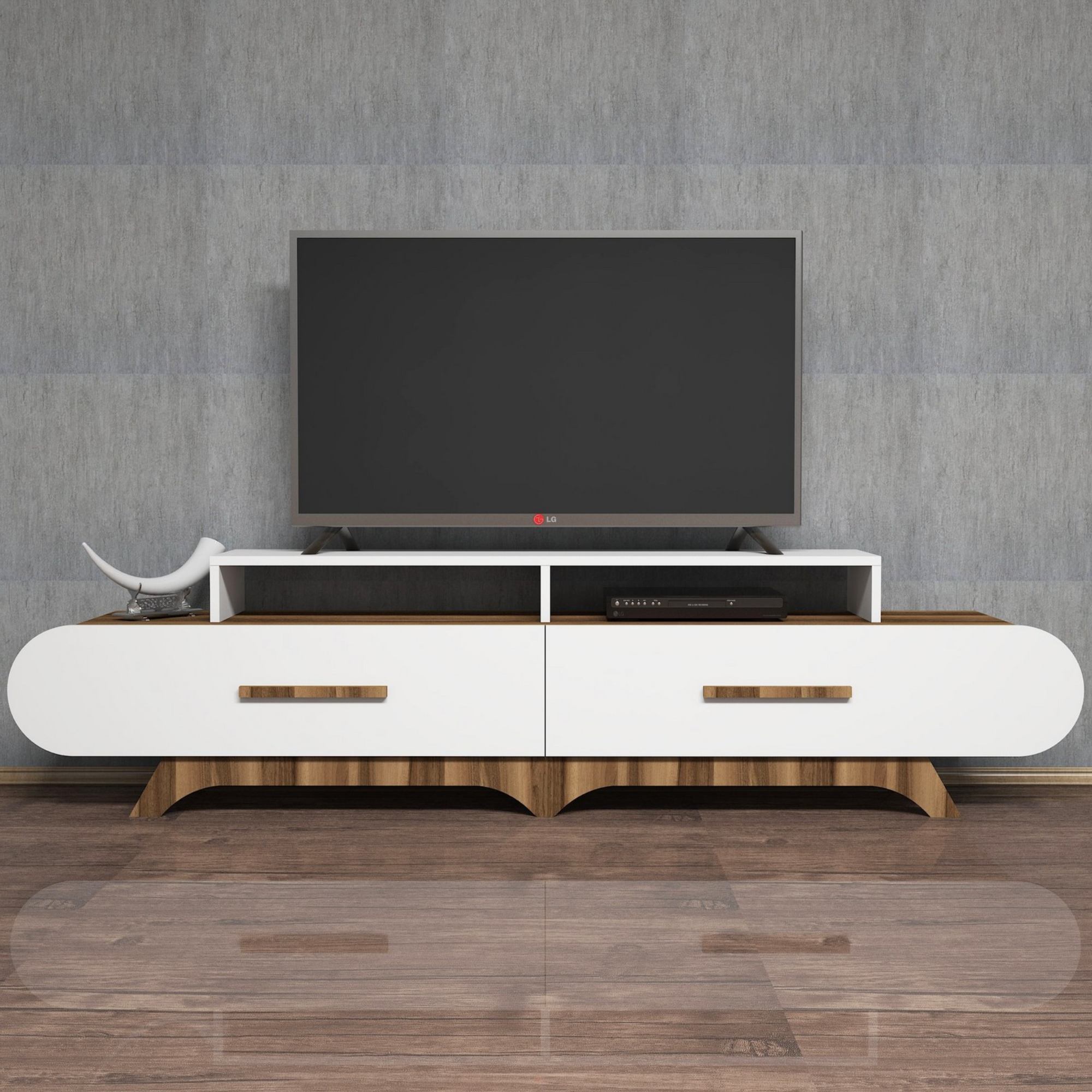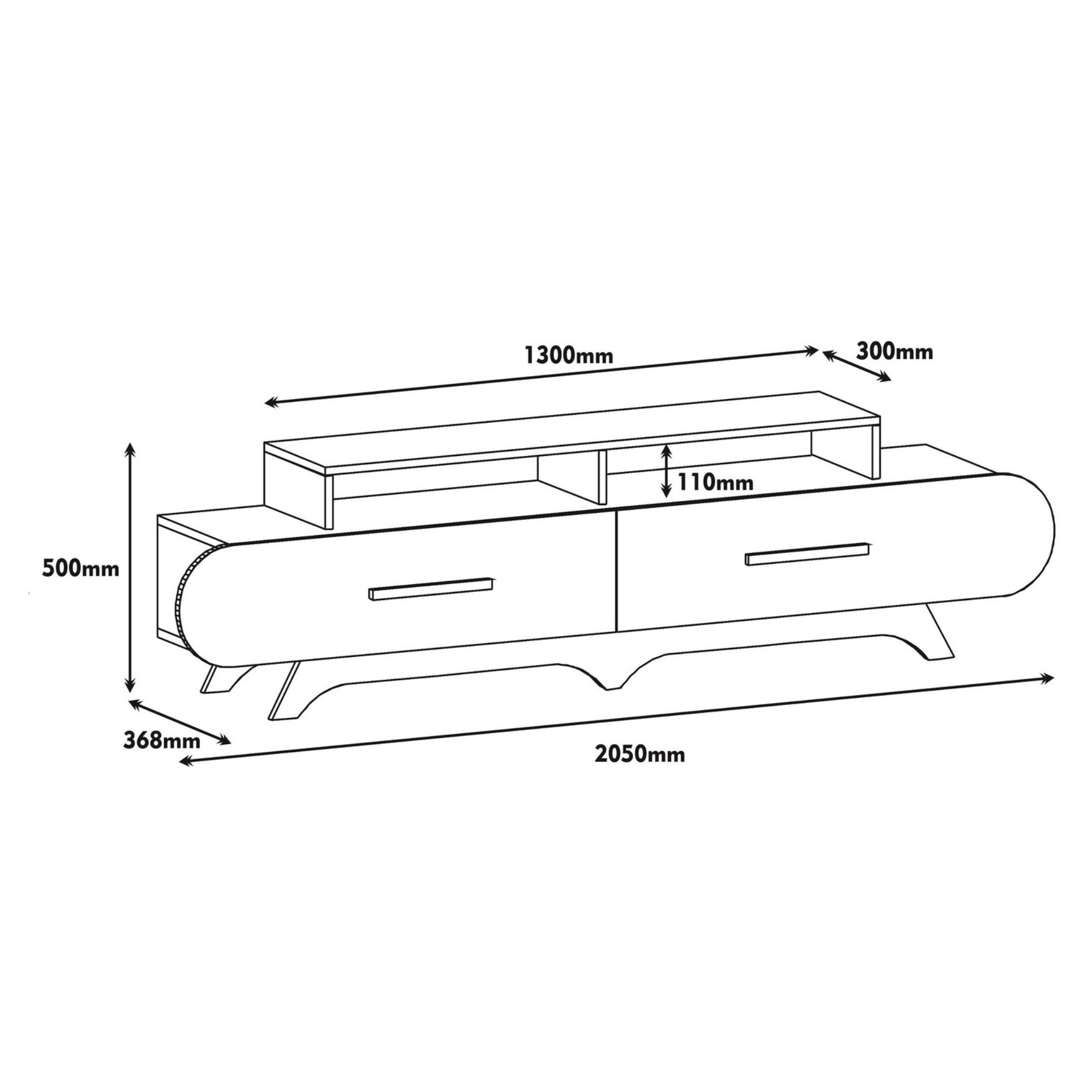 Disponuje 2 výklopnými dvířky, za kterými se nachází úložný prostor s dostatkem místa pro odložení všeho, co potřebujete mít po ruce. Dvířka jsou vybavena praktickými úchyty. Na vrchní desce o šířce 205 cm je umístěna police o šířce 130 cm, která slouží k umístění televize. Pod policí se nacházejí 2 oddělené úložné prostory, ideální pro umístění set top boxů, DVD přehrávačů a jiné elektroniky.