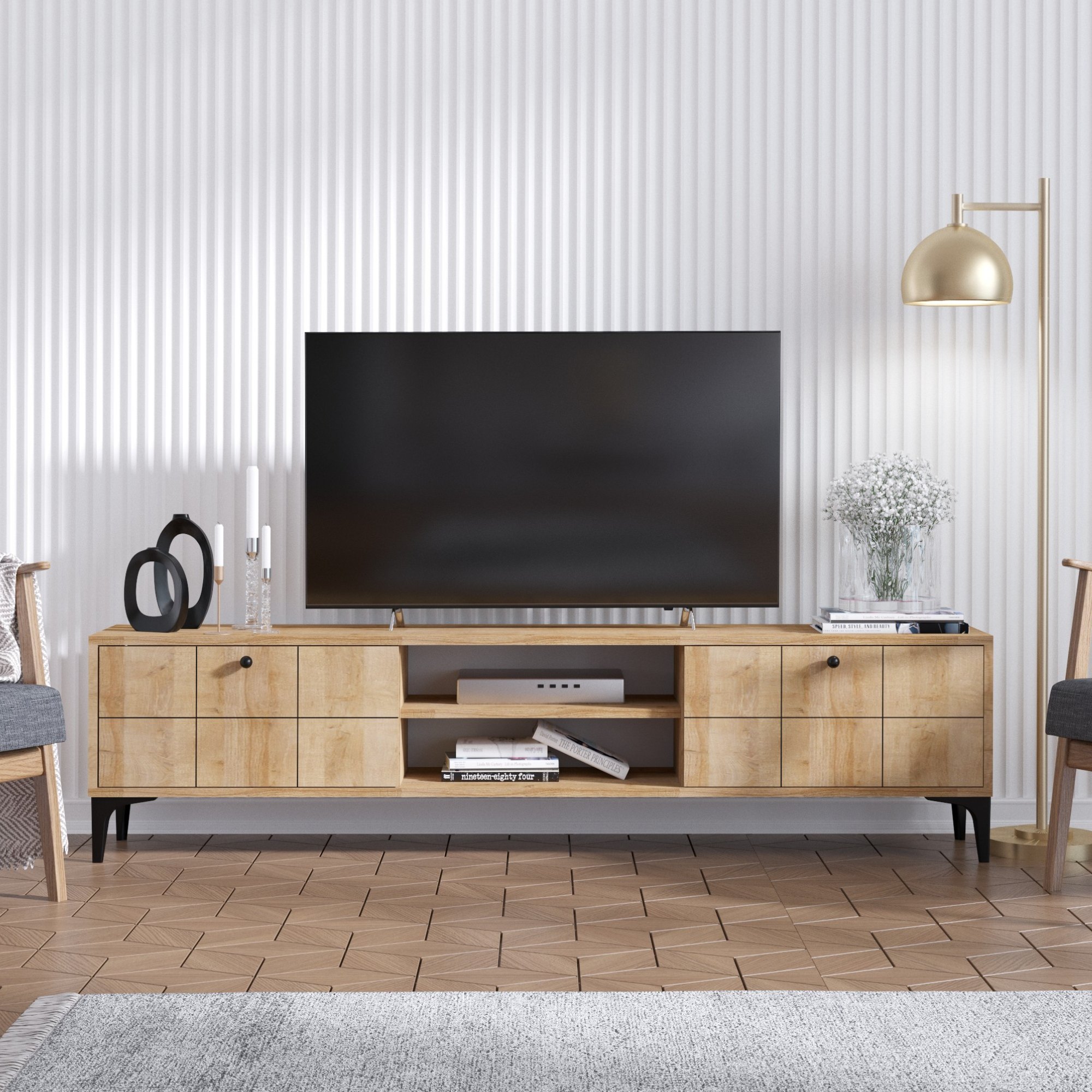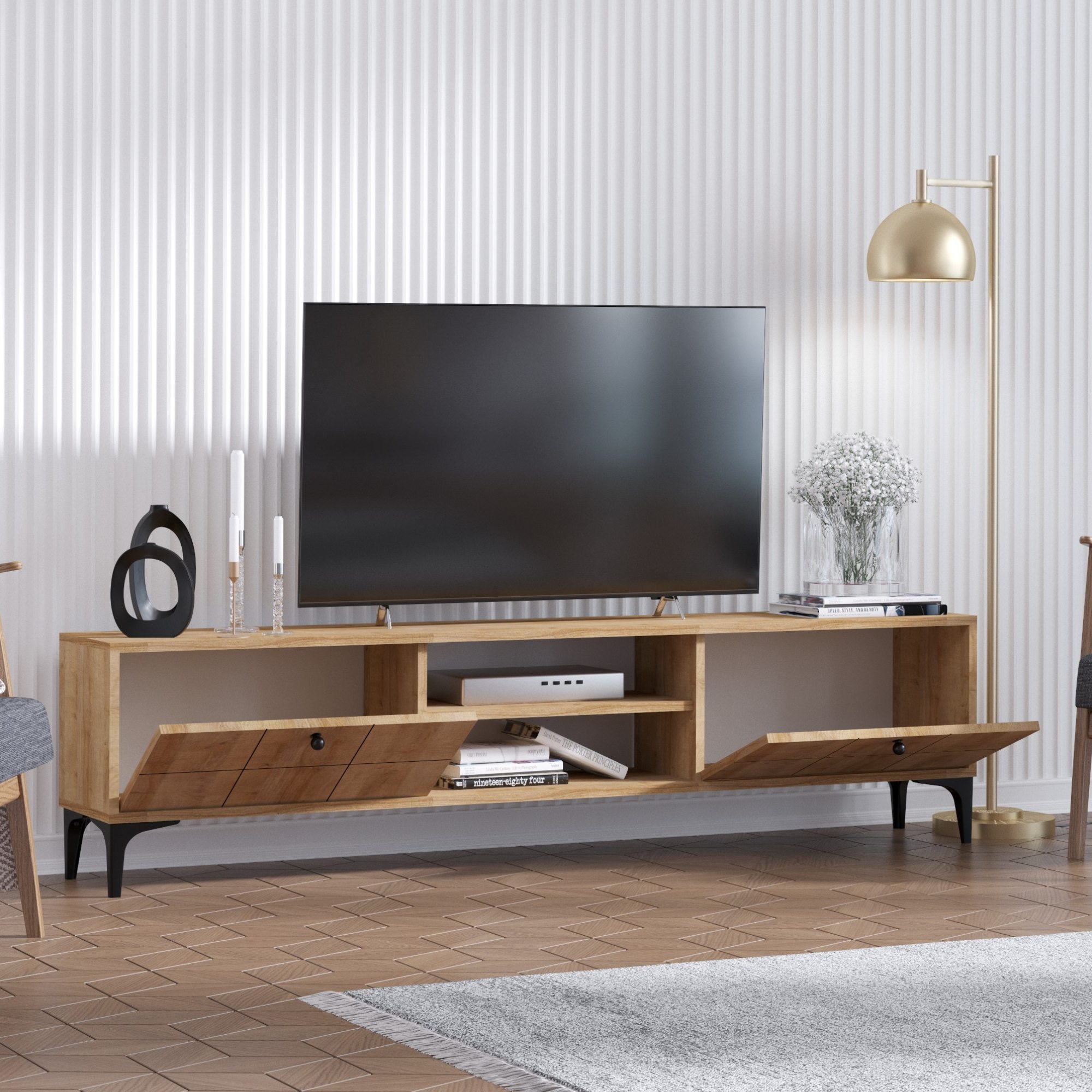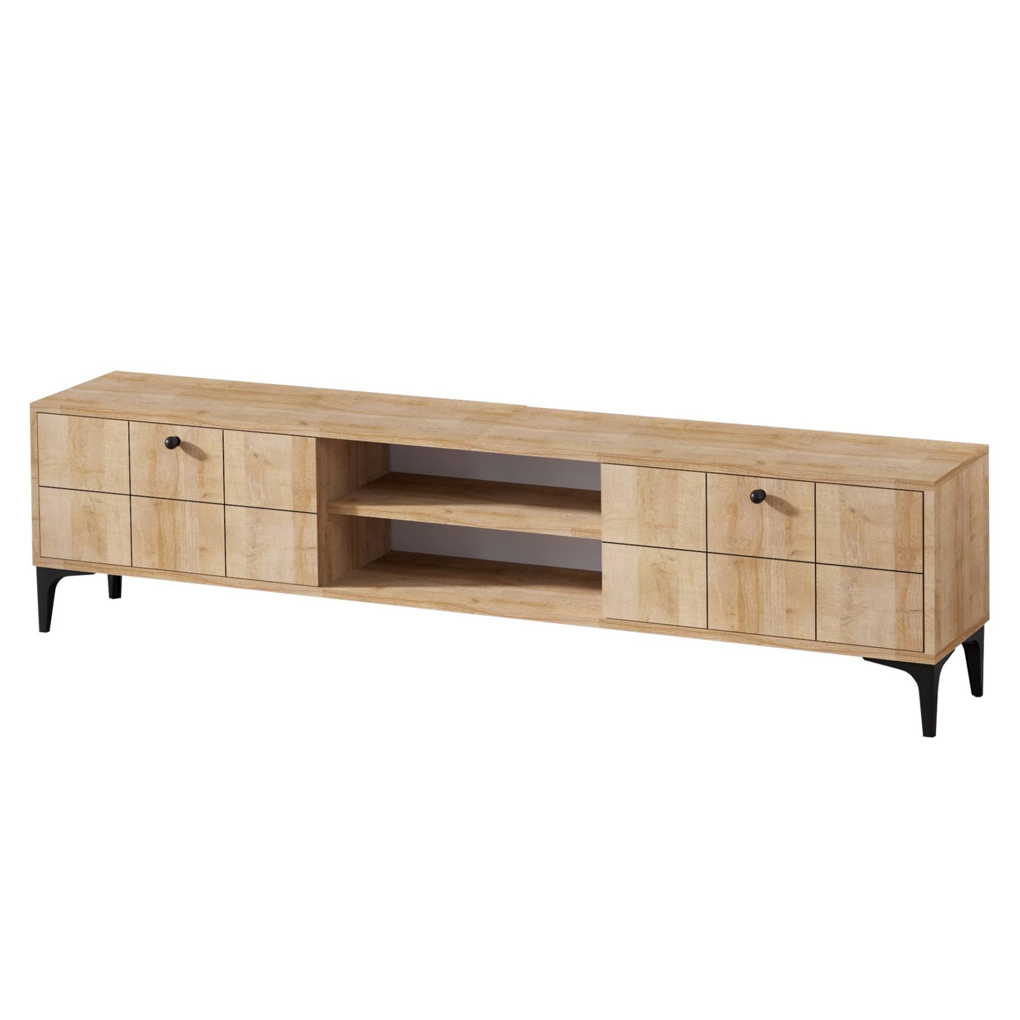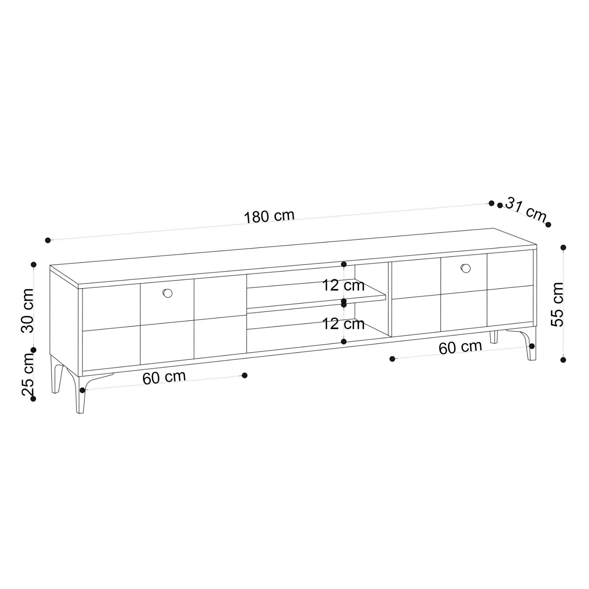 Uprostřed komody je otevřený úložný prostor s 1 policí. Ta je ideální pro umístění set top boxů, DVD přehrávačů či jiné elektroniky. Dále disponuje 2 výklopnými dvířky, která poskytují další úložný prostor pro odložení všeho, co potřebujete mít po ruce. Dvířka jsou doplněna praktickými úchyty pro pohodlnější manipulaci. Vrchní deska o šířce 180 cm nabízí prostor pro televizi, ovladače i dekorace.