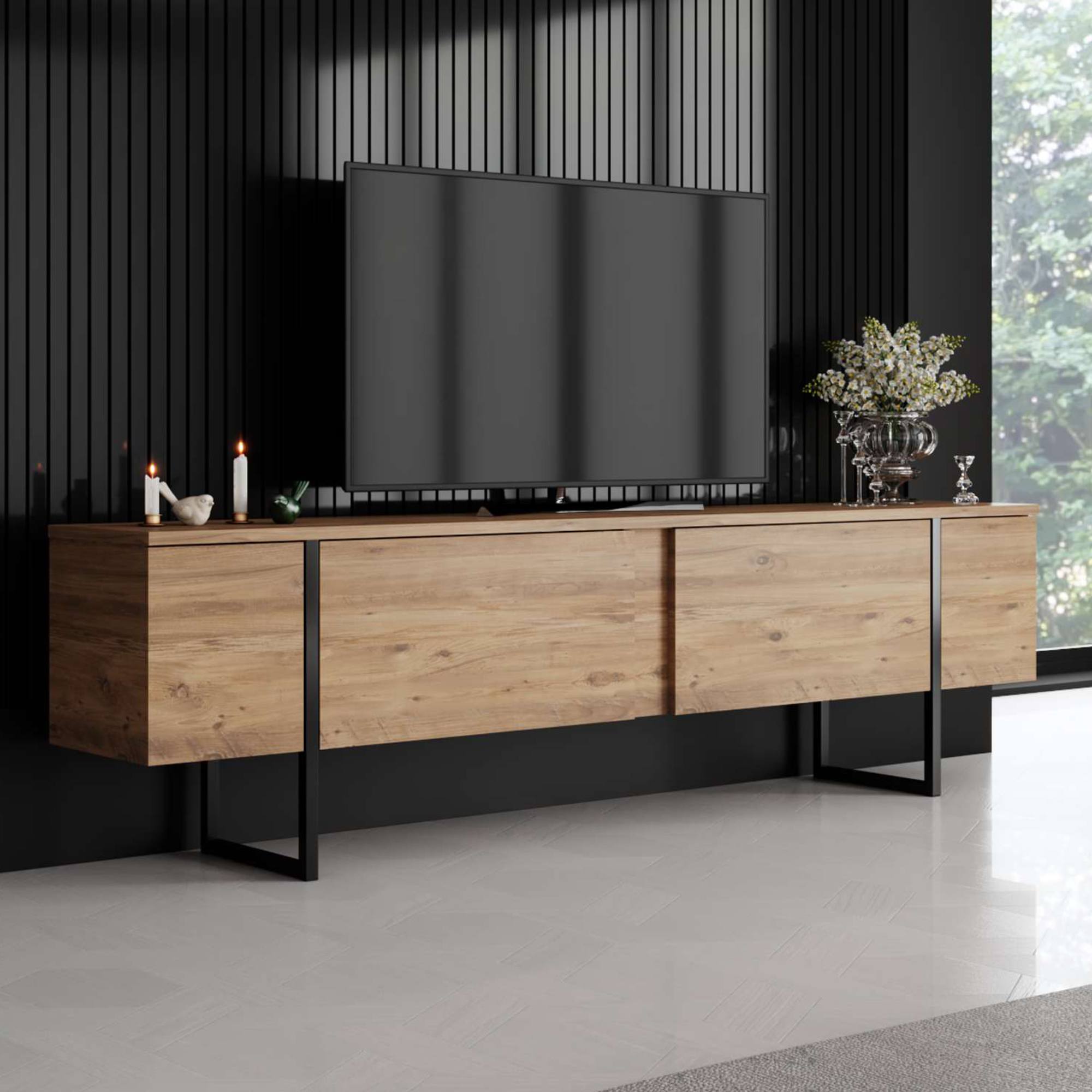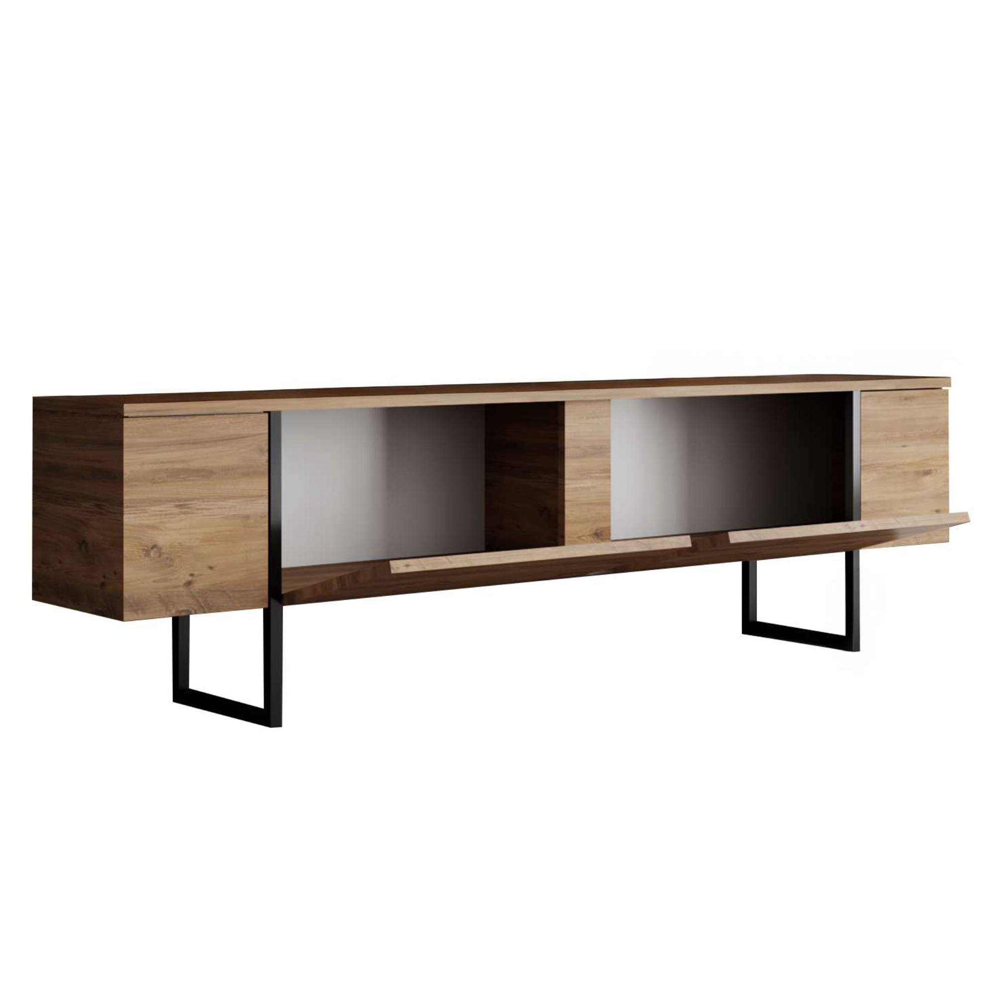 Dostatečně široká horní deska vám kromě samotné televize nabídne prostor i pro TV příslušenství a jiné předměty. Vnitřek komody nabízí dva úložné prostory, které jsou chráněné výklopnými dvířky.