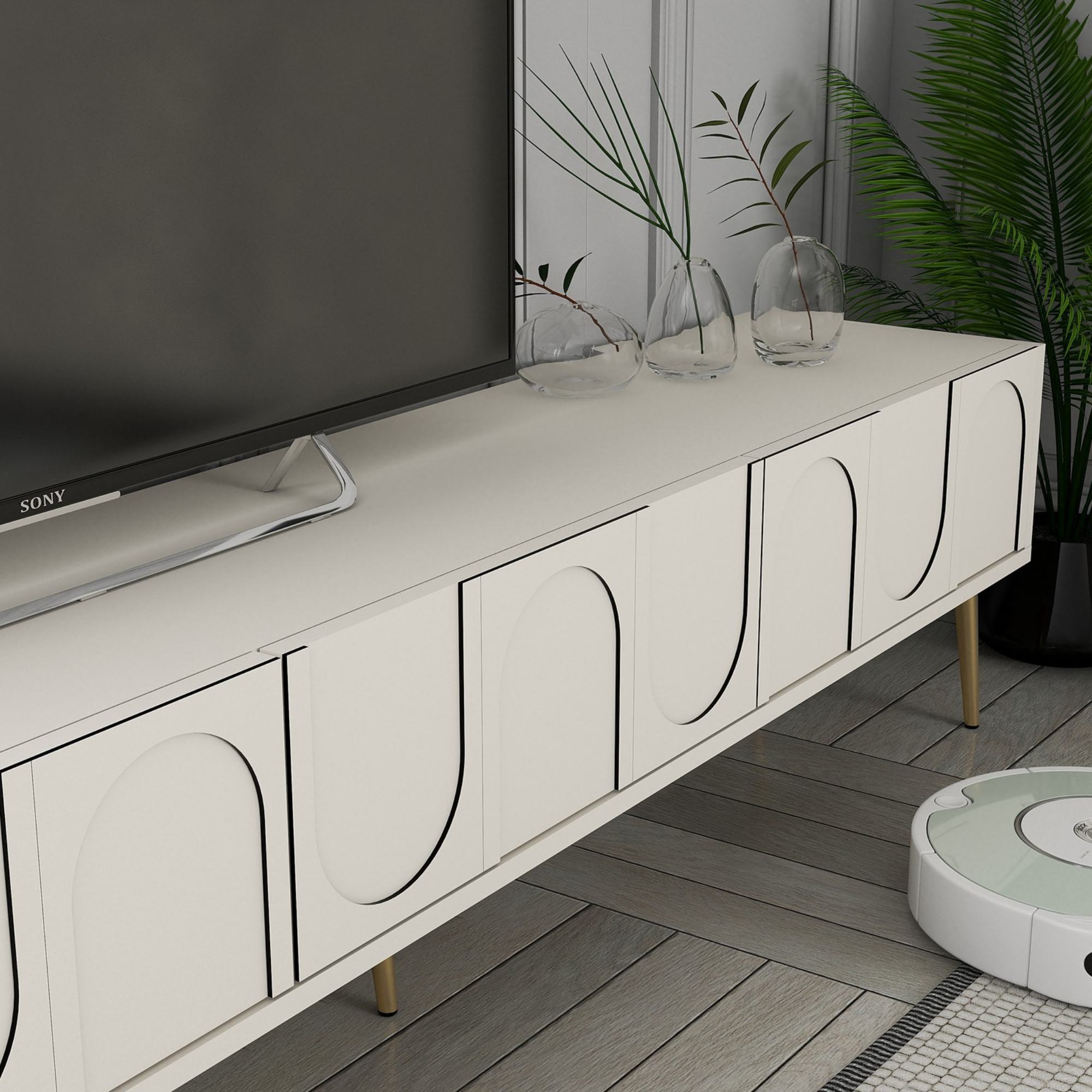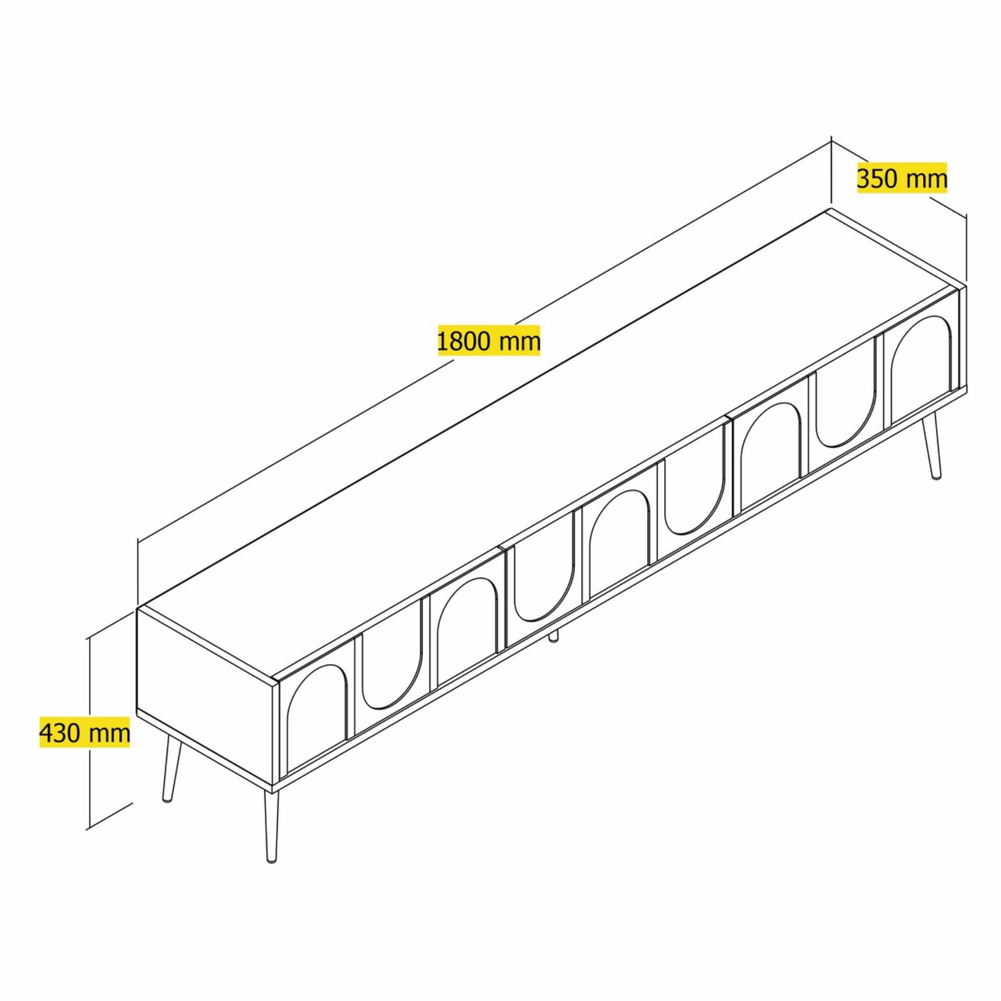 Disponuje 3 výklopnými dvířky, která odkrývají 3 oddělené úložné prostory. Ty vytvářejí dostatek místa pro odložení všeho, co potřebujete mít po ruce. Vrchní deska o šířce 180 cm nabízí prostor pro televizi, ovladače i dekorace. Dvířka jsou doplněna geometrickým vzorem, který oživuje jinak jednoduchý vzhled. Díky provedení bez úchytek design hezky vyniká. Zlaté kónické nohy skvěle doplňují její elegantní vzhled.