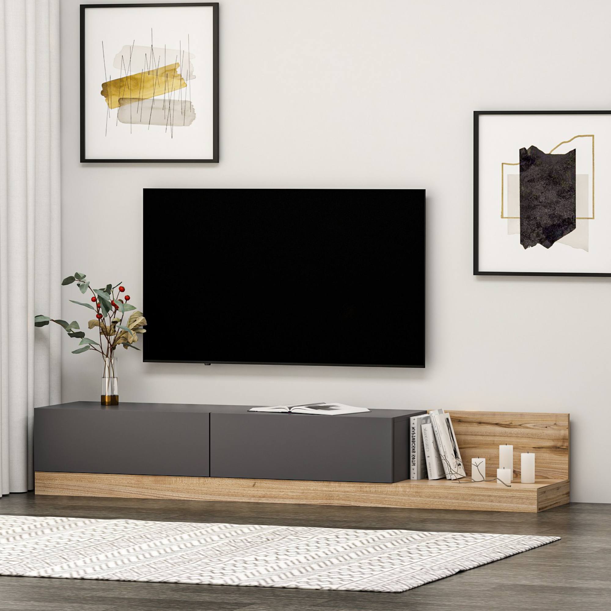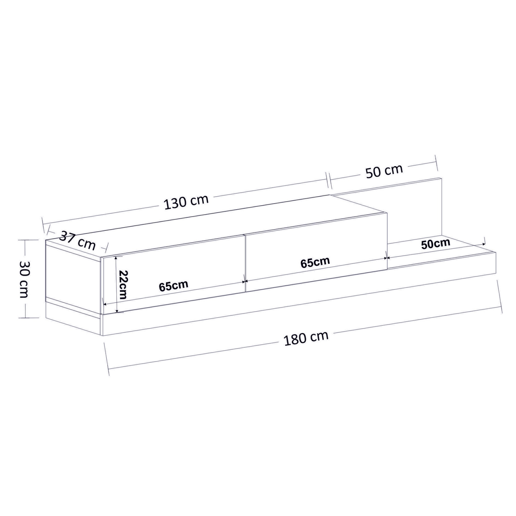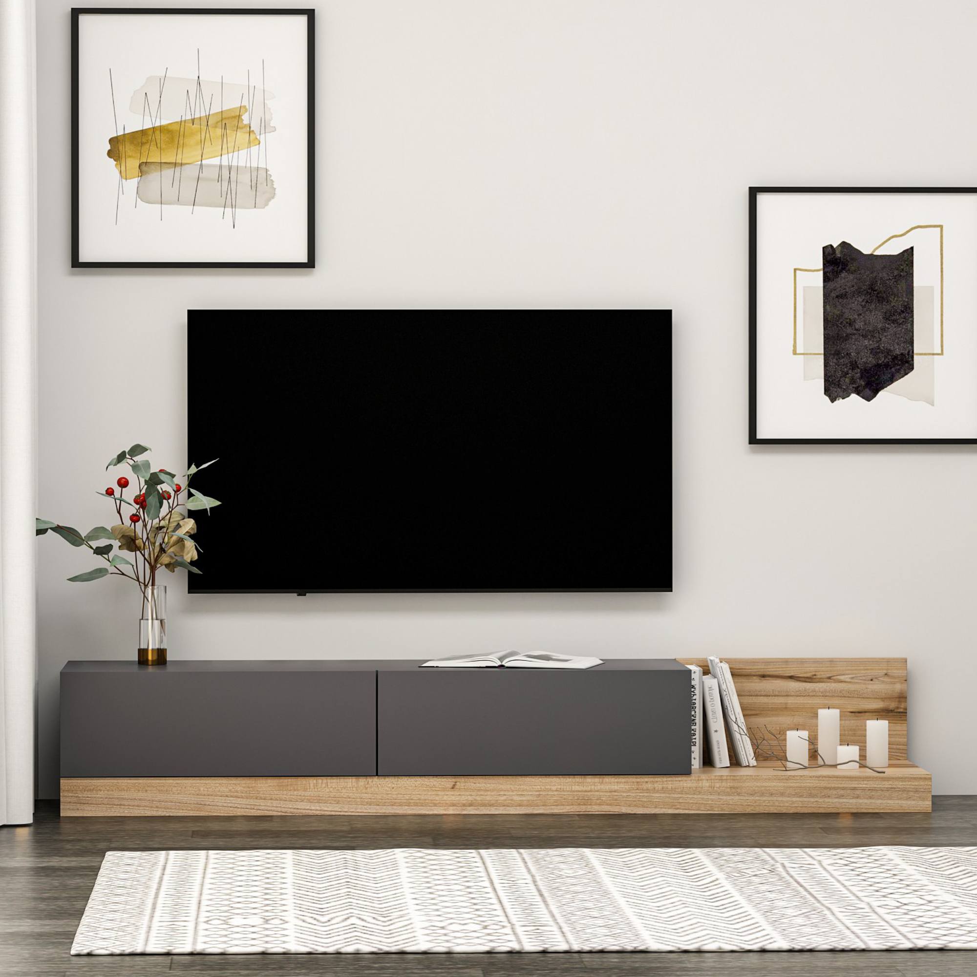 Disponuje 2 výklopnými dvířky, která odkrývají 2 oddělené úložné prostory. Ty vytvářejí dostatek místa pro odložení všeho, co potřebujete mít po ruce. Pravá strana nabízí prostor pro umístění ovladačů, knih či dekorací. Provedení bez úchytek a nohou podtrhuje její jednoduchý vzhled.